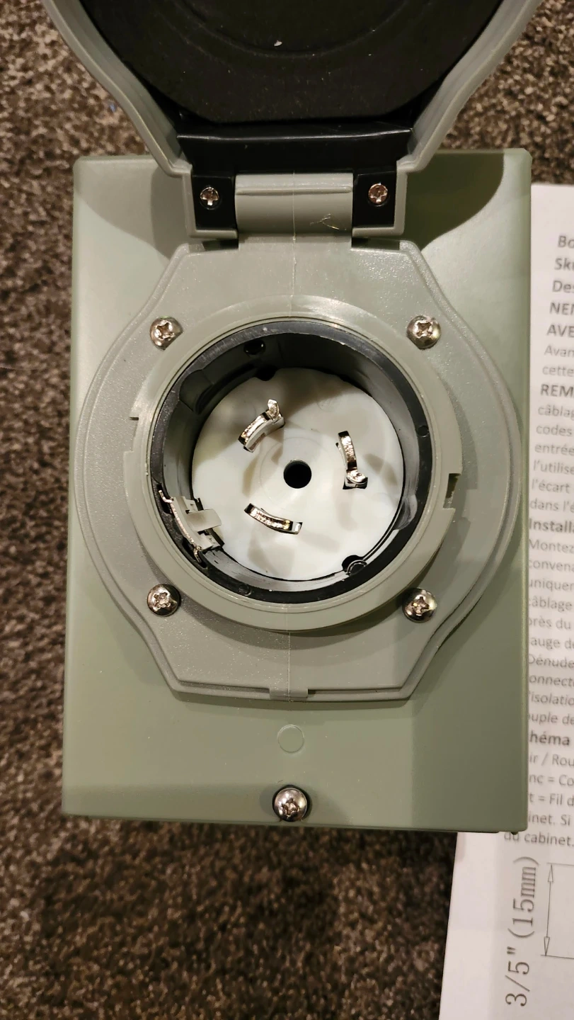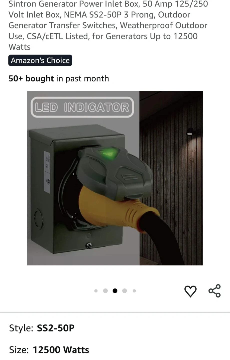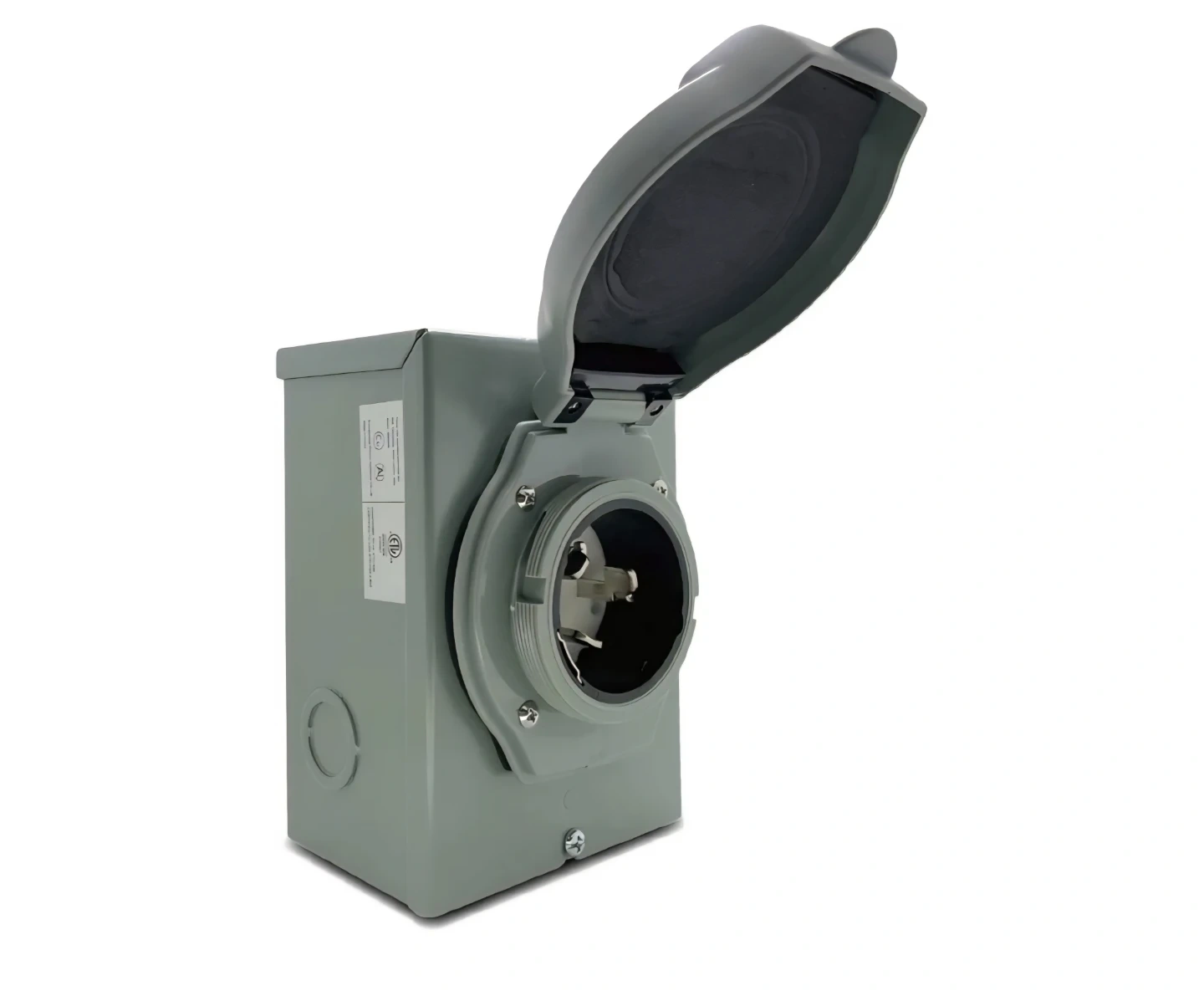 Selling a Sintron Generator Power Inlet Box, model SS2-50P. This is a 50 Amp 125/250 Volt inlet box. It's NEMA SS2-50P 3 Prong, suitable for outdoor generator transfer switches. It's weatherproof and CSA/cETL Listed, designed for generators up to 12500 Watts.