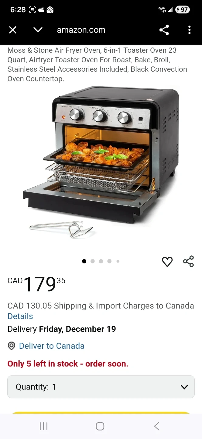 Selling a Moss & Stone 6-in-1 air fryer toaster oven. It's a 23 quart airfryer toaster oven perfect for roasting, baking, broiling, and more. The original price was $179.35.