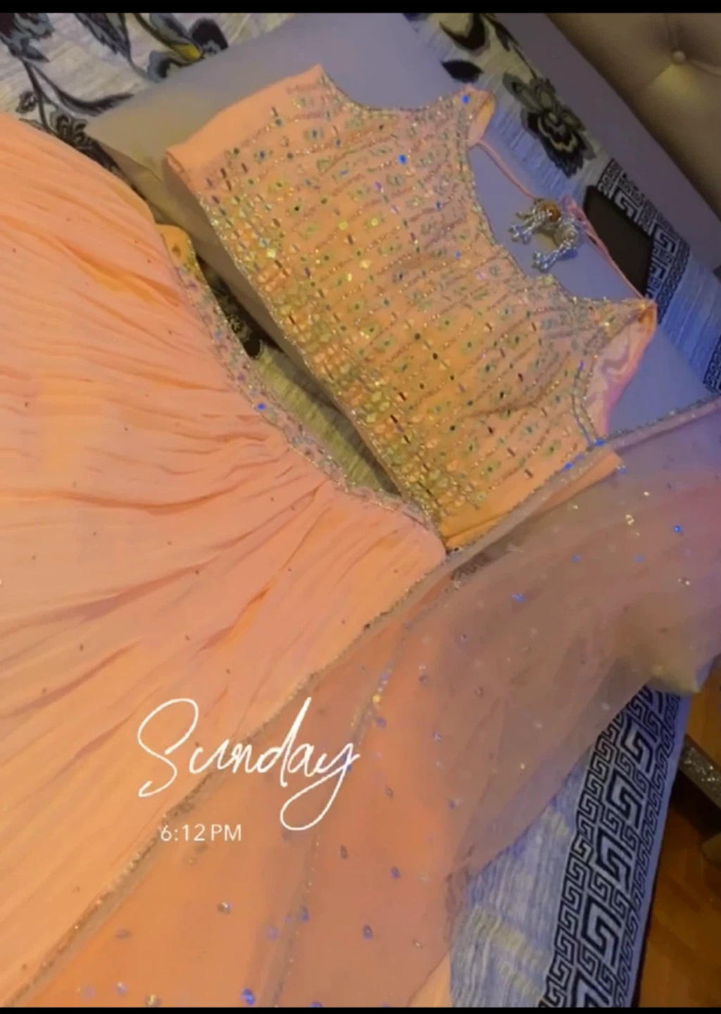 Selling a beautiful peach-coloured lehenga choli set! The top is intricately designed with embellishments, and the skirt has a lovely flowing shape. Perfect for a special occasion or celebration!