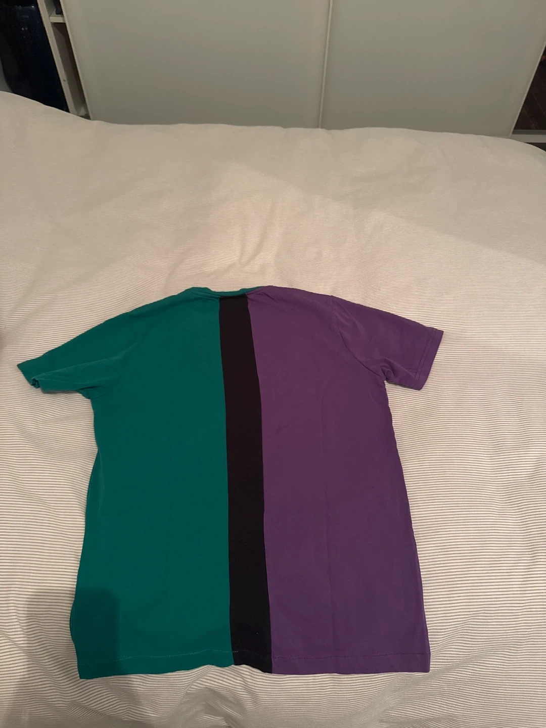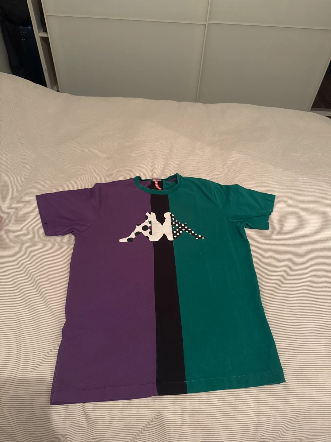 Selling a Kappa colour block t-shirt, featuring a unique design with purple, green, and black. This stylish tee is perfect for adding a pop of colour to your wardrobe!