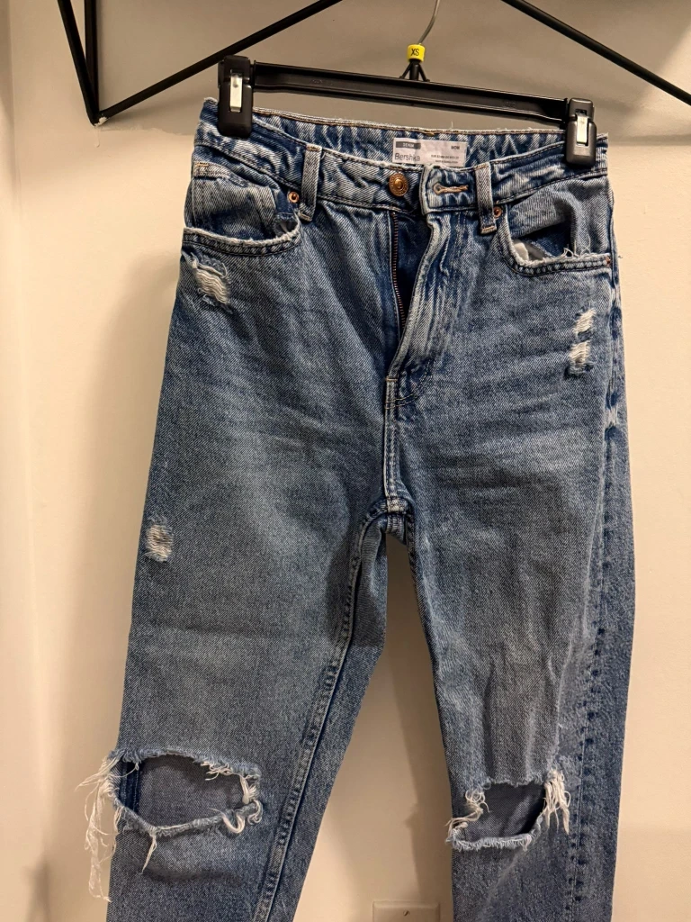 Selling a pair of Bershka Mom jeans in size XS! They're in good condition and have a stylish, distressed look with ripped knees. Perfect for a casual outfit.