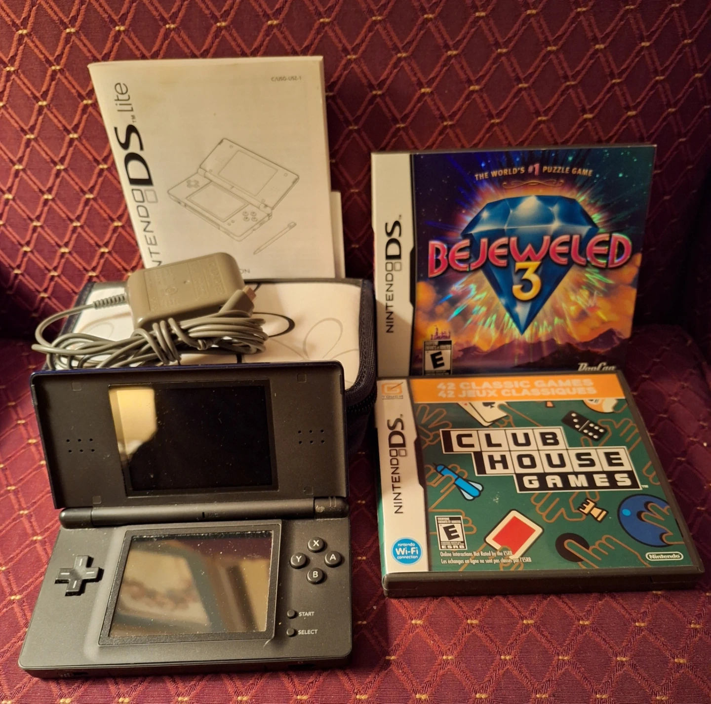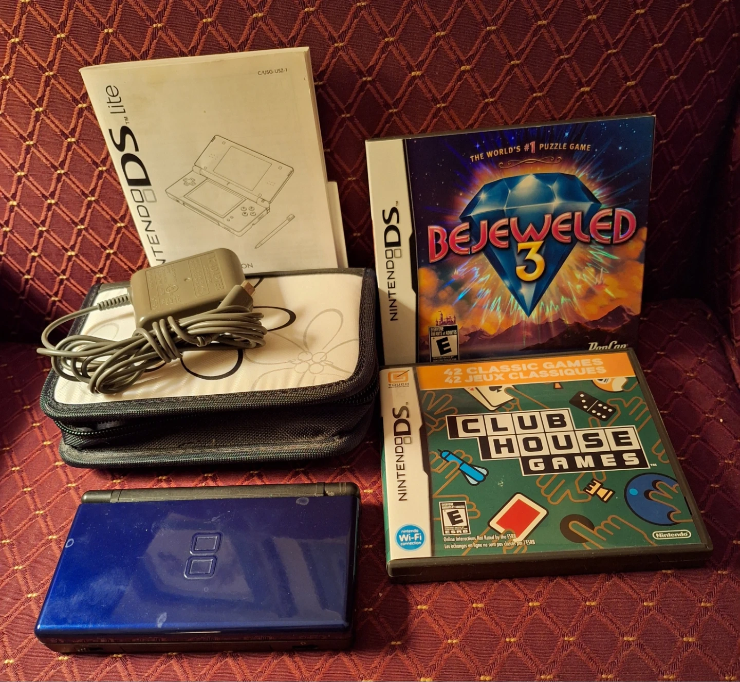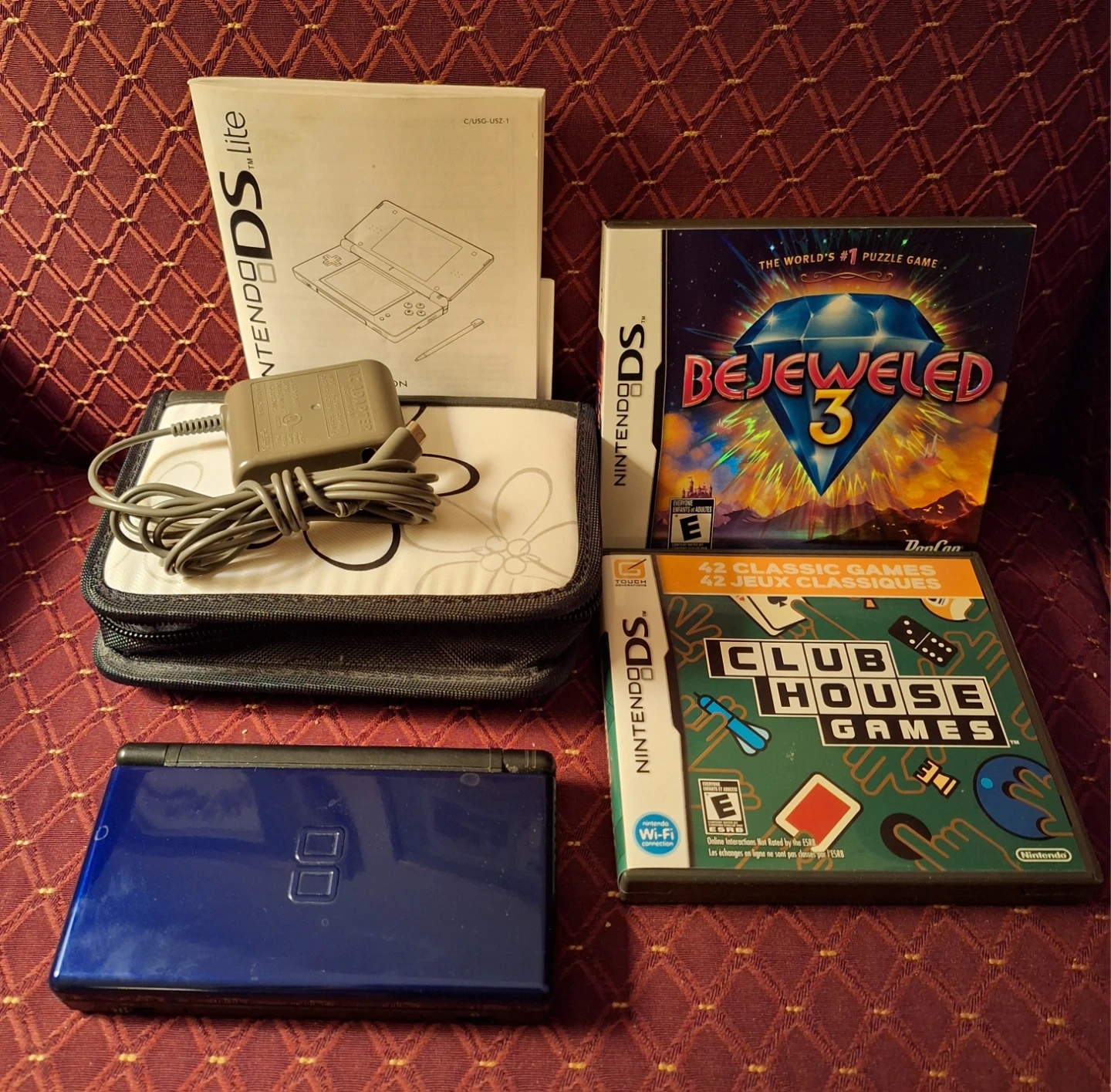 Nintendo DS Lite blue colour. Comes with two games: Bejeweled 3 and Clubhouse Games. Includes charger, a carrying case and instruction manual. Pickup Scarborough Pharmacy and Ellesmere area.