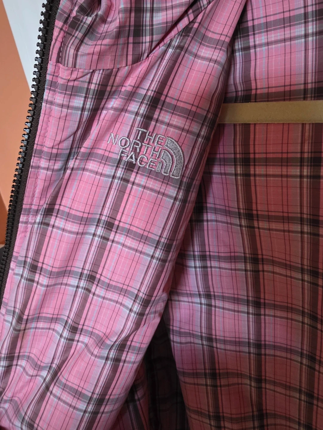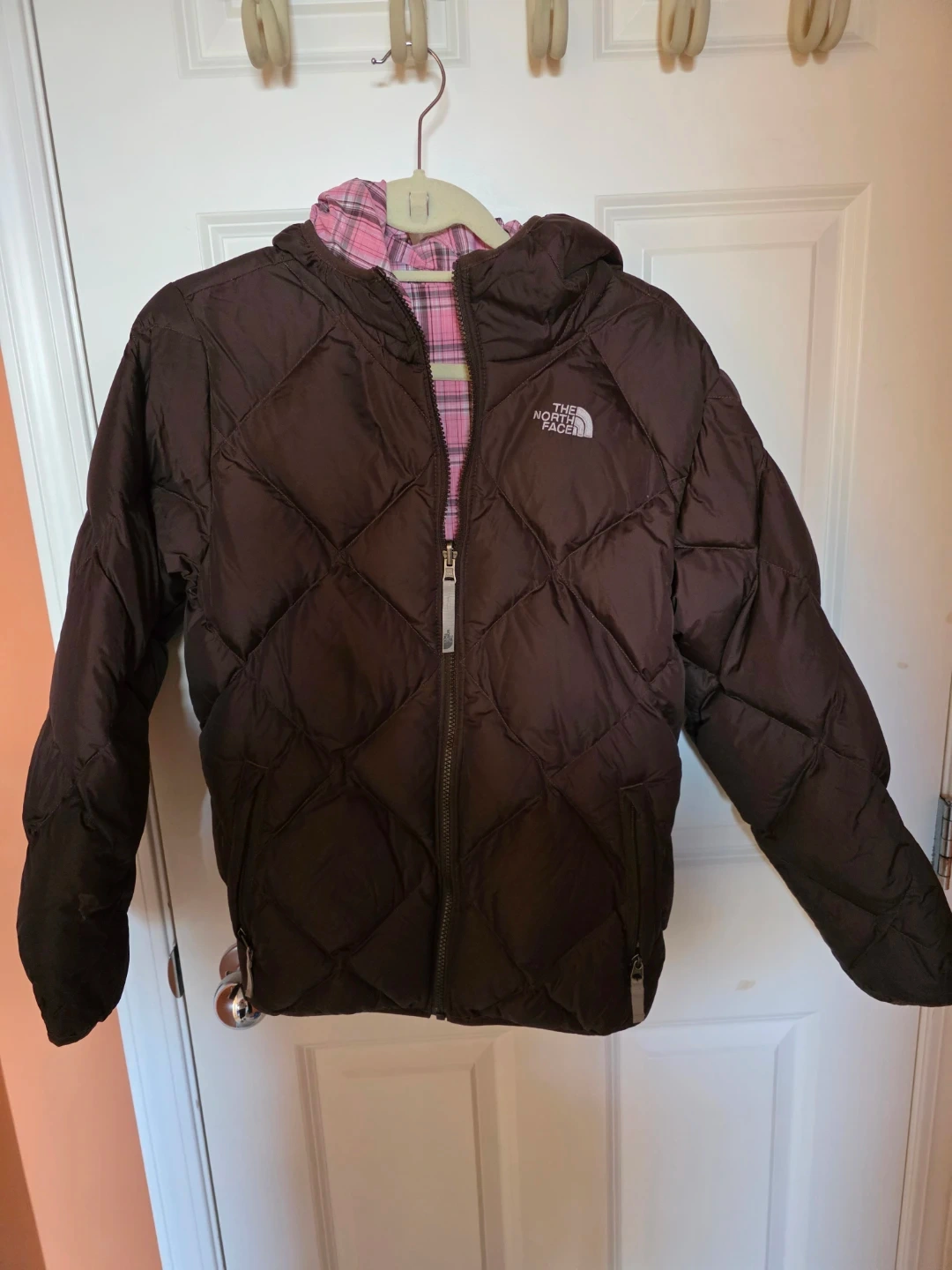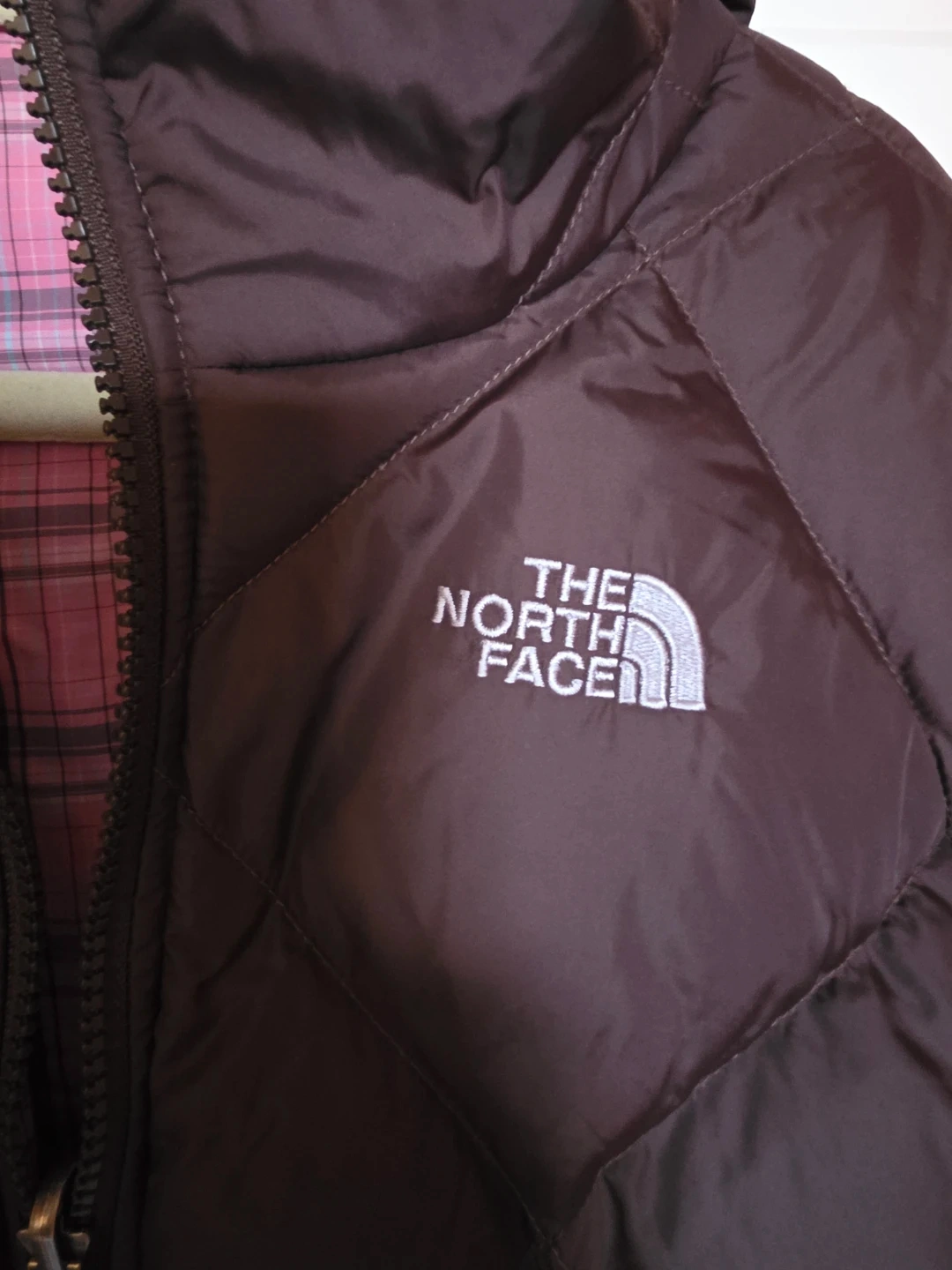 This is a The North Face puffer jacket in a nice brown colour. It has a pink plaid reversible. Perfect for staying warm and stylish!