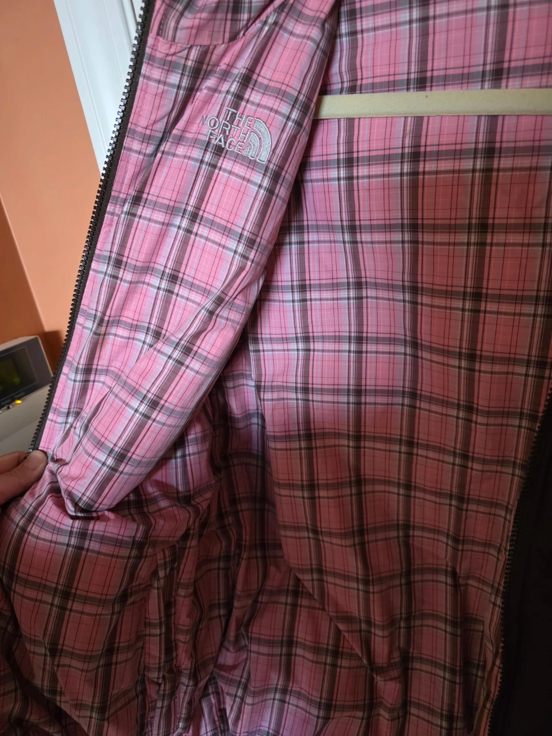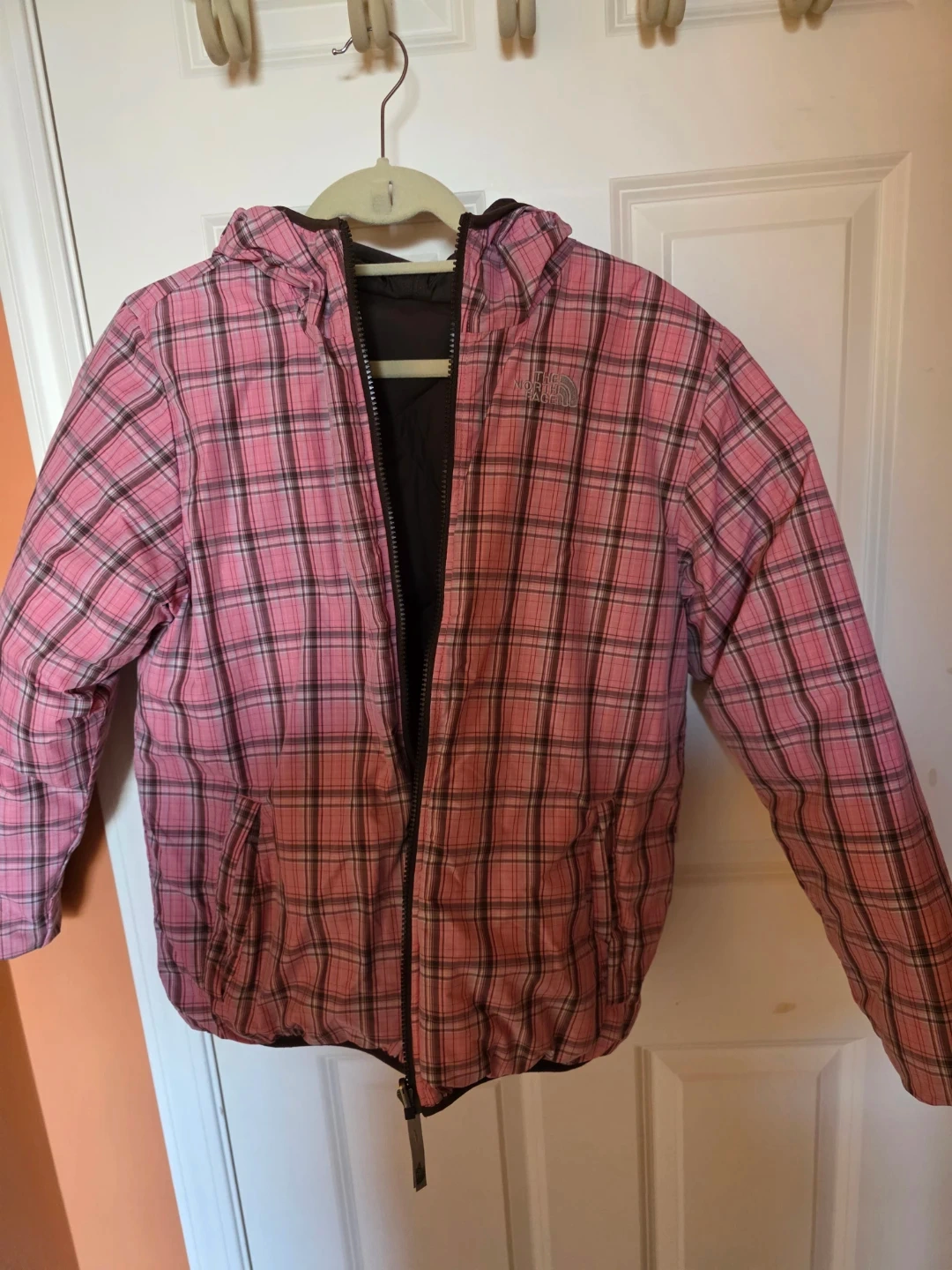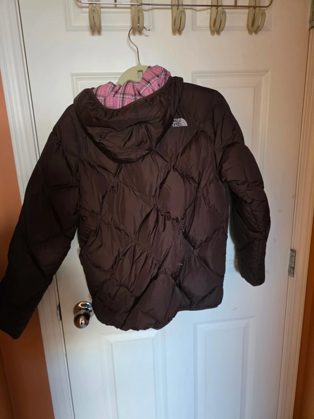 This is a The North Face puffer jacket in a nice brown colour. It has a pink plaid reversible. Perfect for staying warm and stylish!