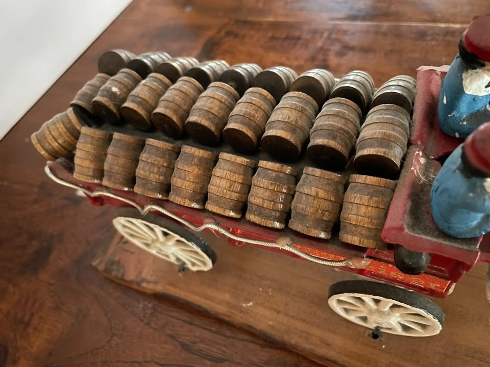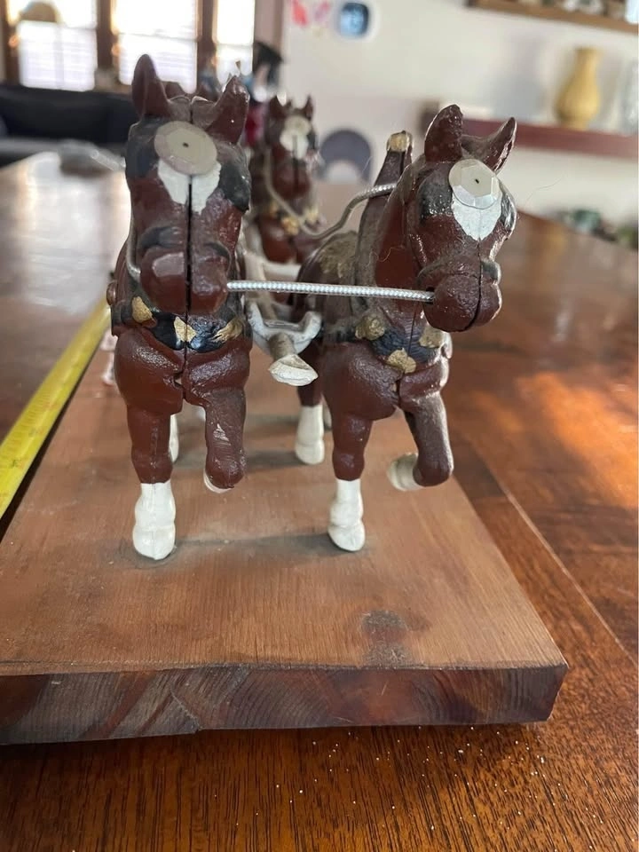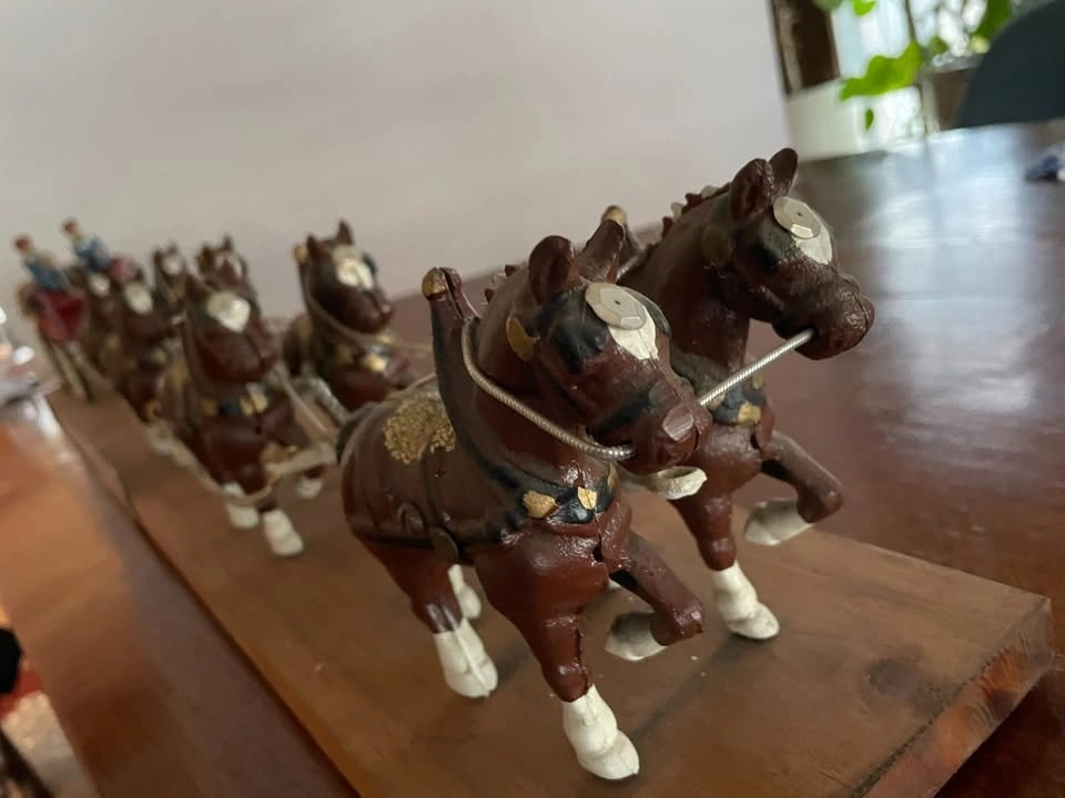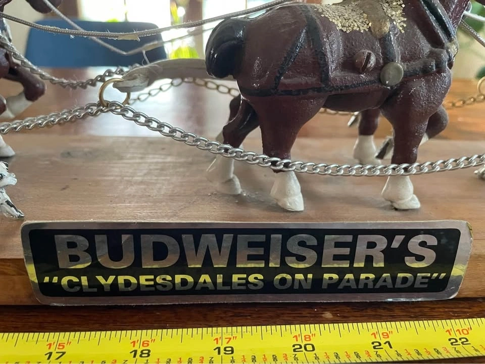 Extremely detailed Budweiser Horse & Wagon display, 38" x 5x5". 8 horses, 3 plastic dogs, 27 barrels. Also comes with "Clydesdale On Parade" and other commercial signage. In Excellent solid shape and well preserved. Ready for the mantel or window sill.