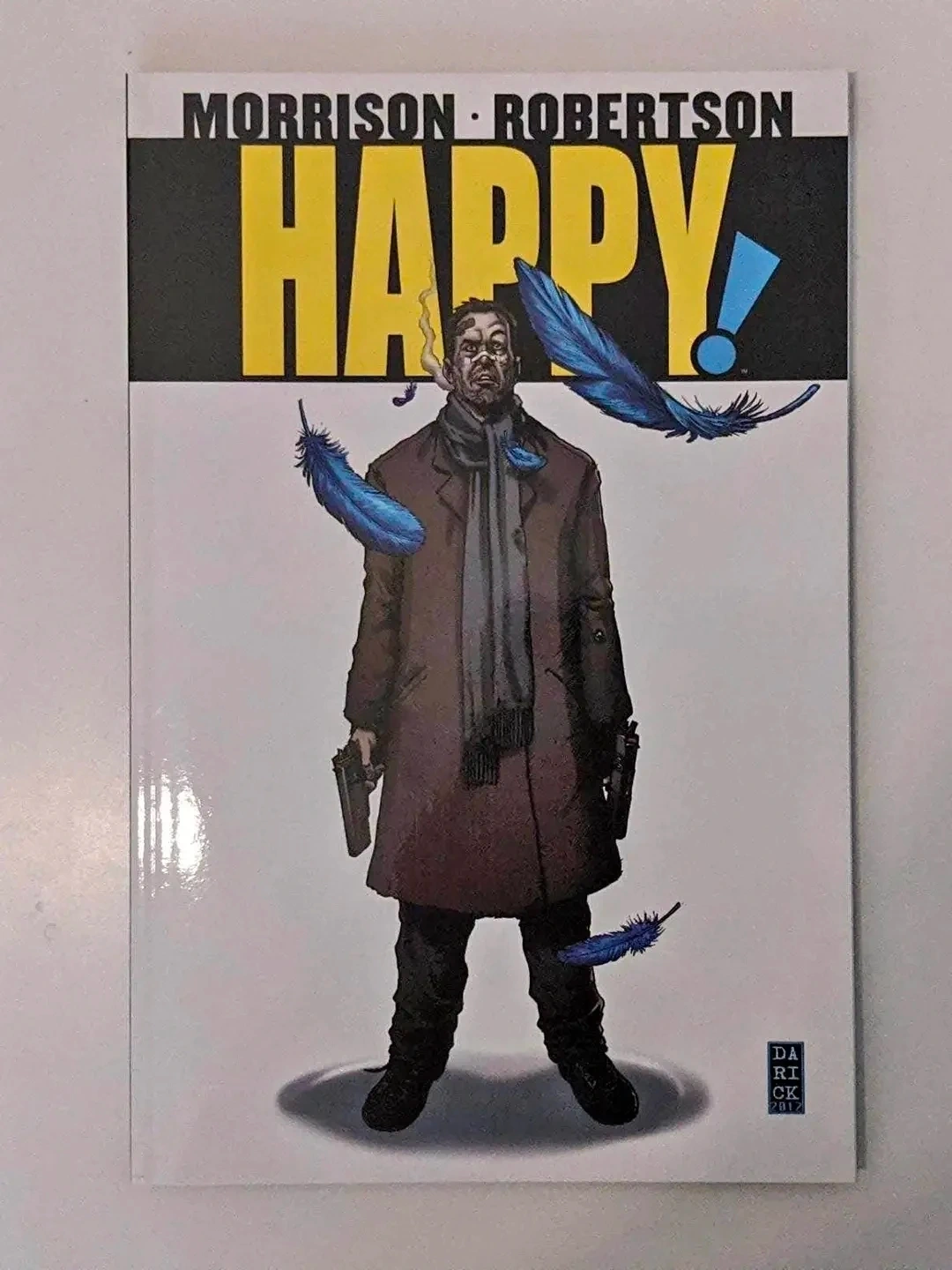 "Meet Nick Sax, a corrupt, intoxicated ex-cop turned hit-man, adrift in a stinking twilight world of casual murder, soulless sex, eczema, and betrayal. With a hit gone wrong, a bullet in his side, the cops and the mob on his tail, and a monstrous child killer in a Santa suit on the loose, Nick and his world will be changed forever this Christmas — by a tiny blue horse called Happy!"