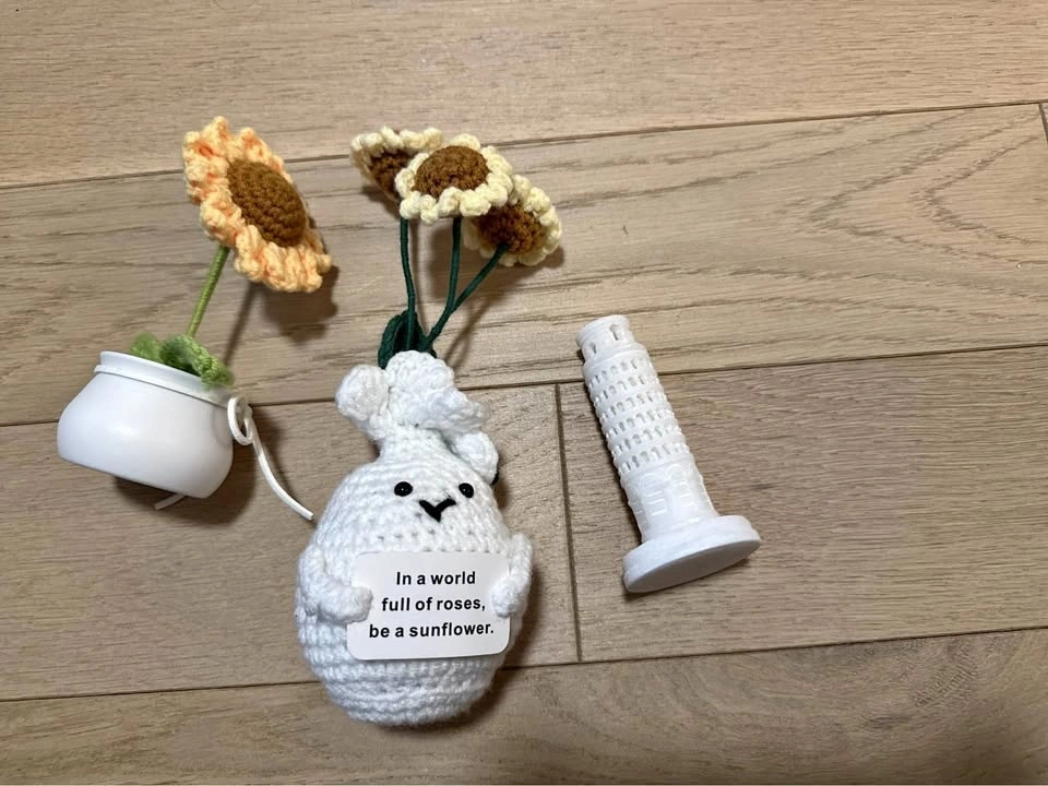 • Features: A single crocheted sunflower seated in a tiny white mini pot, offering a fresh, cute touch.