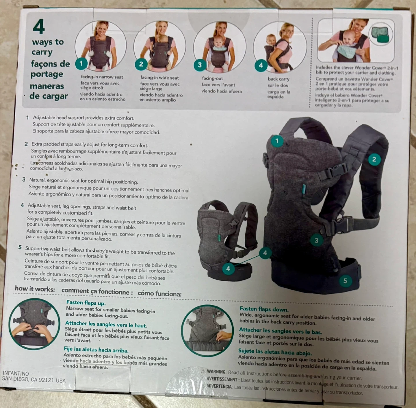 - 4 ways to carry: facing-in narrow seat, facing-in wide seat, facing-out, and back carry