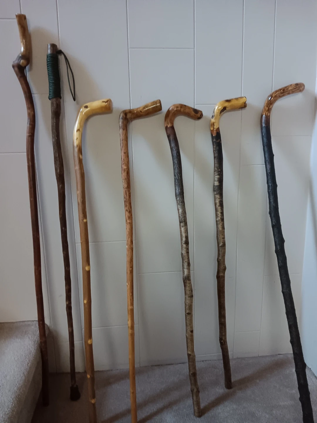I have several handcrafted wooden walking sticks available. Each one is unique, with natural wood grain and a comfortable handle. Perfect for hiking or just a stroll around the neighbourhood!