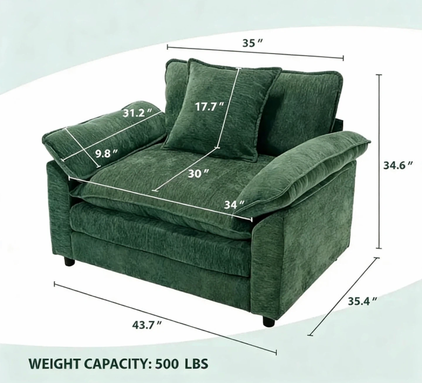 Selling a comfy green armchair sofa! It measures approximately 35 inches wide and 43.7 inches long. It also has a weight capacity of 500 lbs. Perfect for a cozy reading nook or small living space!