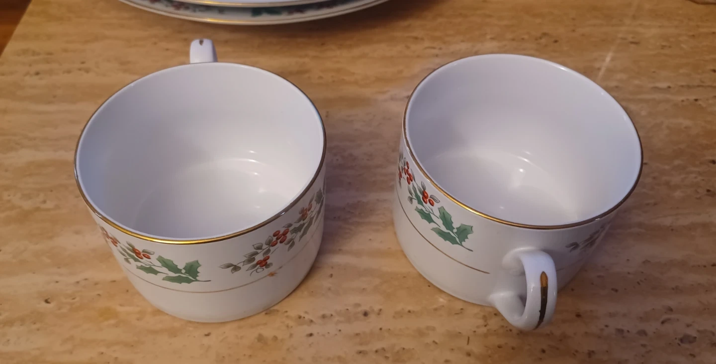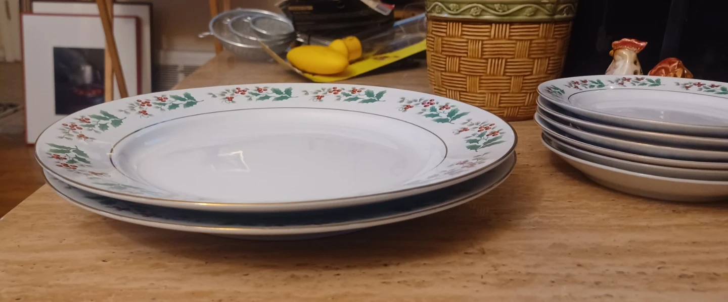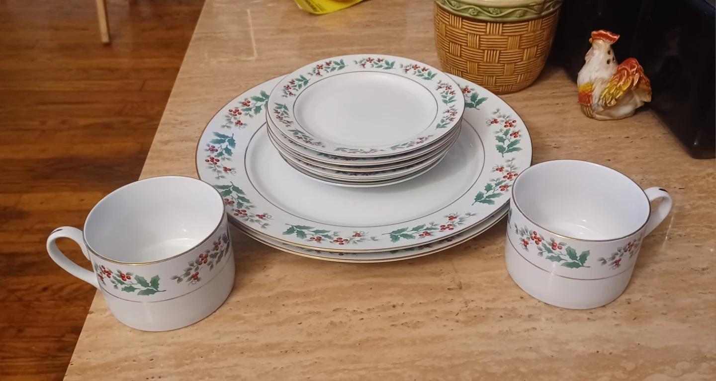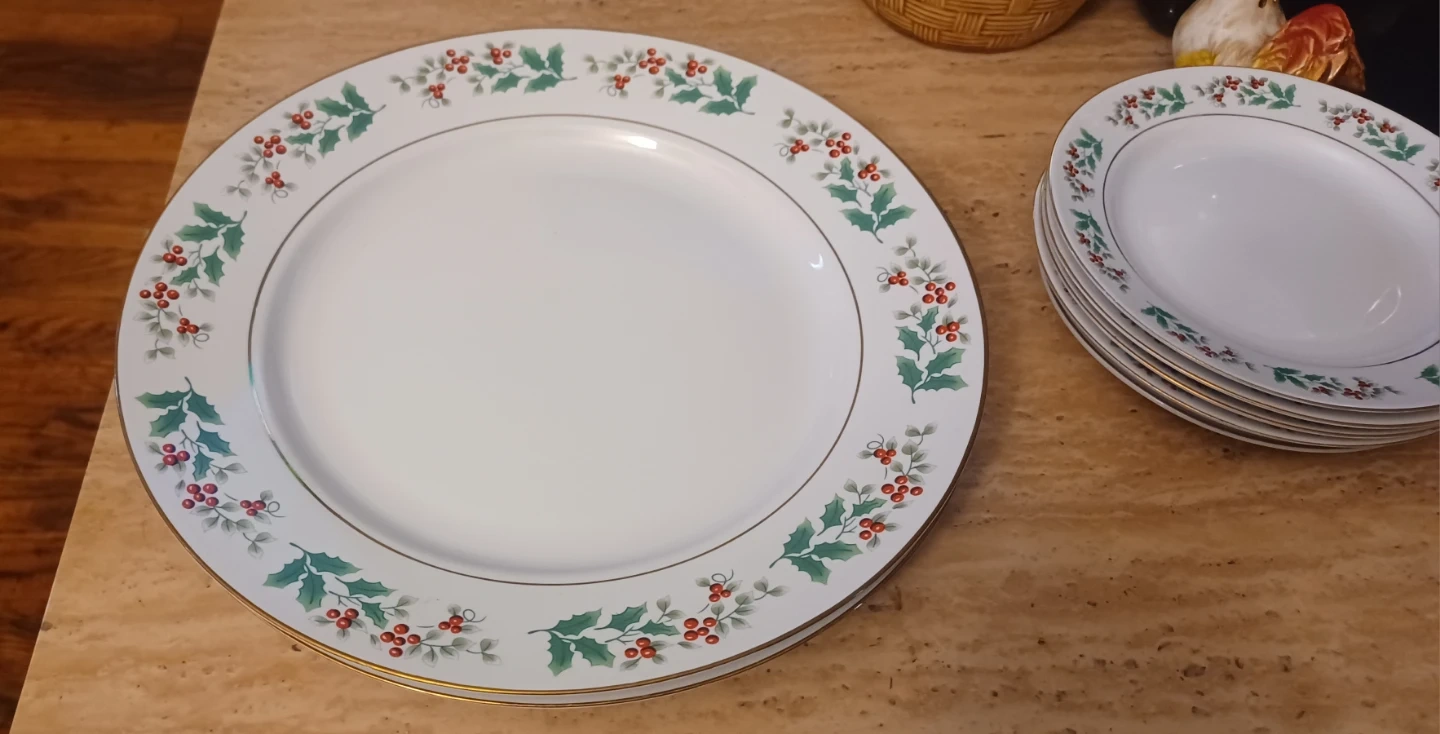 Selling a gibson china set featuring a festive holly design. This set includes plates and cups, perfect for adding a touch of holiday cheer to your table setting