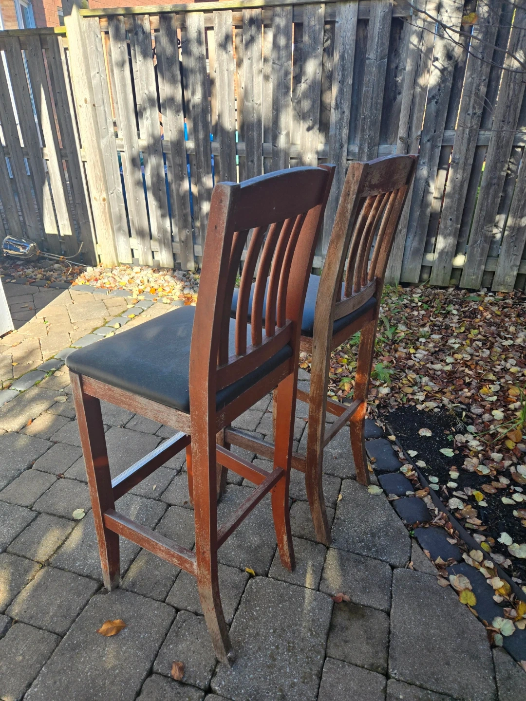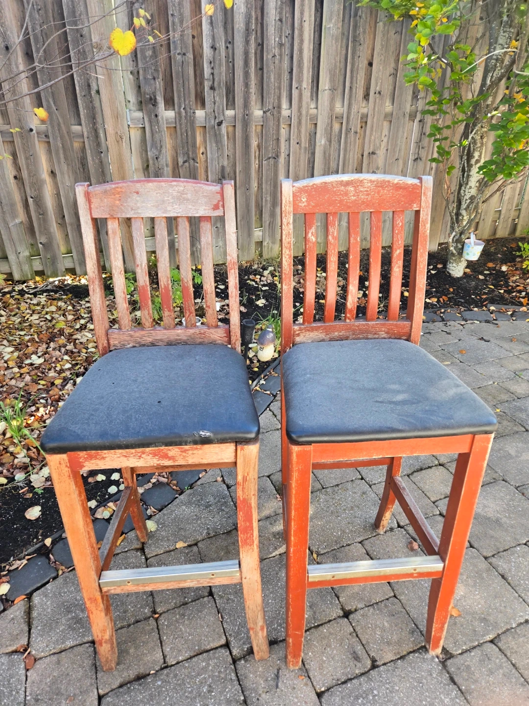Selling a pair of wooden bar stools. They have a red-orange finish and black padded seats. They show some signs of wear, as pictured, but are still sturdy and functional. Perfect for a kitchen island or bar area!