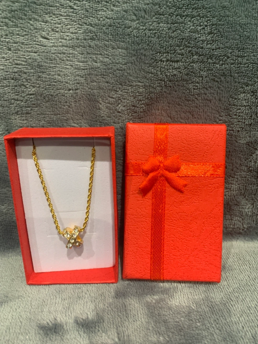 Selling a brand new 925 based gold-tone necklace featuring a rhinestone-studded pendant. It comes in its original red gift box, perfect for gifting or treating yourself!