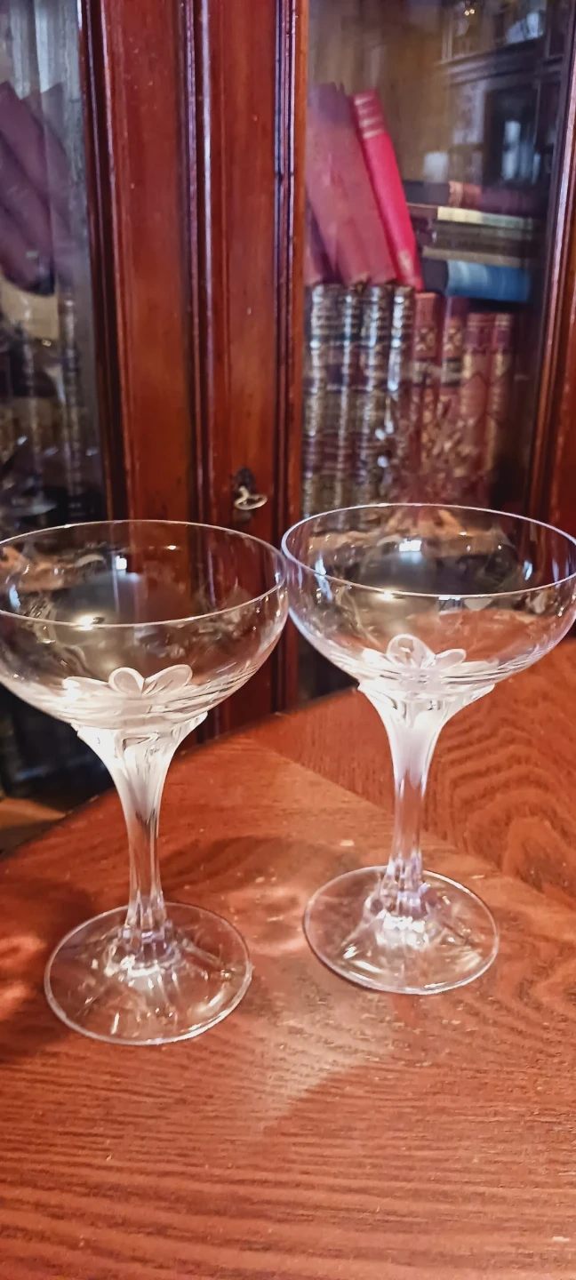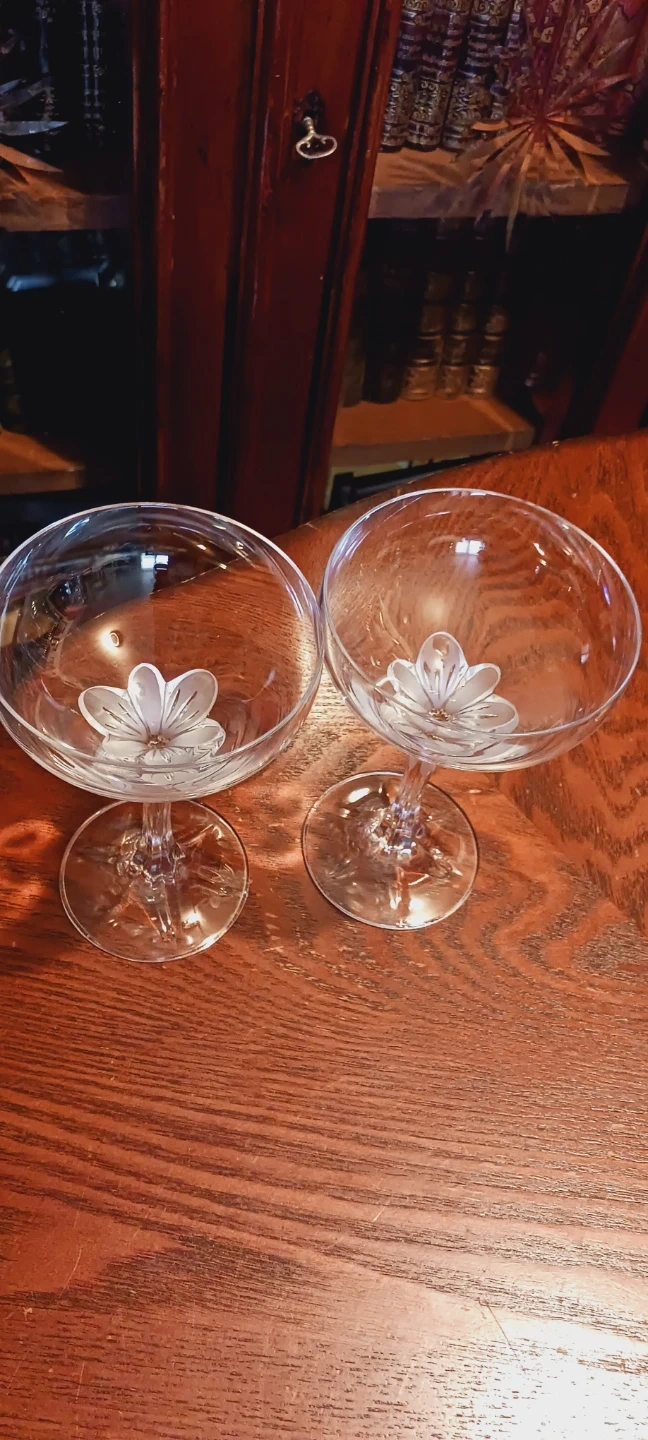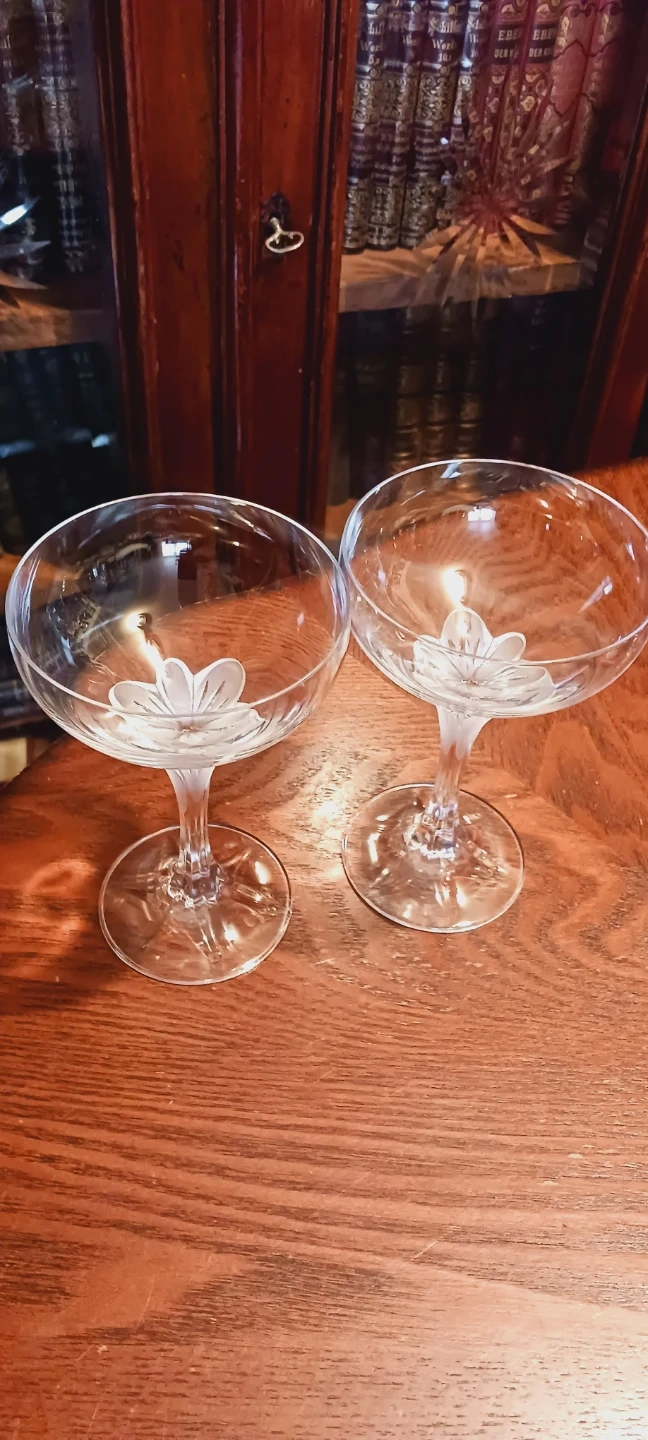 NEW !! Selling a Pair of Absolutely Gorgeous 馃嵕 Champagne 馃嵕 Frosted Crystal Flowers Open Stem Coupe Glasses. They feature a delicate Frosted Crystal flower design on the stem. Perfect for adding a touch of elegance to your celebrations !!! New, Mint condition!! 6"脳4". ALL MY PRICES ARE NEGOTIABLE !!!