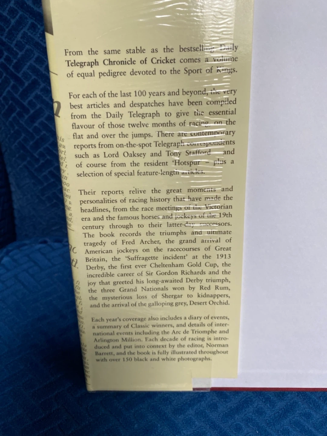 Selling The Daily Telegraph Chronicle of Horse Racing, edited by Norman Barrett. This book compiles articles and despatches from The Daily Telegraph, offering a flavour of twelve months of racing on the flat and over the jumps. Includes contemporary reports from on-the-spot Telegraph correspondents and a selection of special feature-length articles. Book records the triumphs and ultimate tragedy of Fred Archer, the grand arrival of American jockeys on the racecourses of Great Britain, the 'Suffragette incident' at the 1913 Derby, the first ever Cheltenham Gold Cup, the incredible career of Sir Gordon Richards and the joy that greeted his long-awaited Derby triumph, the three Grand Nationals won by Red Rum, the mysterious loss of Shergar to kidnappers, and the arrival of the galloping grey, Desert Orchid. Each year's coverage also includes a diary of events, a summary of Classic winners, and details of inter-national events including the Arc de Triomphe and Arlington Million. Each decade of racing is intro-duced put into context by the editor, Norman Barrett, and the book is fully illustrated throughout with over 150 black and white photographs