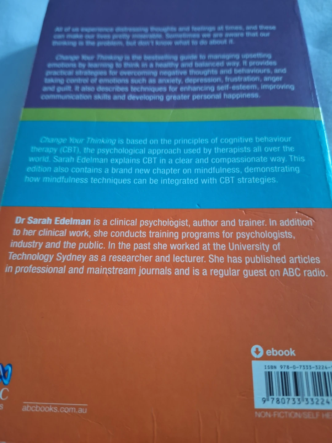 🧡 'Change Your Thinking' by Sarah Edelman, a helpful guide based on cognitive behaviour therapy (CBT). It provides practical techniques for overcoming negative thoughts and behaviours, and taking control of emotions such as anxiety, depression, frustration, anger and guilt. It also describes techniques for enhancing self-esteem, improving communication skills and developing greater personal happiness.