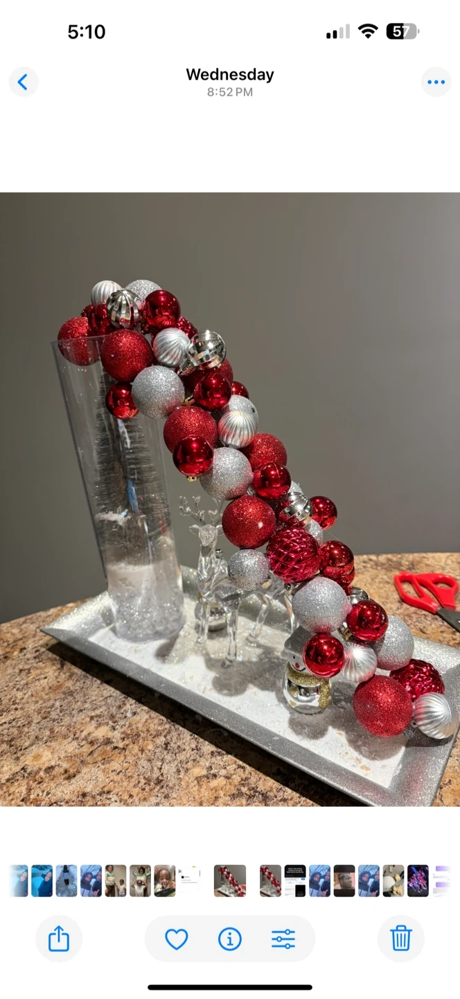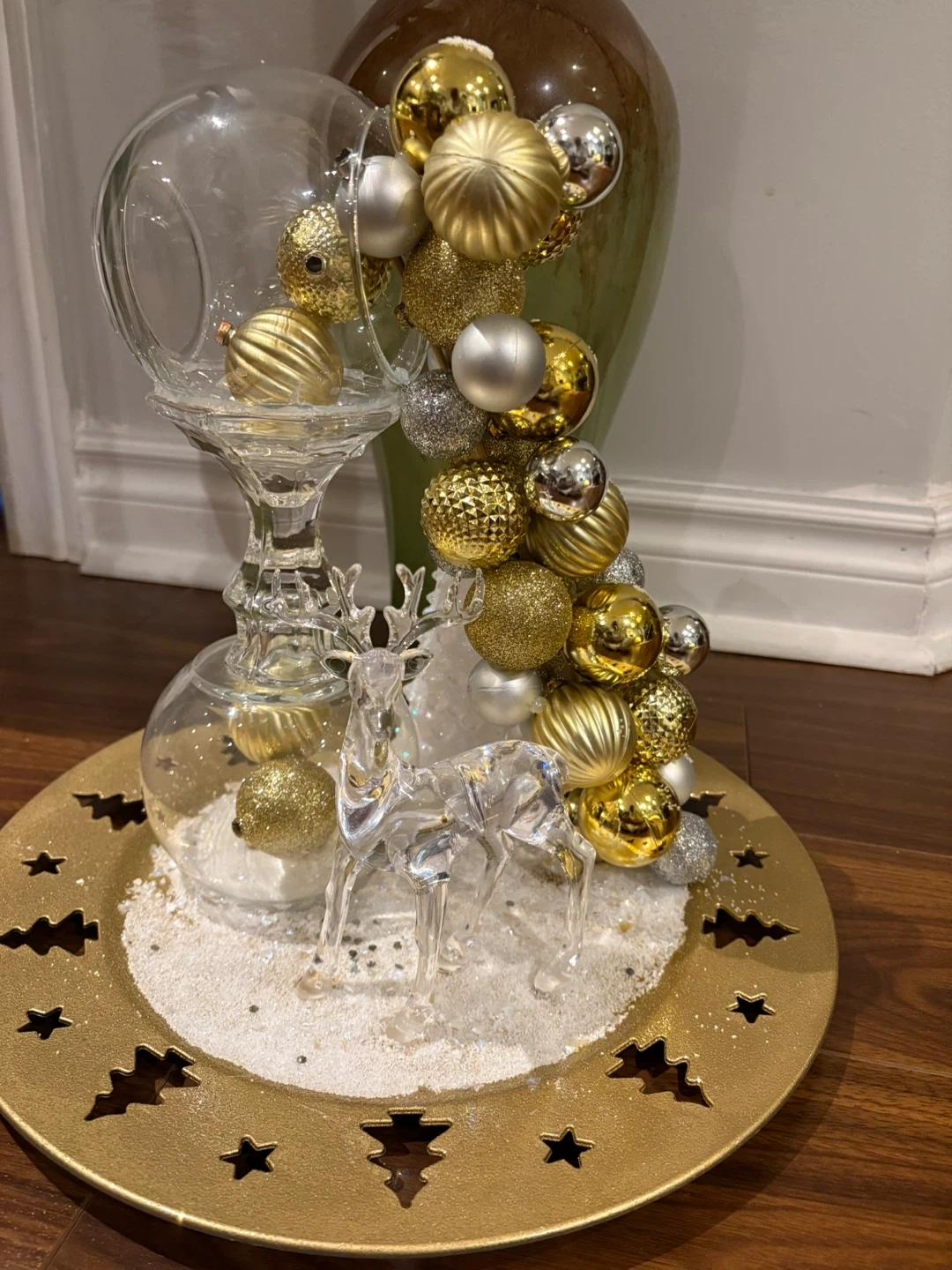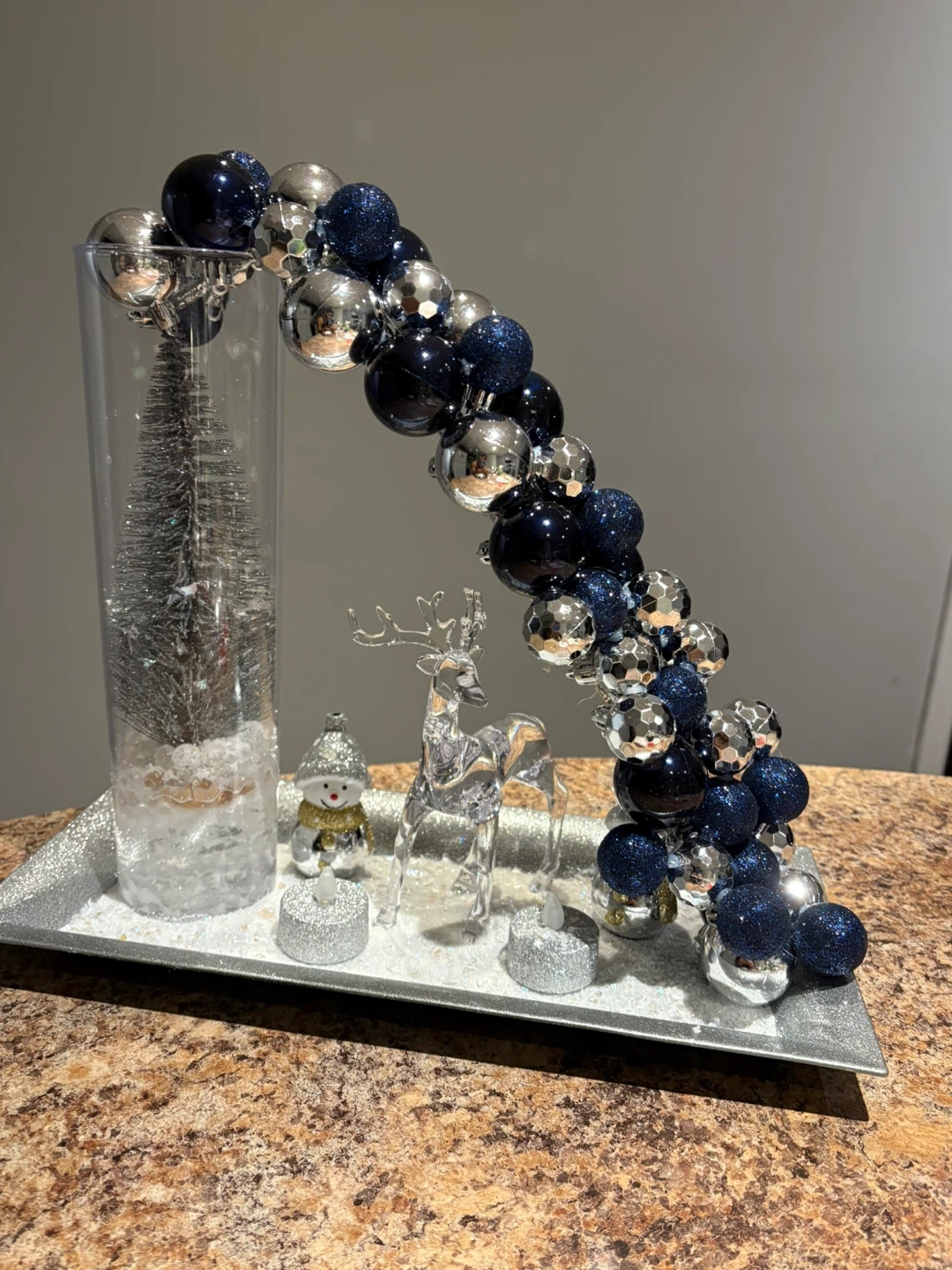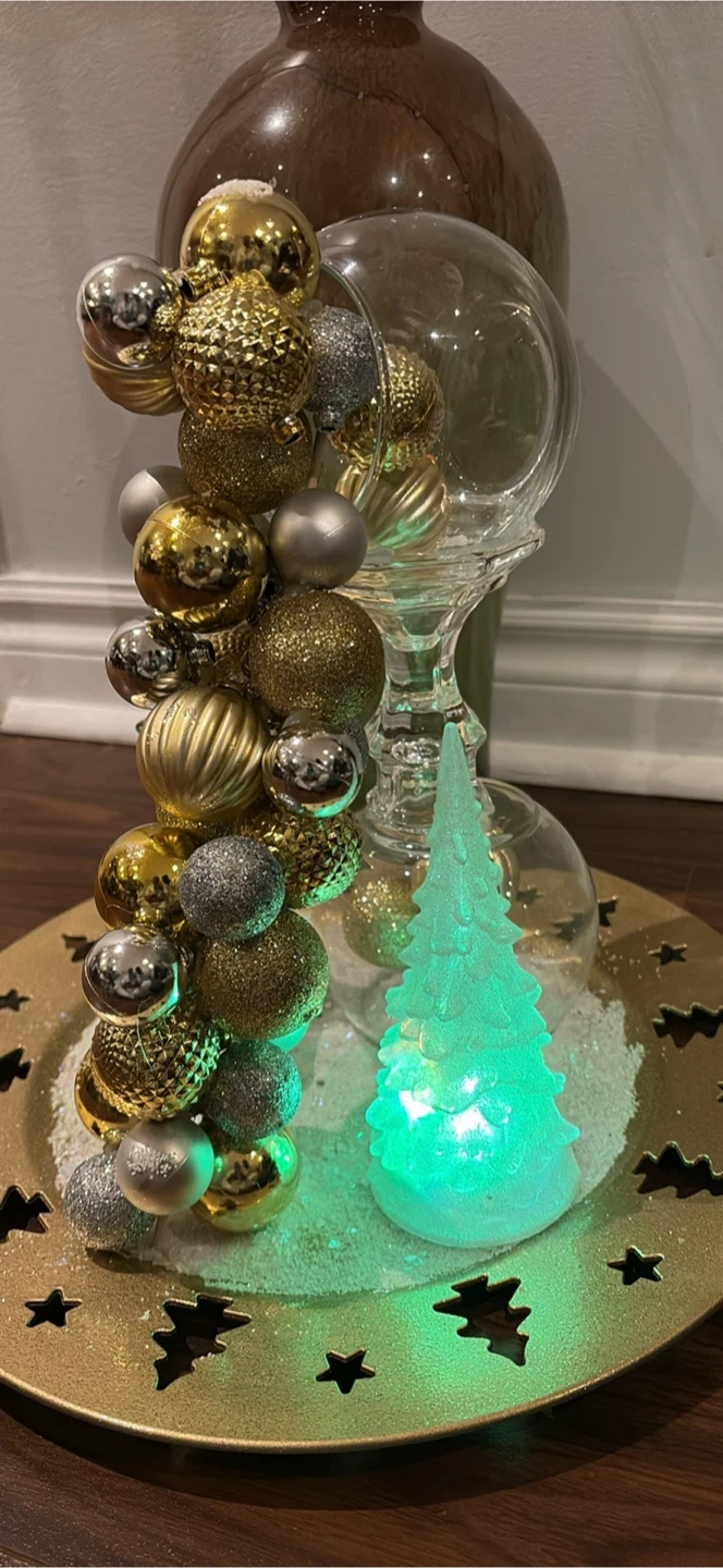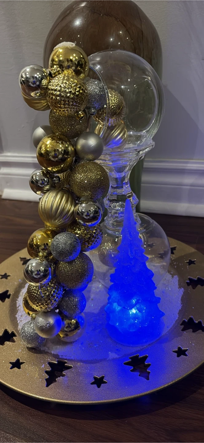 Selling a festive Christmas ornament centerpiece! It features an arrangement of gold, silver, and blue Christmas balls, along with a clear glass vase and a decorative base. Perfect for adding a touch of holiday cheer to your home. Message to order yours