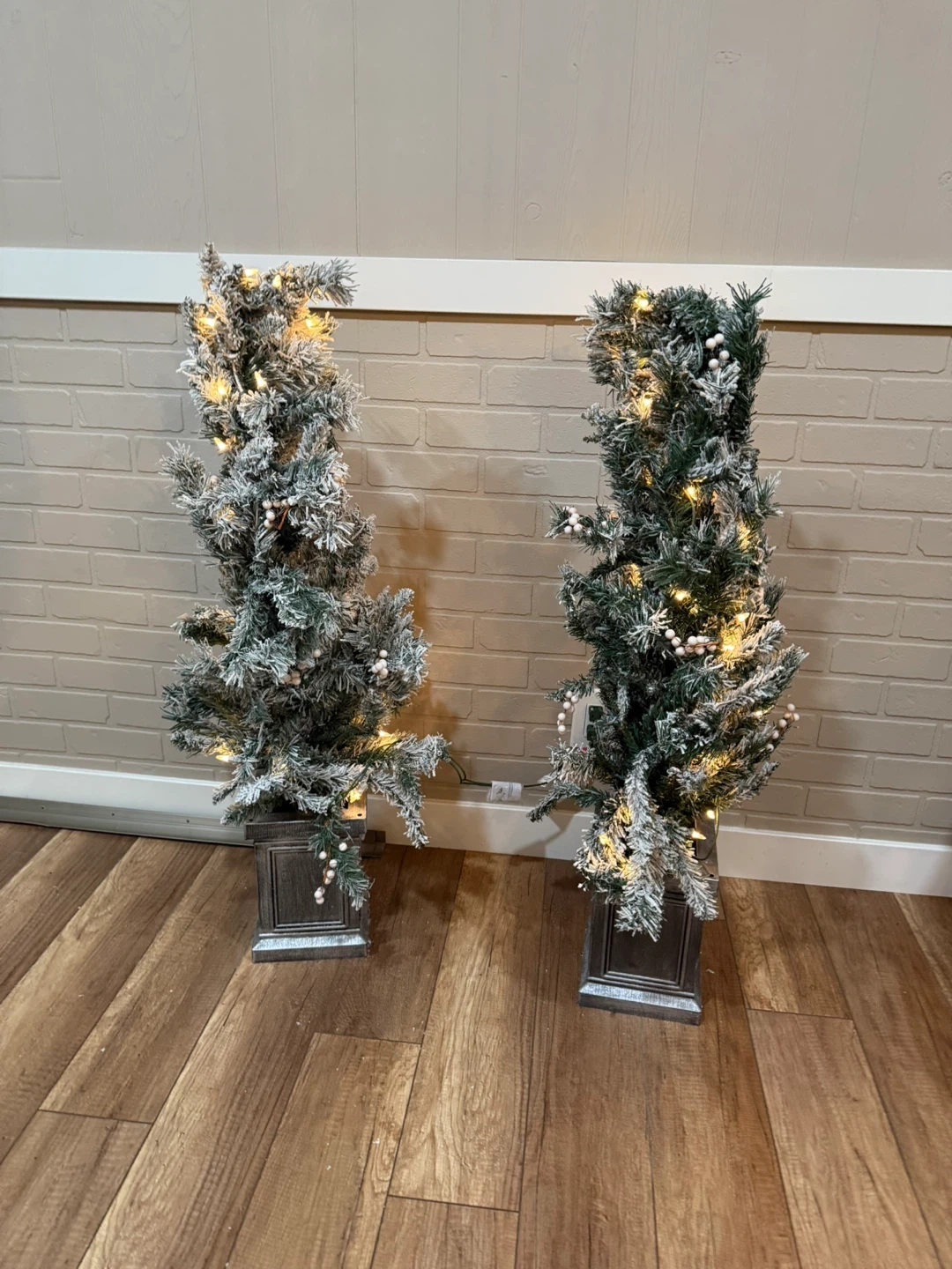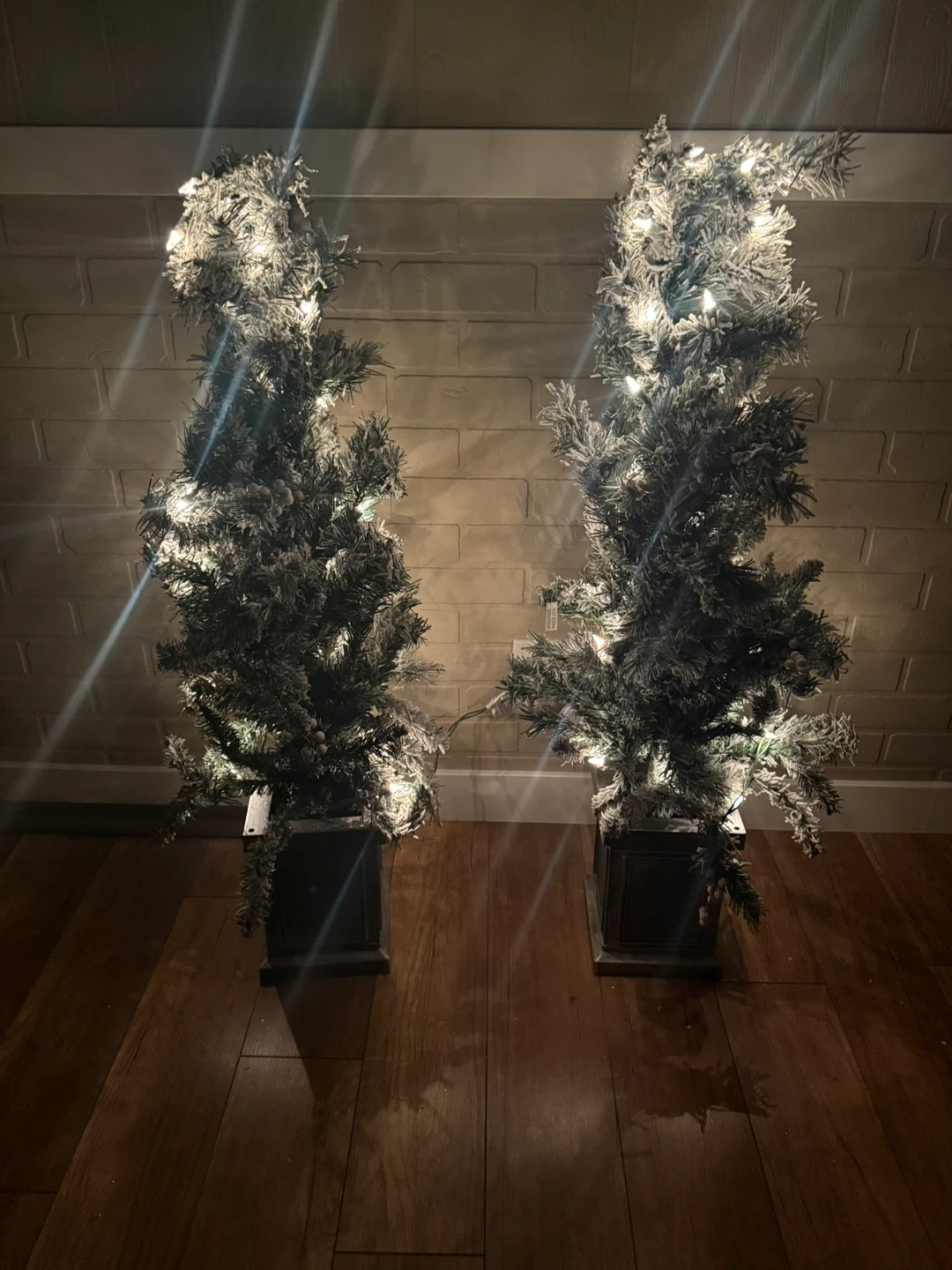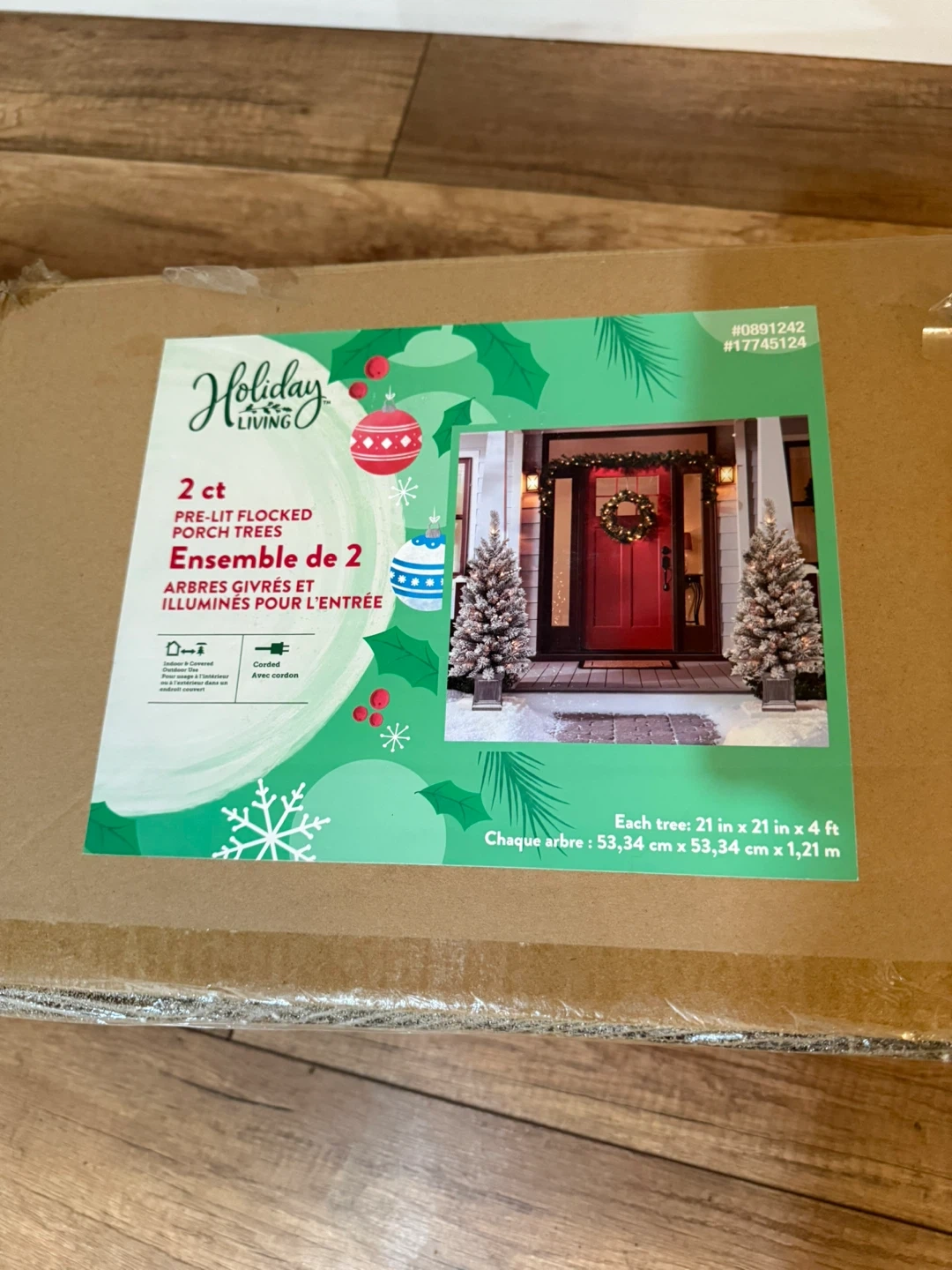 Selling a set of two Holiday Living pre-lit flocked porch trees! They each measure 21 inches x 21 inches x 4 feet. They are in great condition and come in the original box
