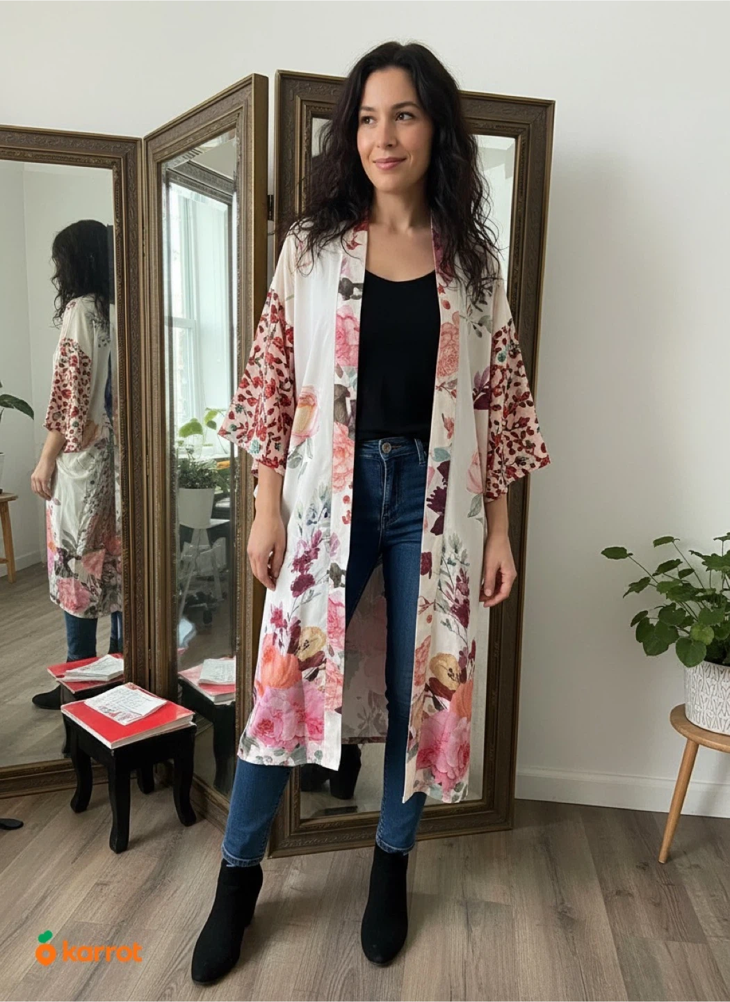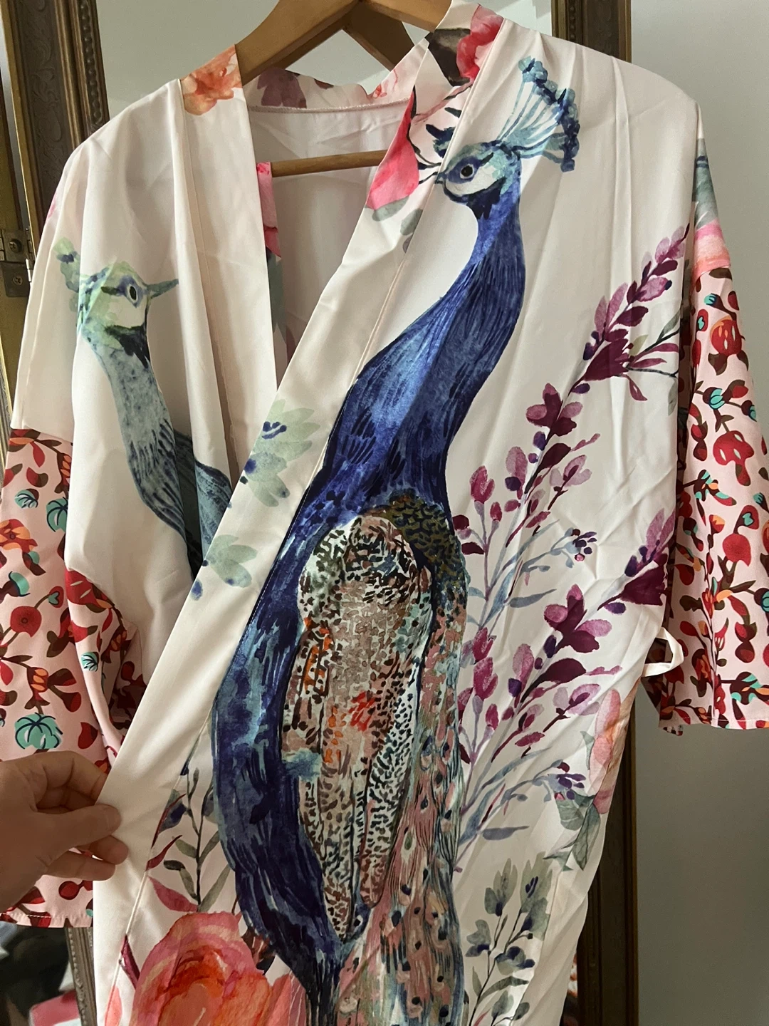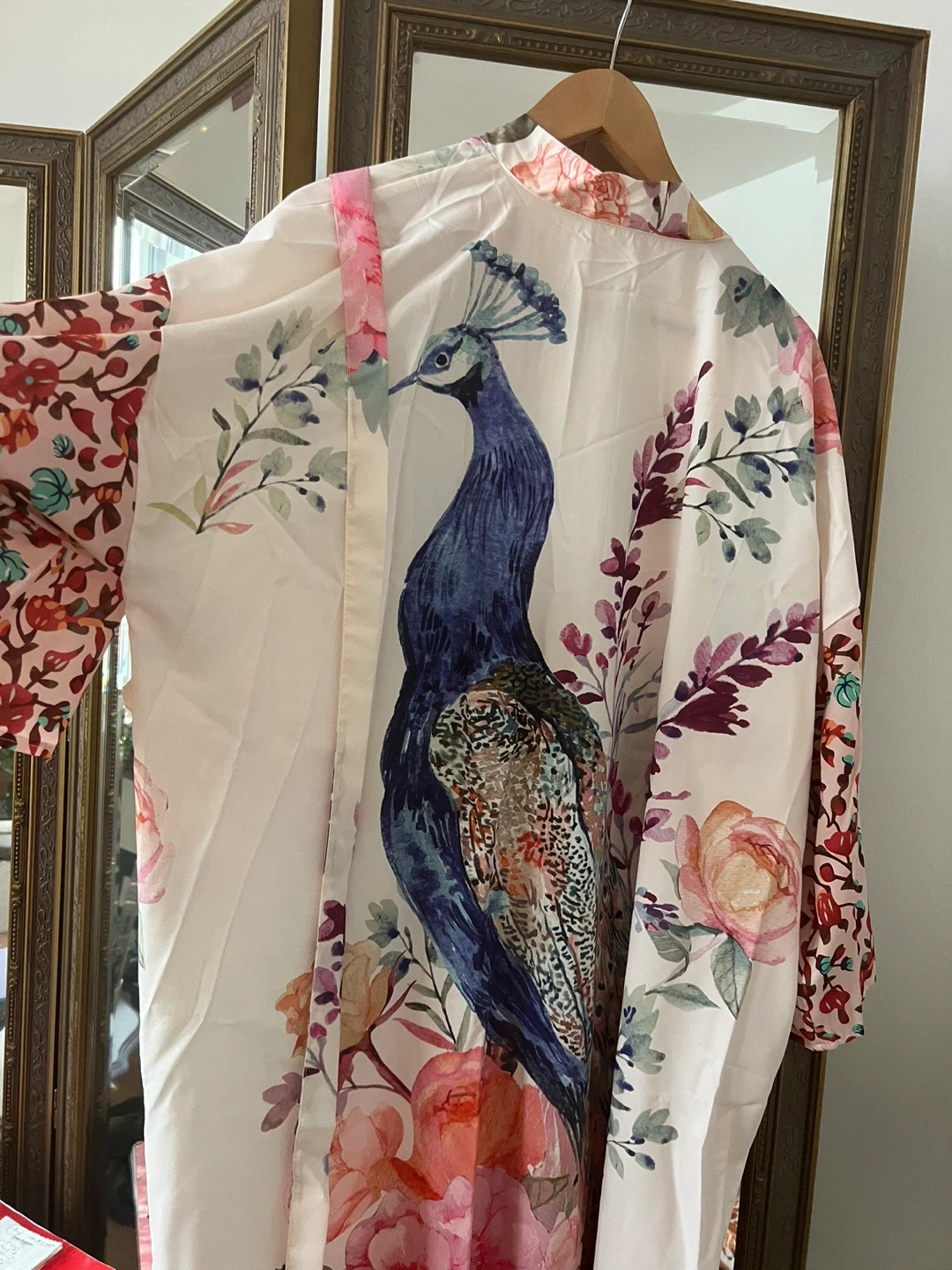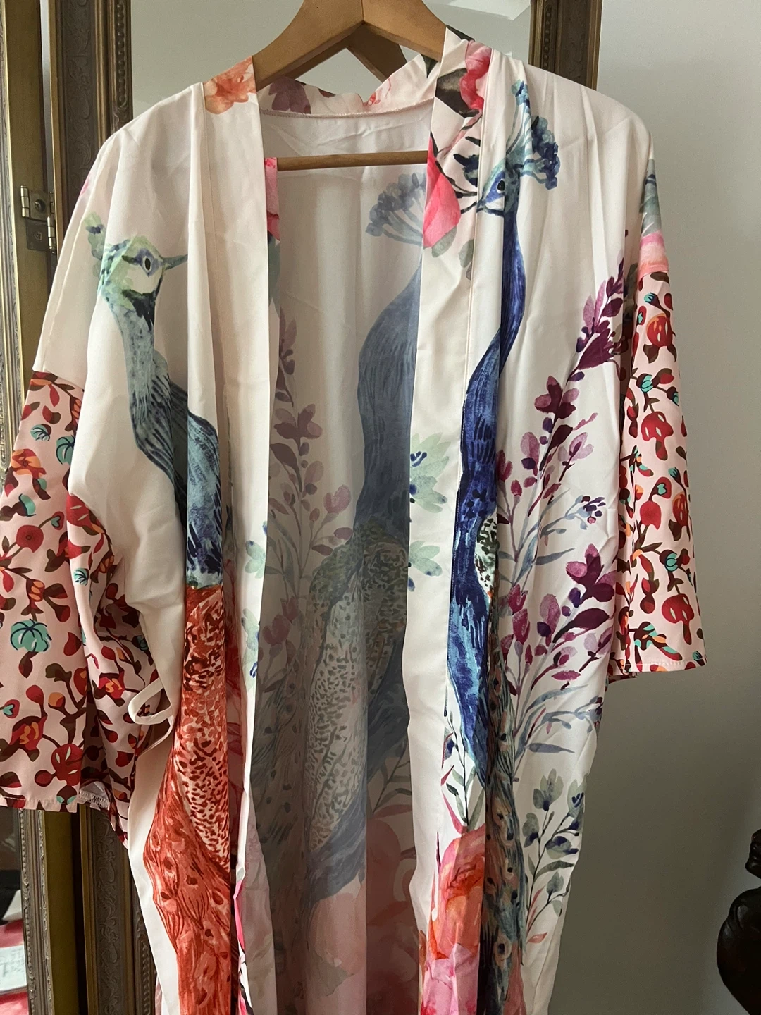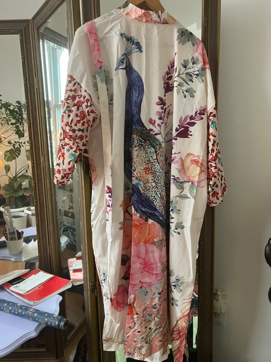 Beautiful kimono with a floral and peacock print! It's in great condition and ready to add a pop of color to your wardrobe. Perfect for lounging around the house or dressing up for a special occasion.Size S-XL