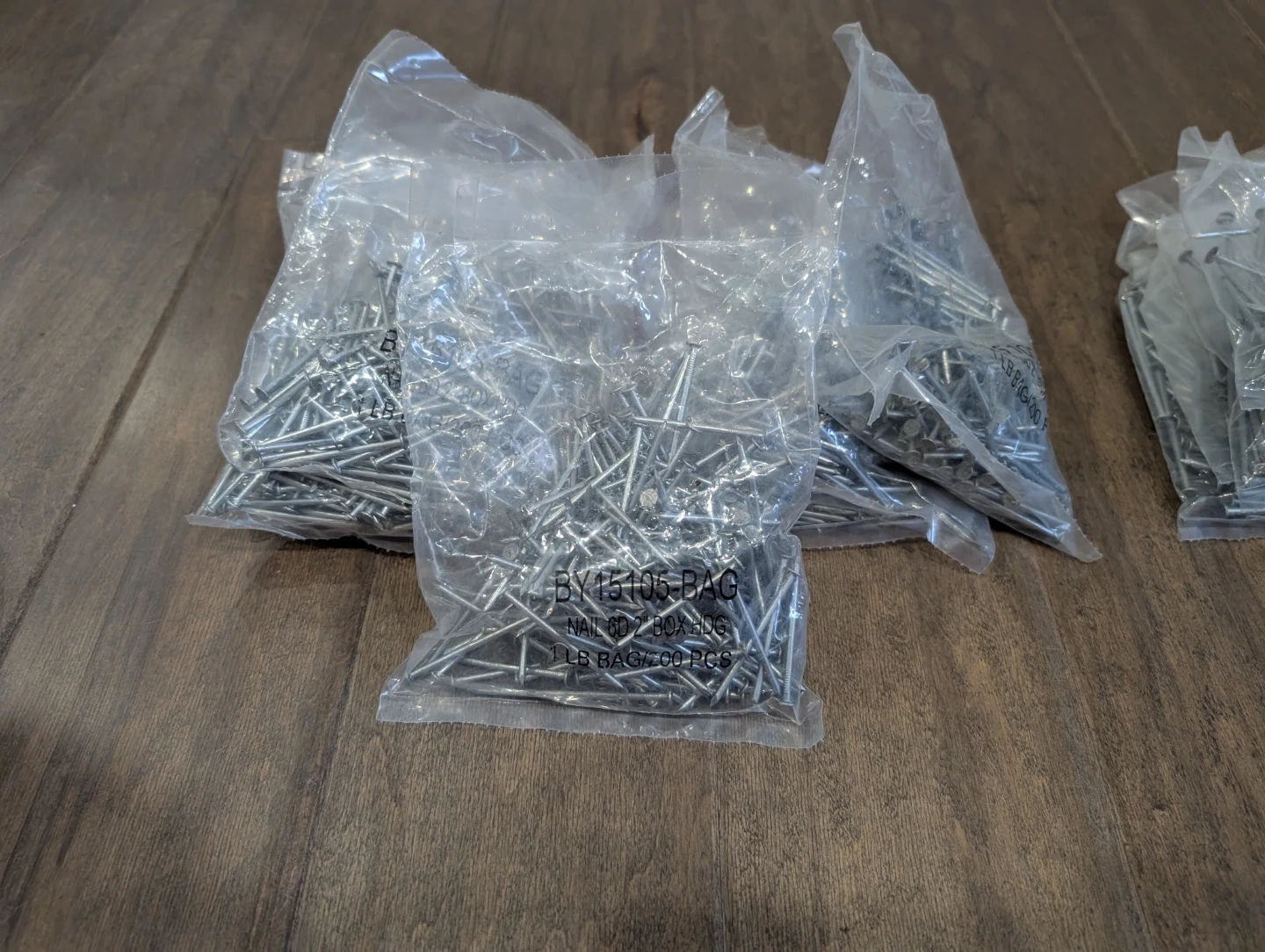 Brand new 2” and 3” inch nails for sale. Wood nails, framing, hot dipped. $5 per bag, 2” inch have 200 per bag, 3” have 75 per bag. 15 bags total, take all for $45 FIRM.