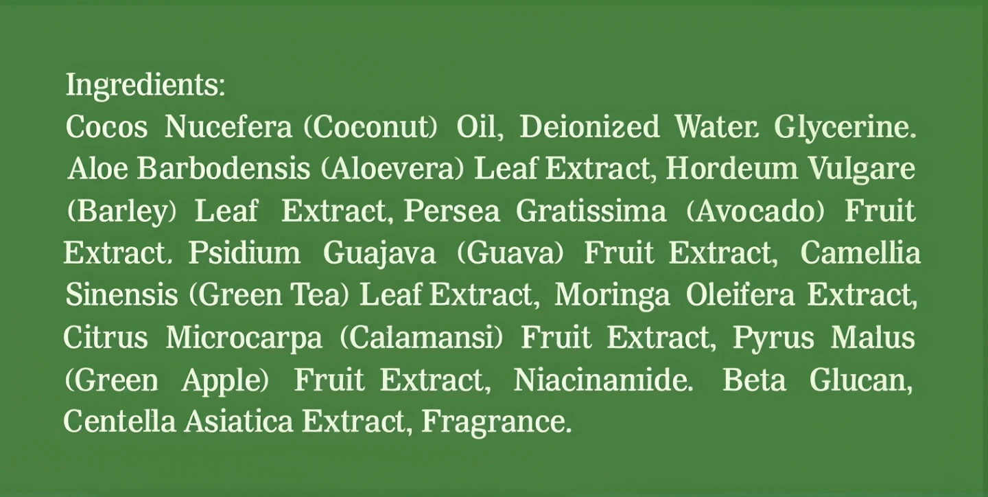 Moringa: Detoxifies and reduces inflammation for a clearer complexion.Avocado: Deeply hydrates and promotes healthy, supple skin.