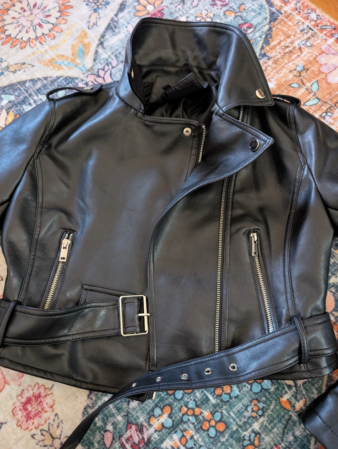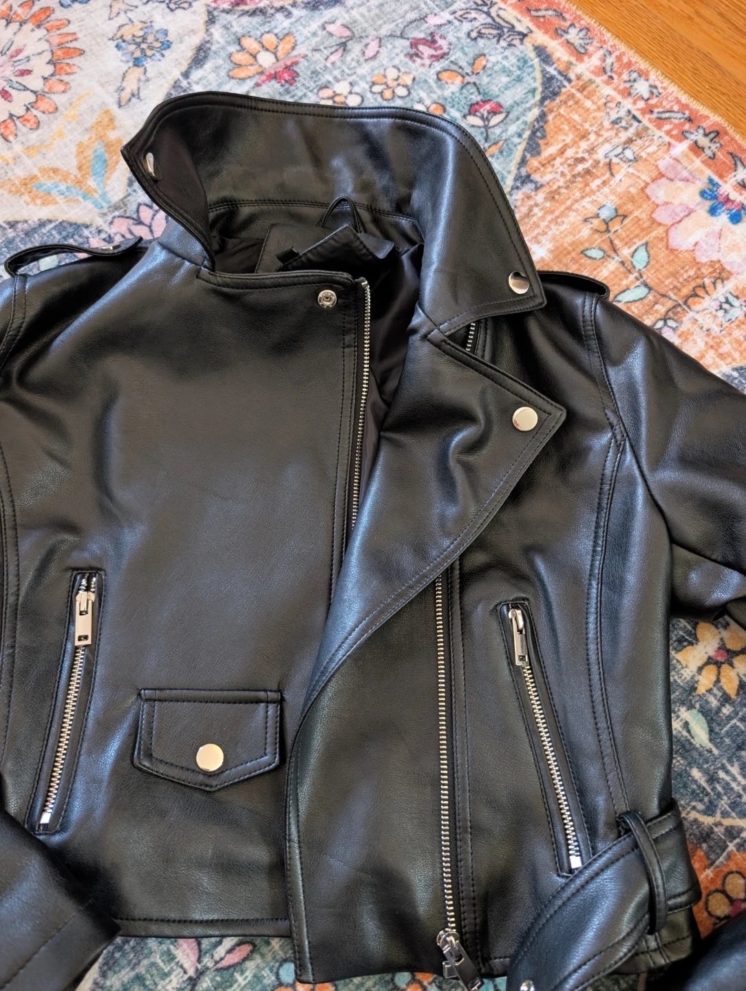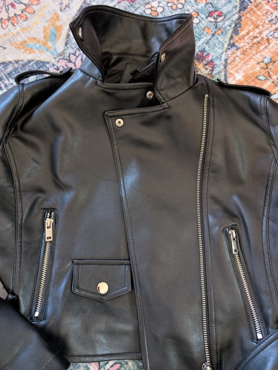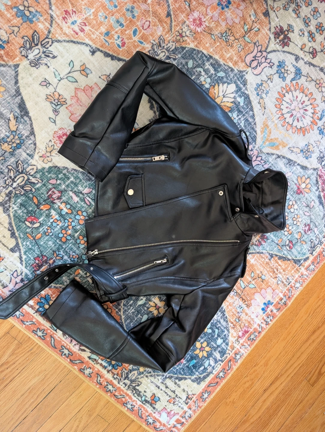 This pleather biker jacket is in great condition and fits true to size (small). Worn a few times.