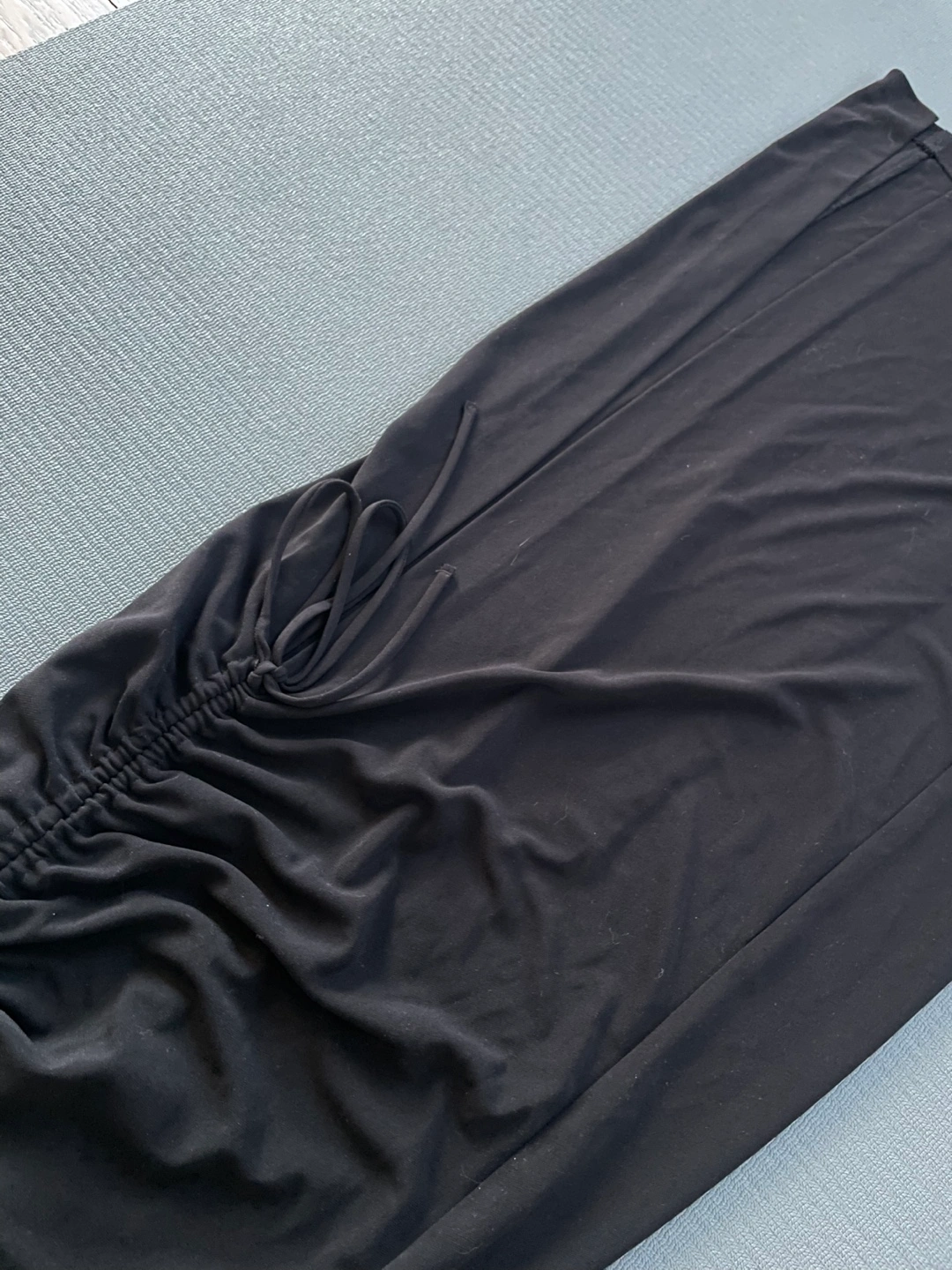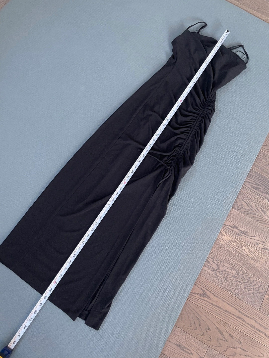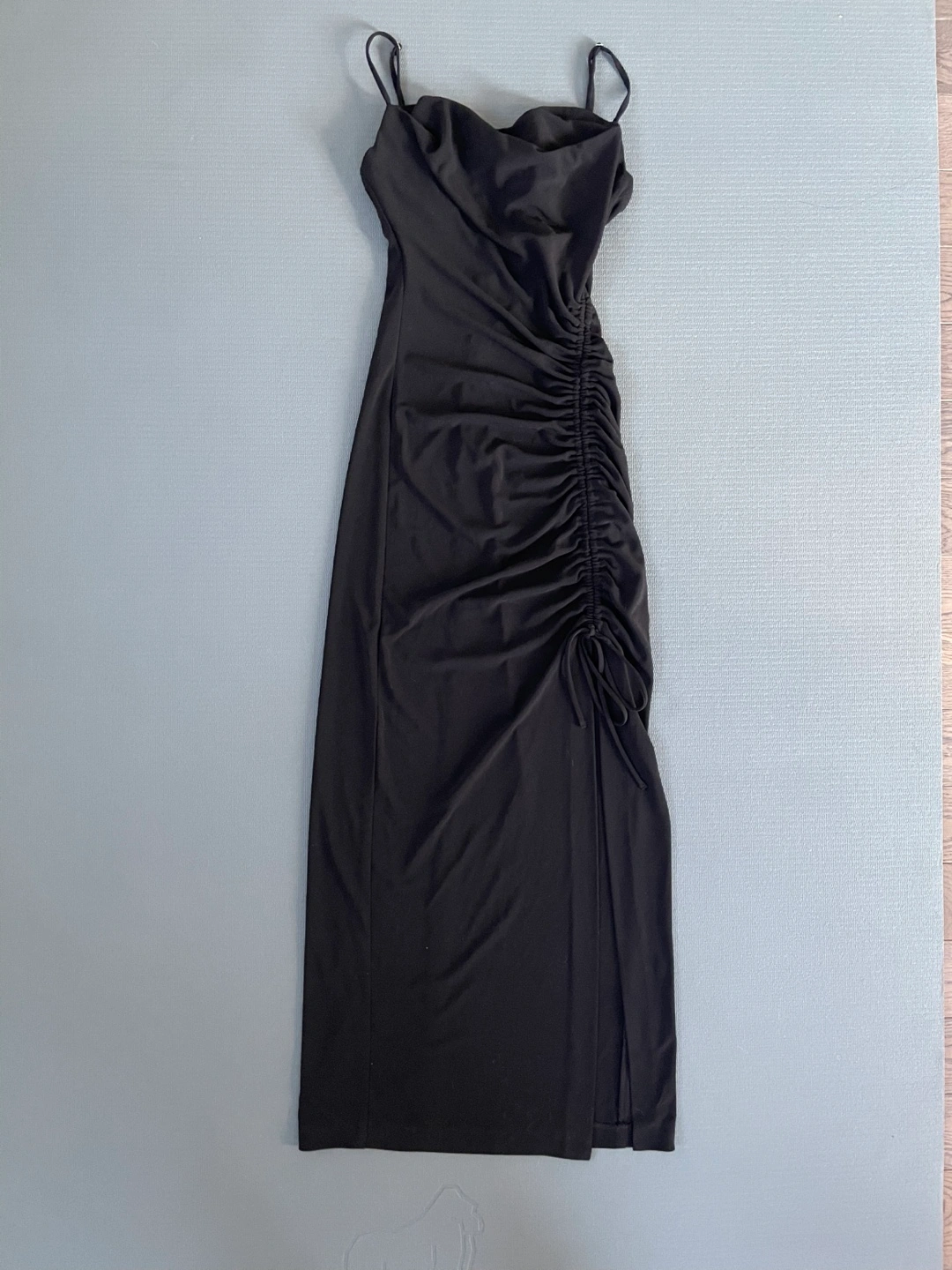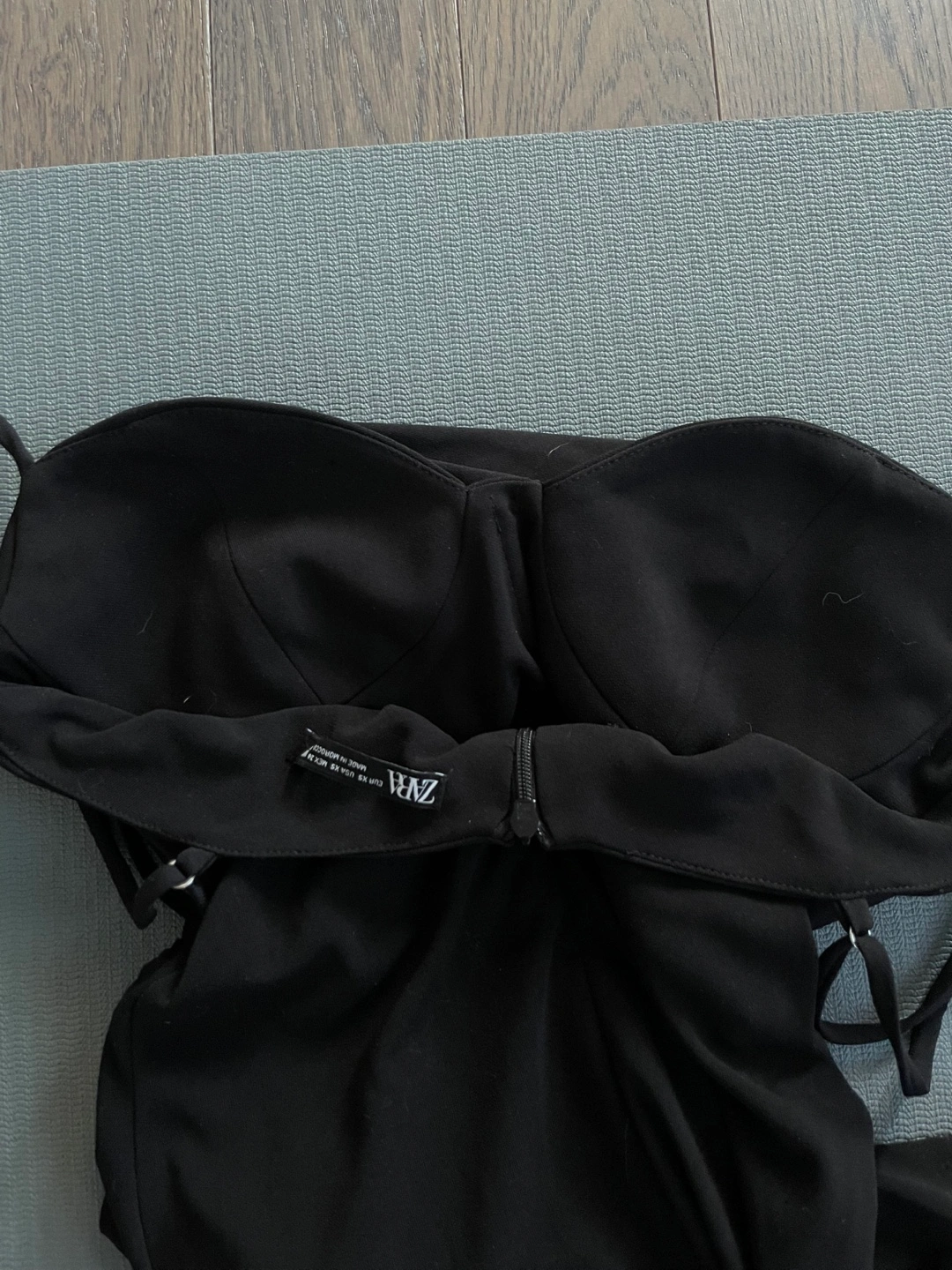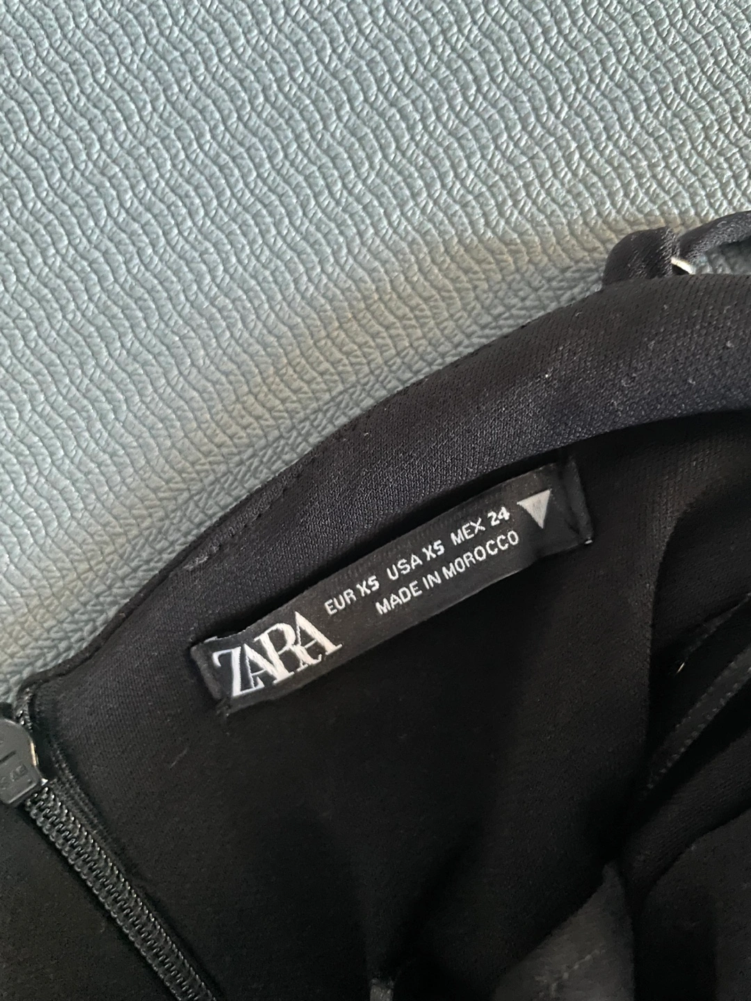 Selling a Zara black dress in size S. It's in great condition and has a stylish design. The dress measures approximately 53 inches in length. Perfect for a night out or a special occasion!