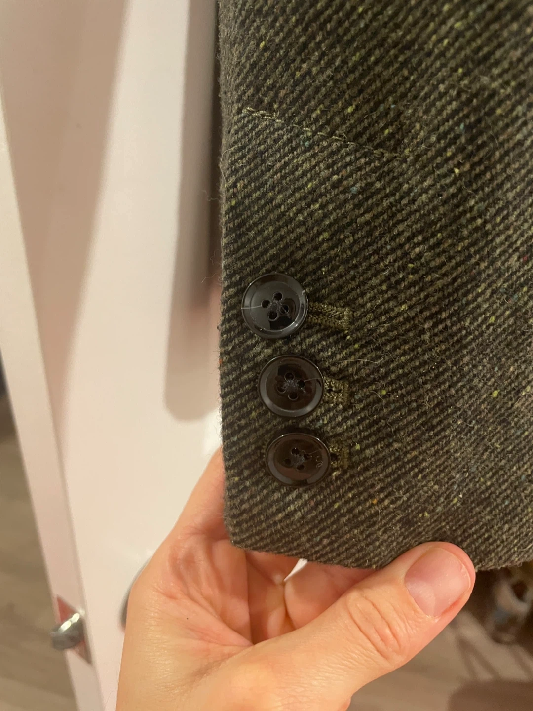 Notch lapel. Long sleeves with three-button cuffs.