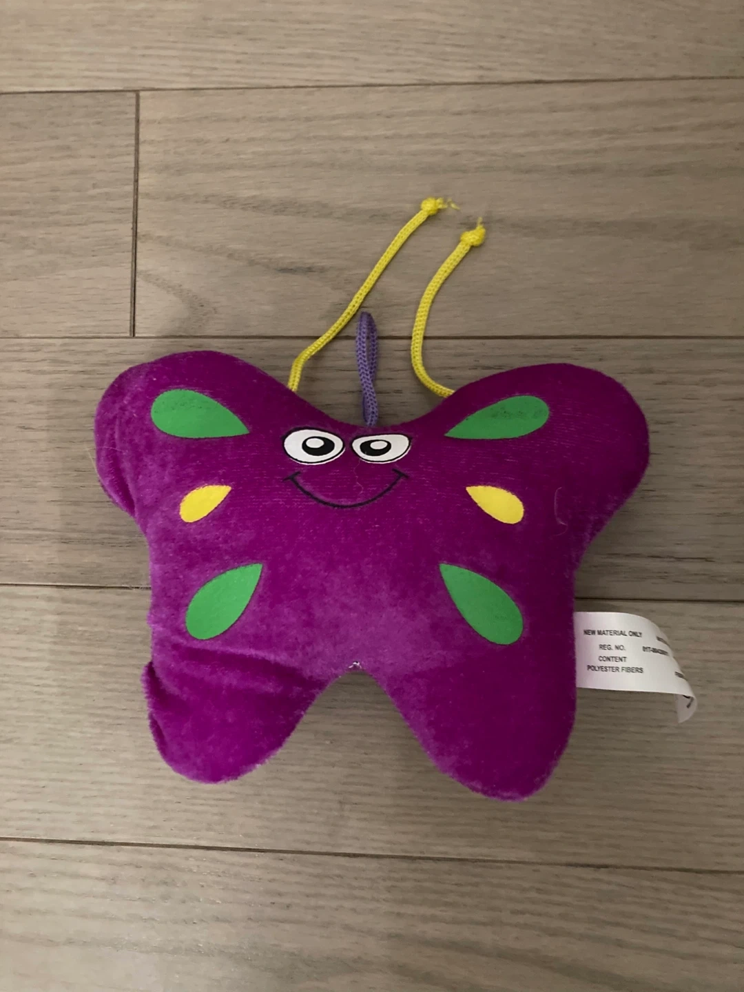 Here's a cute purple butterfly plush toy! It's made of polyester fibers and features green and yellow spots. It's in good condition and looking for a new home!