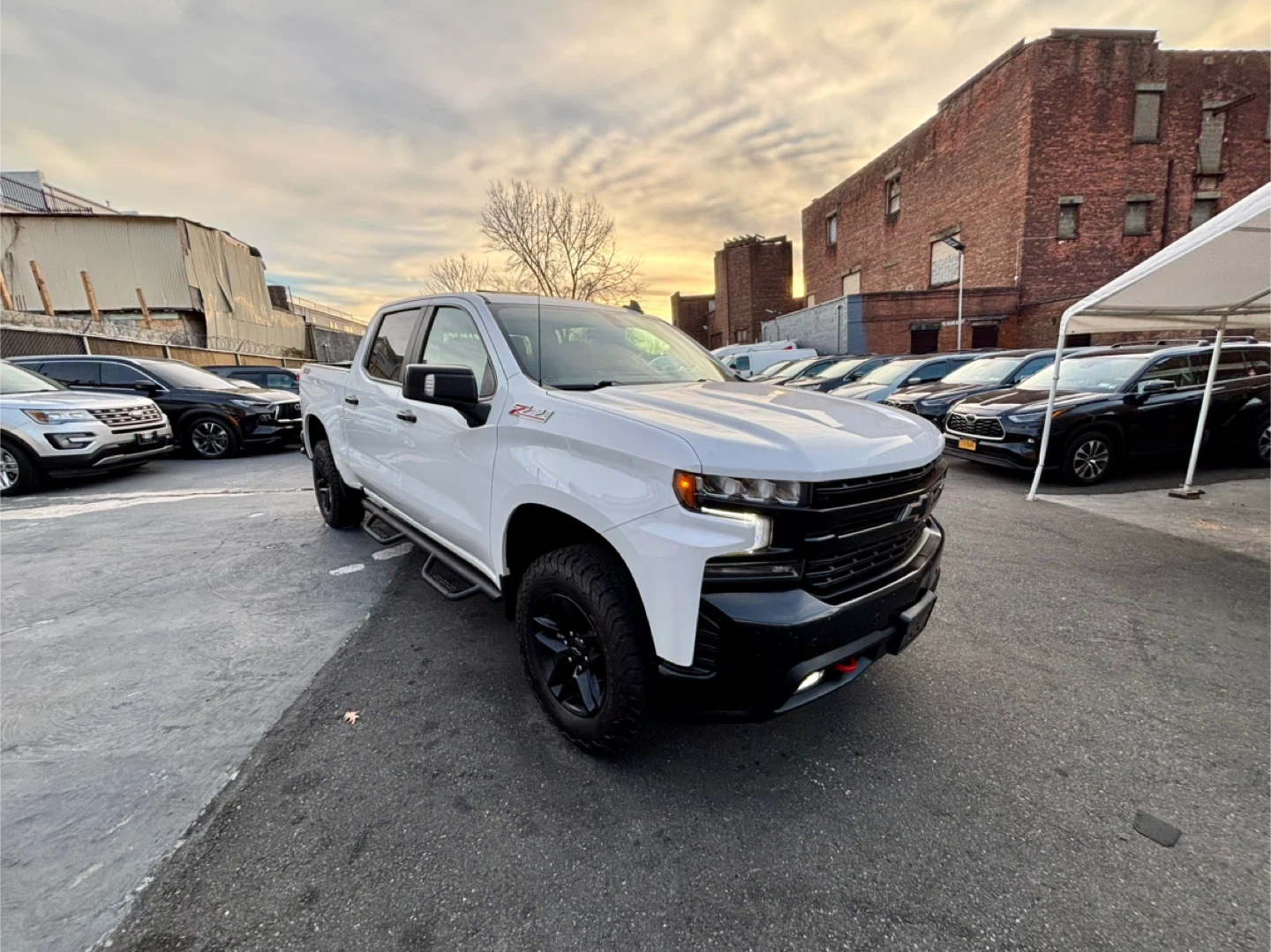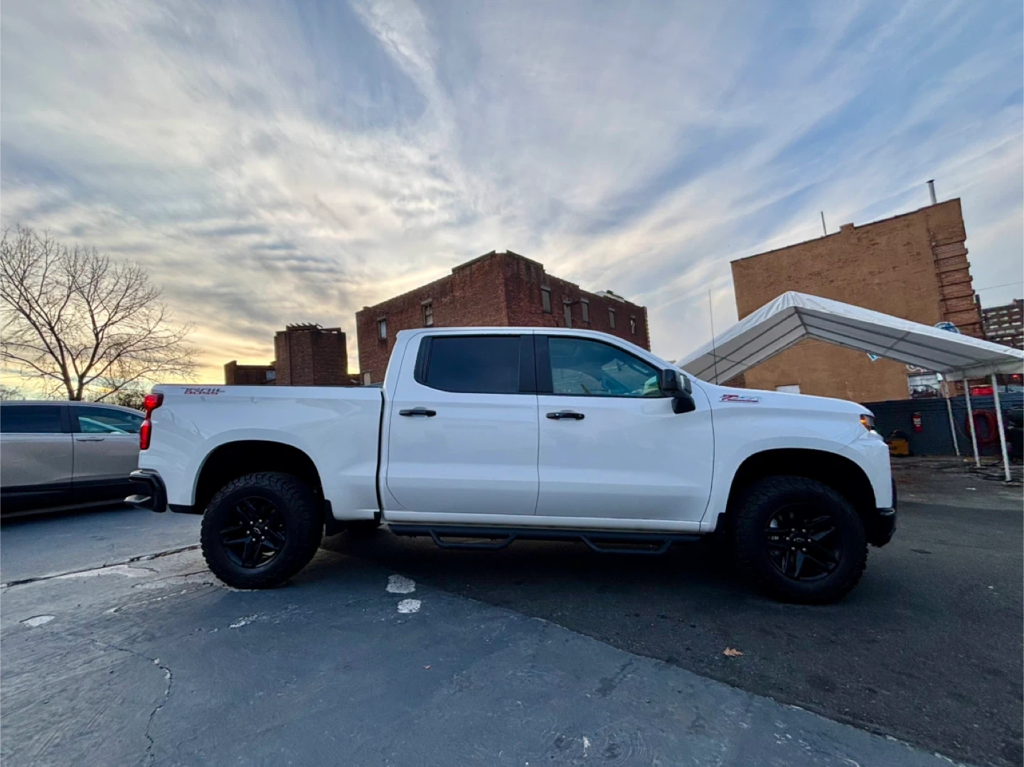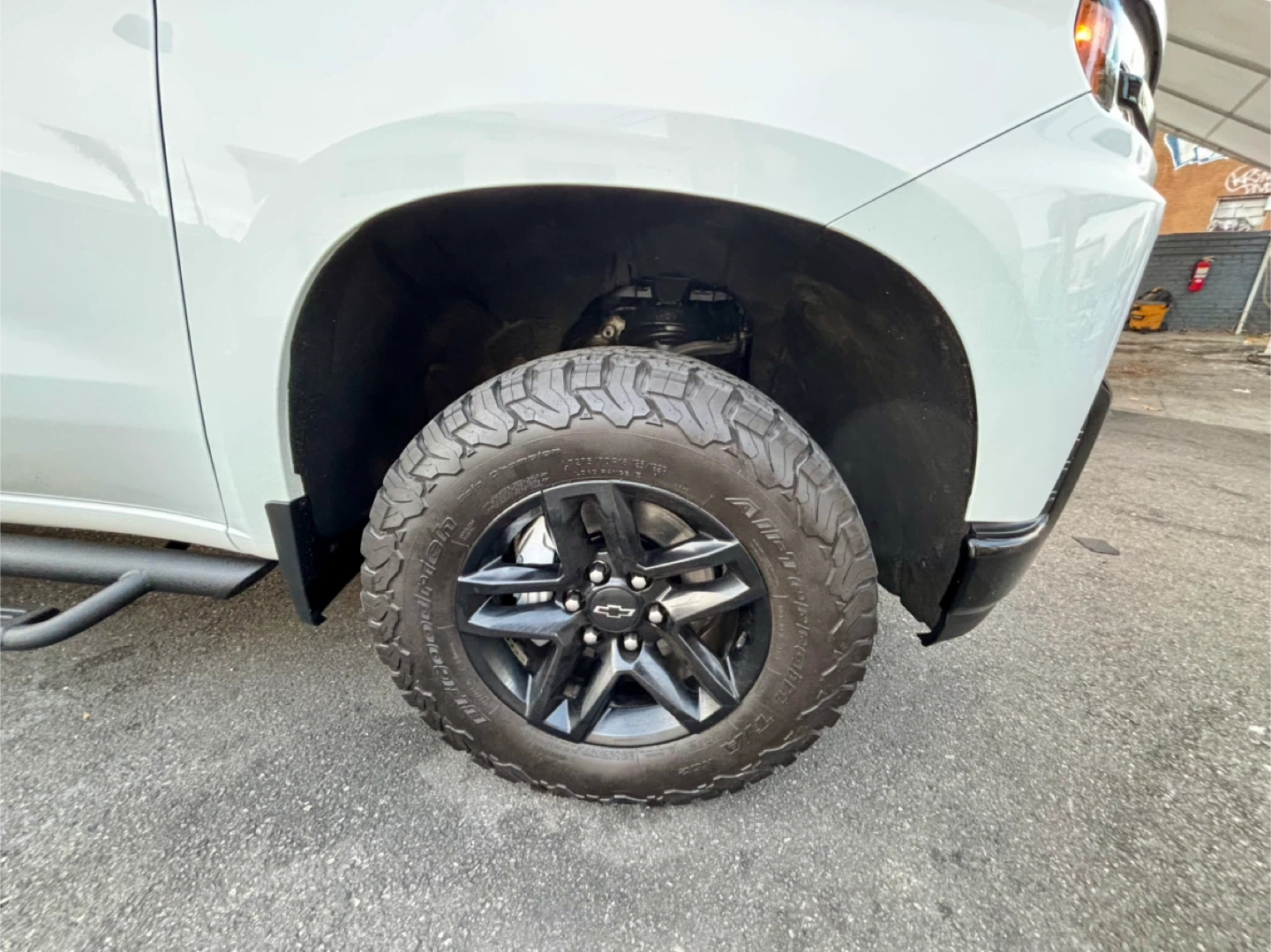 Selling a Chevrolet Silverado truck. It's white with black wheels and has a Trail Boss trim. The truck has a crew cab and is in good condition. Perfect for anyone needing a reliable and stylish pickup!