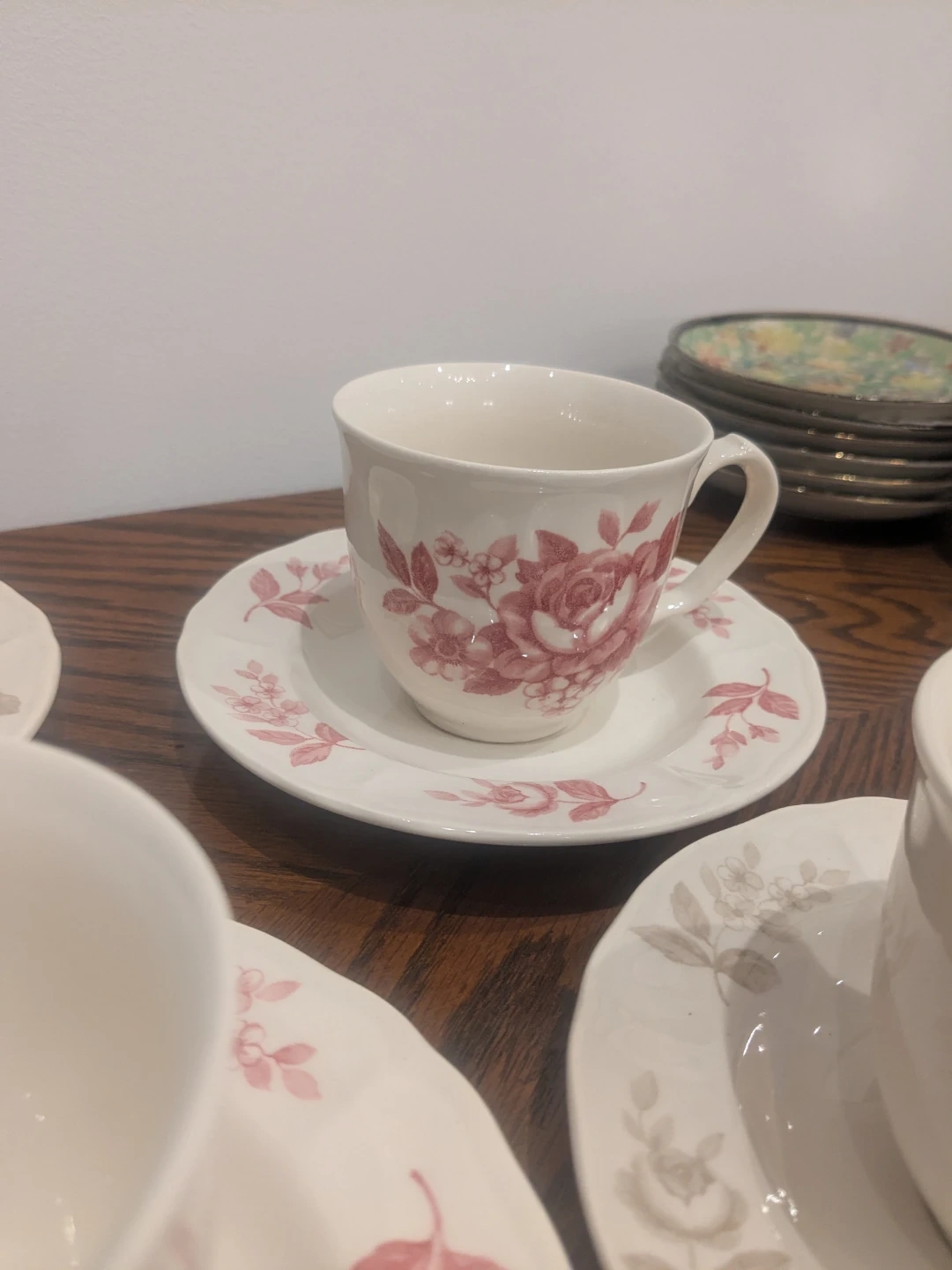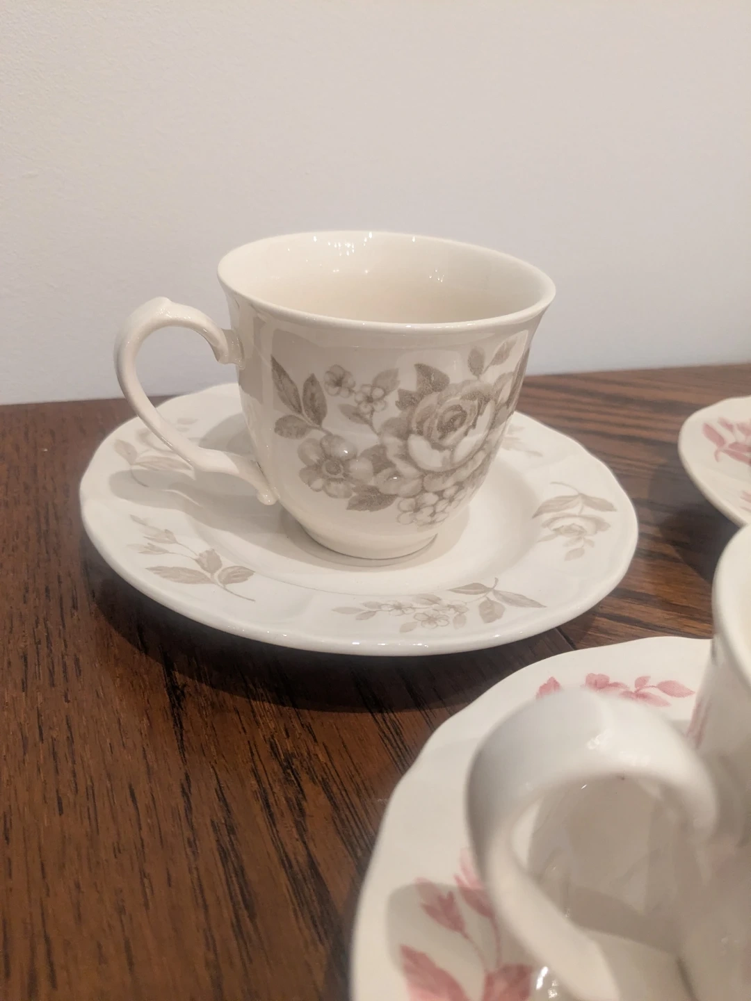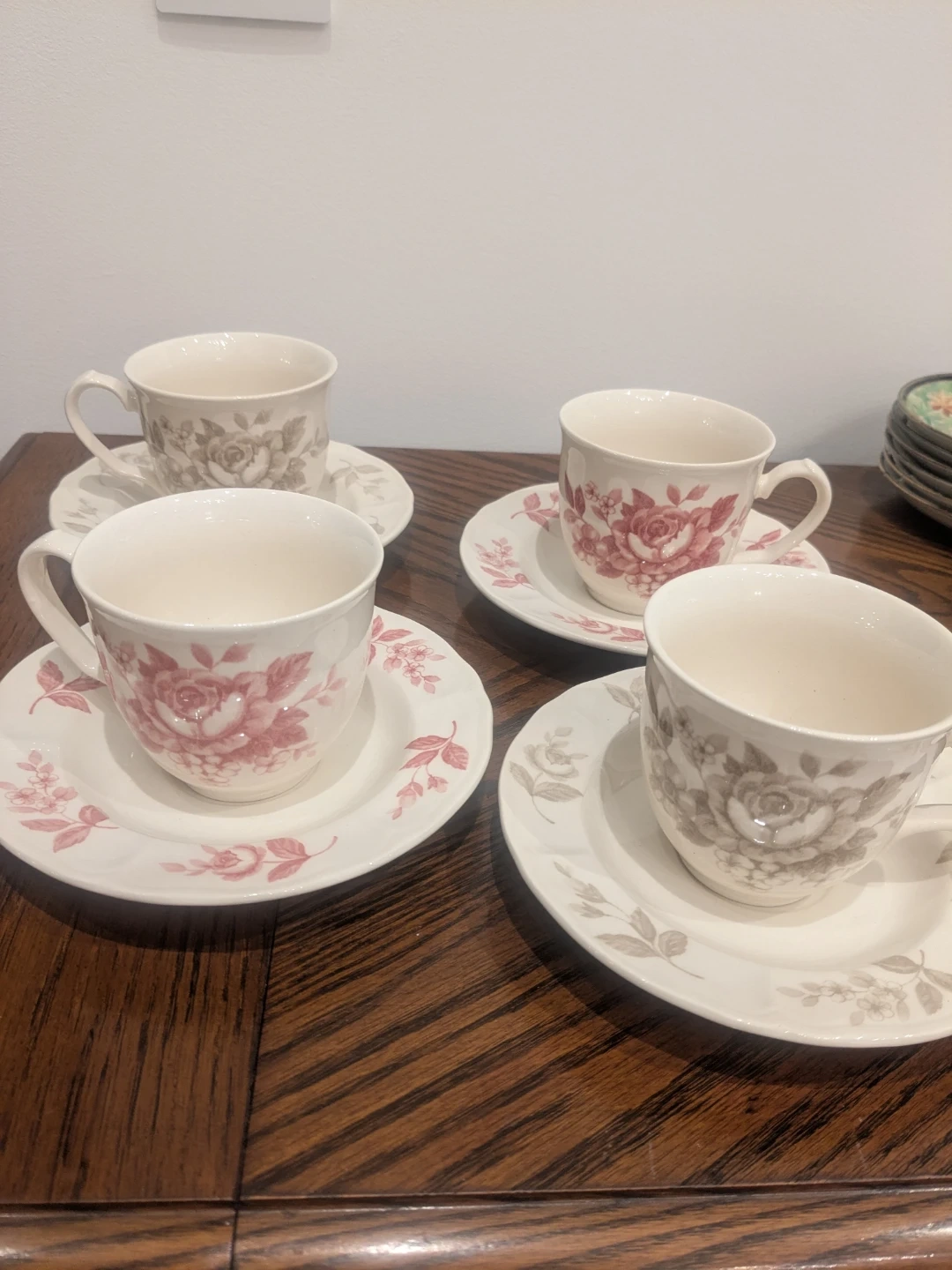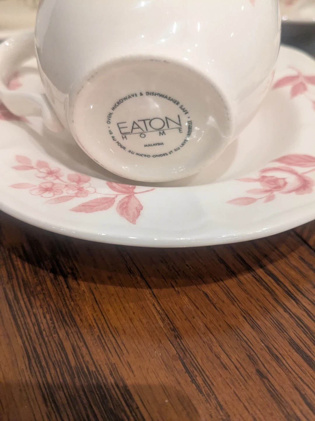 Selling a set of 12 Eaton Home tea cups and saucers. They feature a lovely floral design in shades of pink rose and taupe on a cream background. These are microwave and dishwasher safe, made in Malaysia. Perfect for tea time!