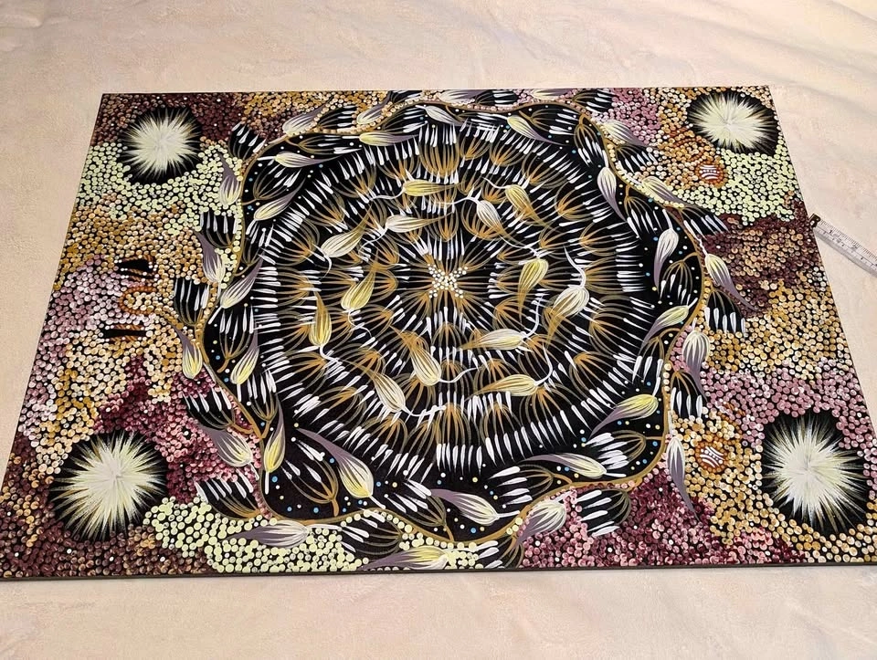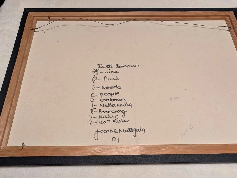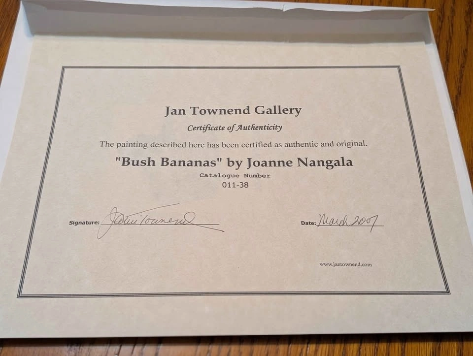 Joanne Nangala is an Aboriginal artist from the Central Desert region of Australia, and "Bush Bananas" is a common subject in Aboriginal art, often representing stories and traditional knowledge.