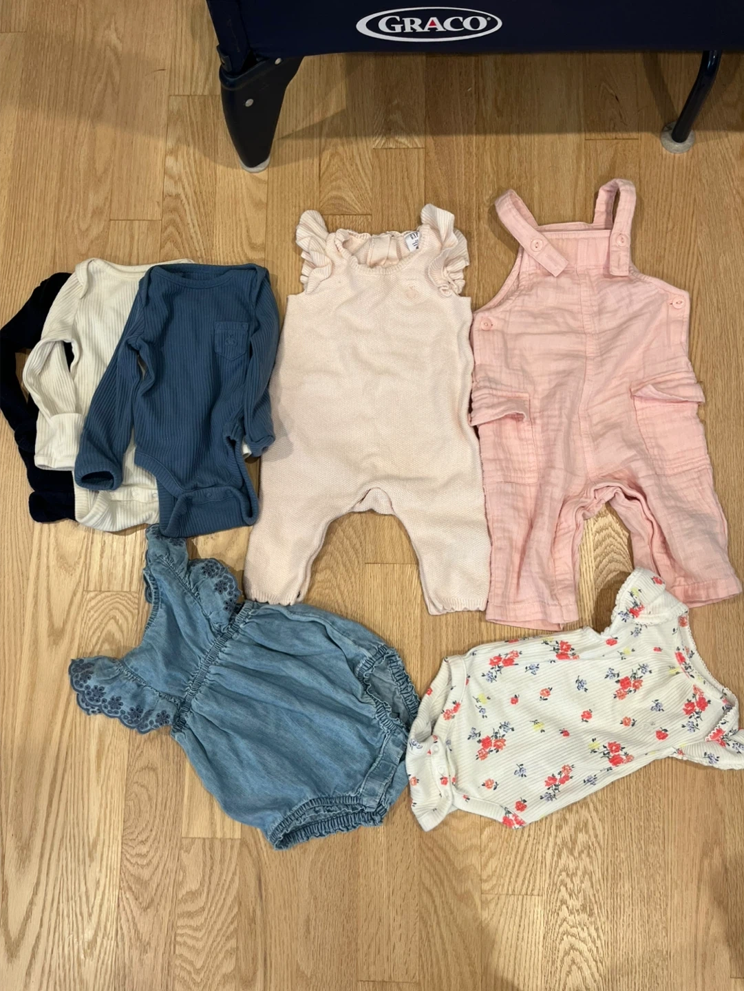 - Pink cotton rompers with buttons for easy diaper changes (3-6M)