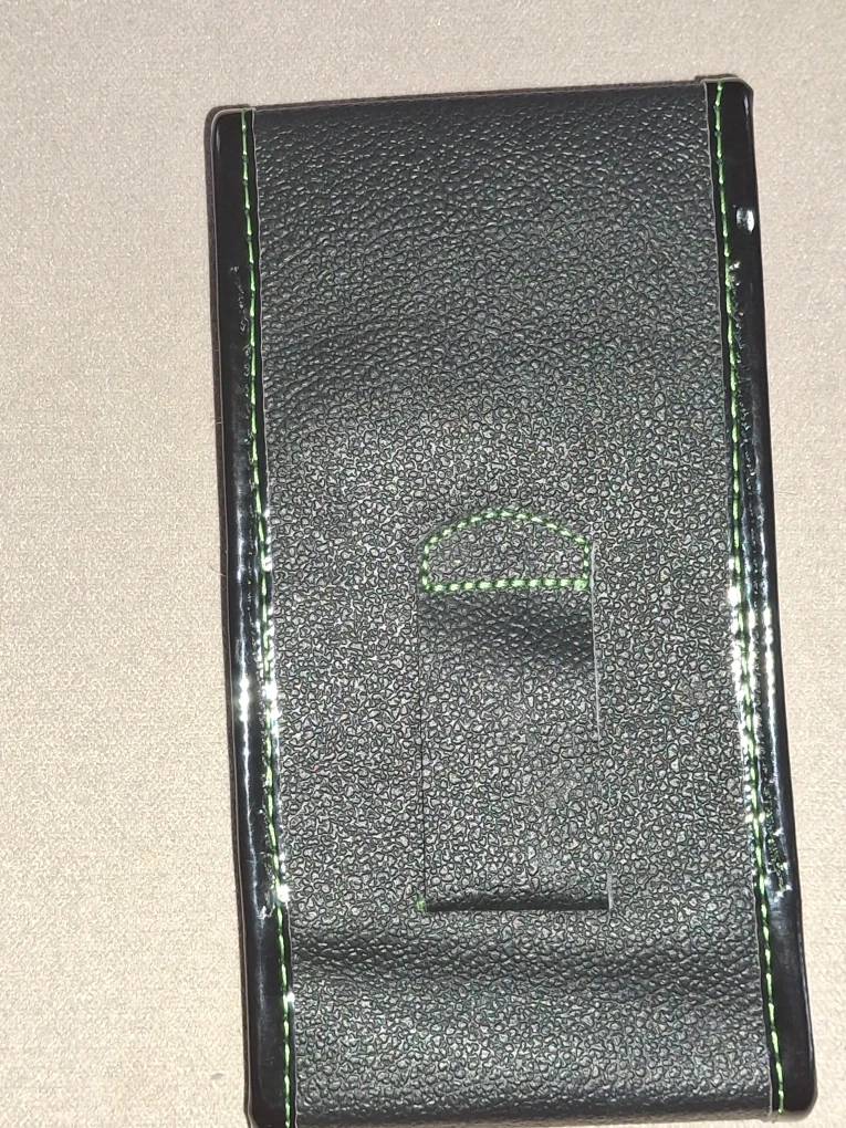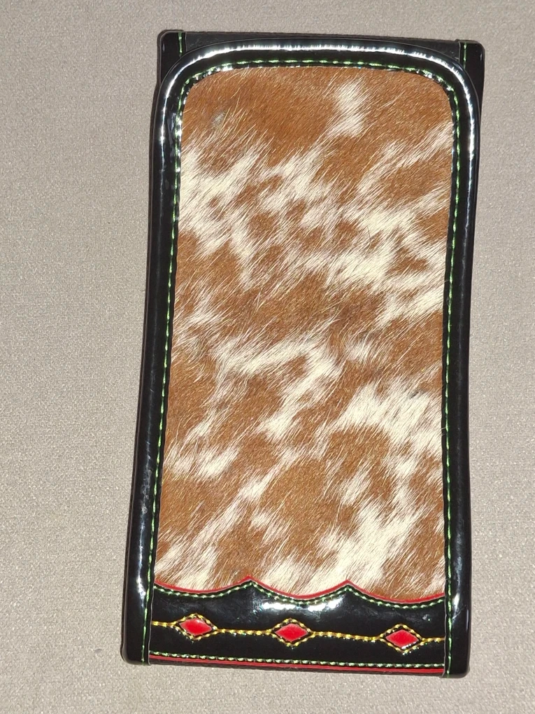 This checkbook cover features a unique cowhide leather design. The cover is black with a cowhide pattern and red diamond accents. It's in great condition and ready for a new owner!