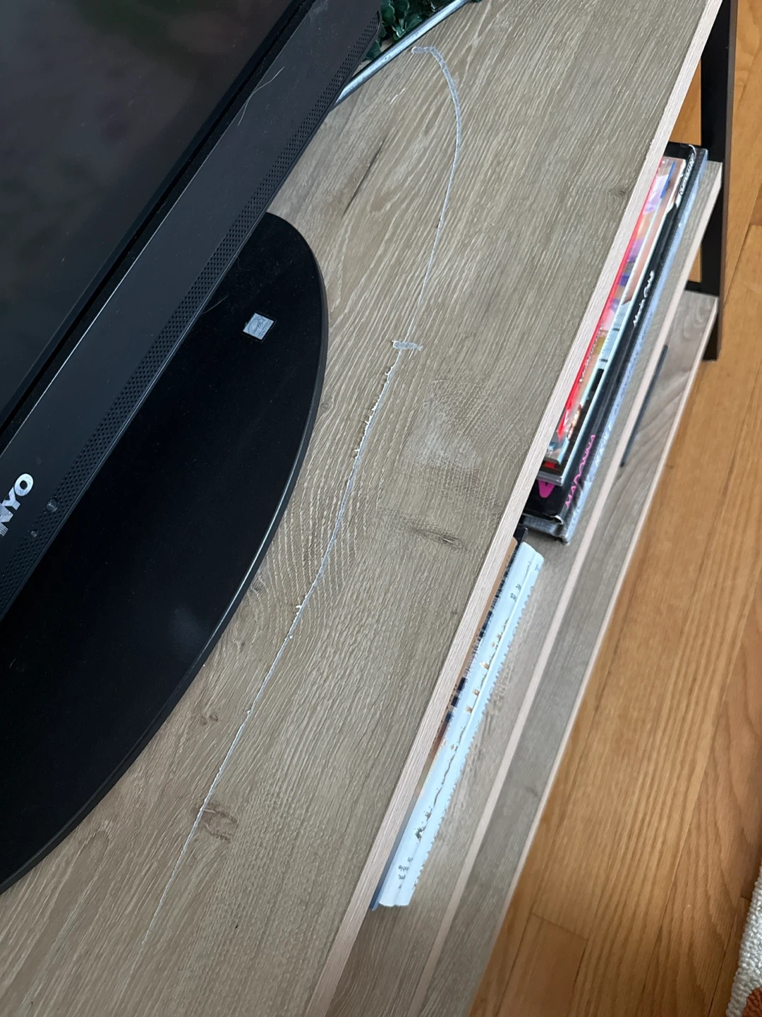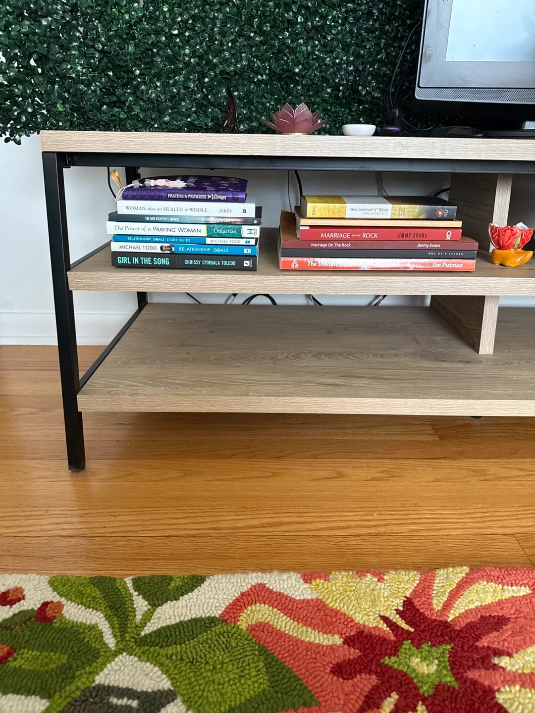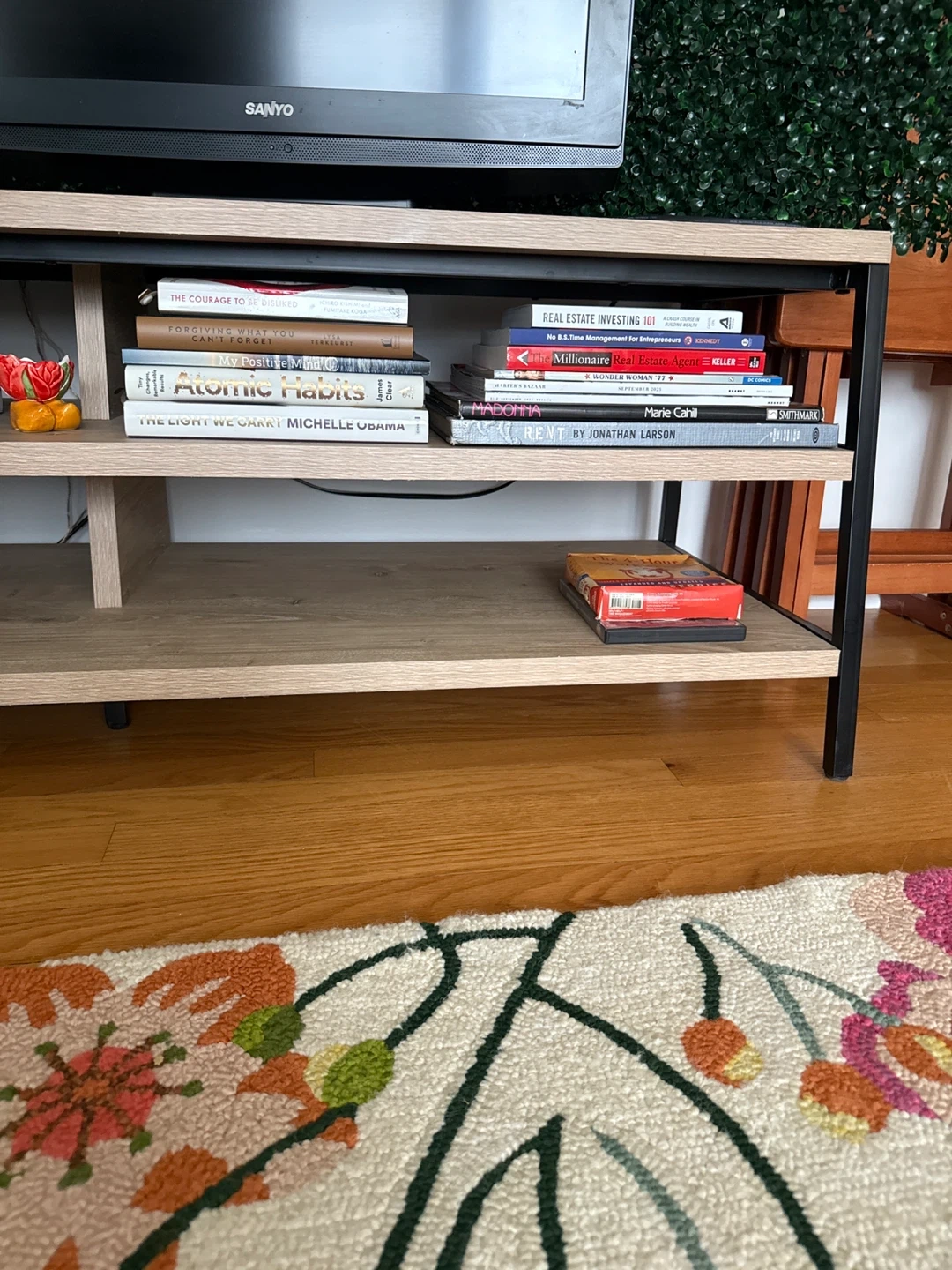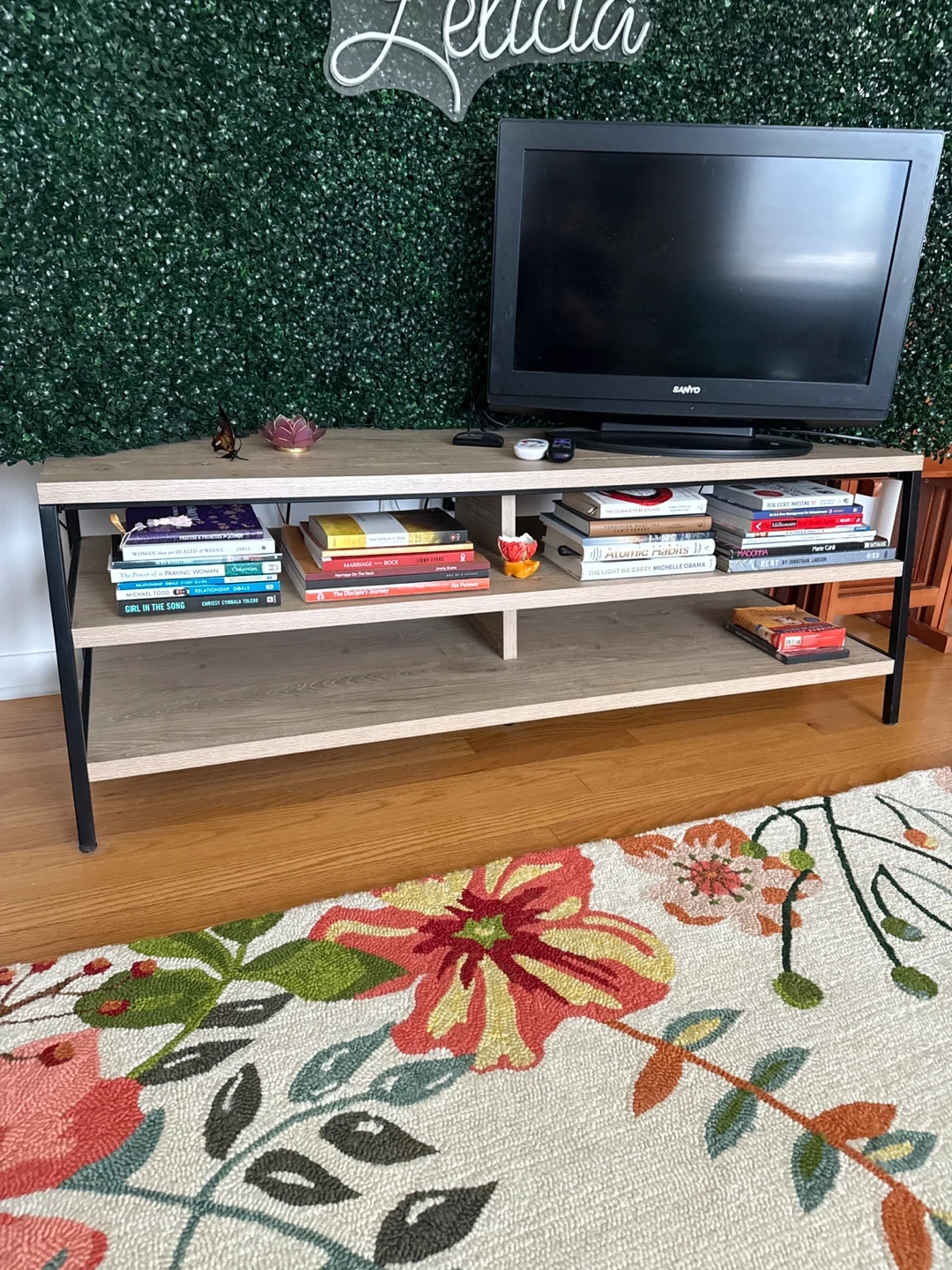 Selling a used TV stand with shelves. It has a light wood-tone finish and black metal legs. There are some visible scratches on the top surface. Great for organizing your entertainment area! 55 inches wide. Top shelf 17 inches depth middle shelf 18 inches depth & last shelf is 19 inches depth. Height is about 19 inches tall.