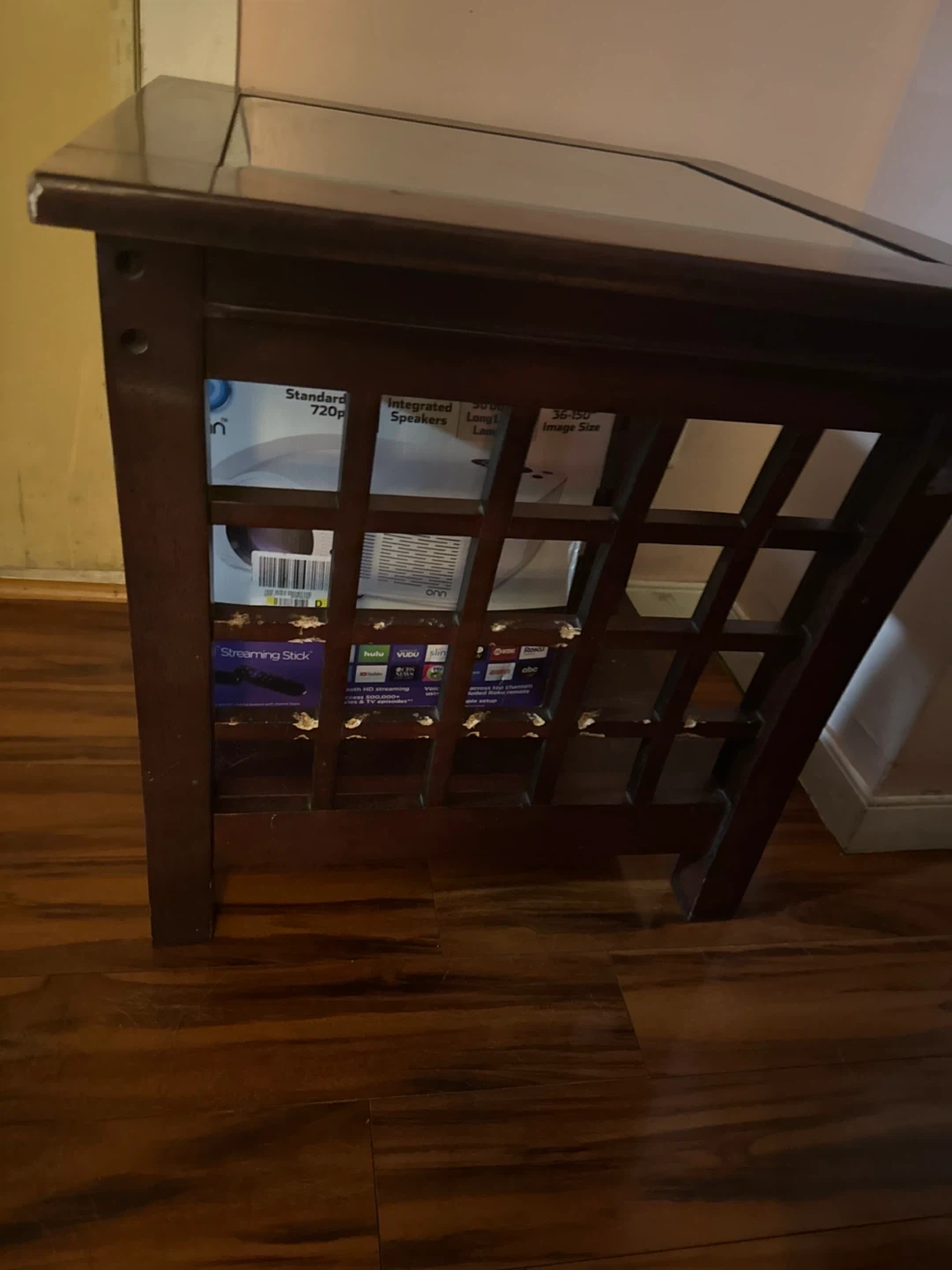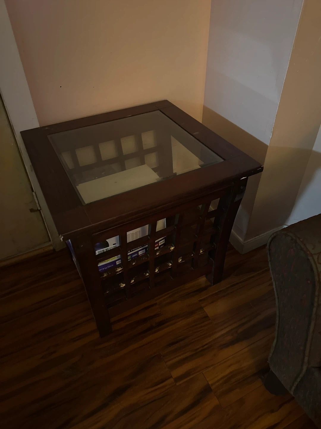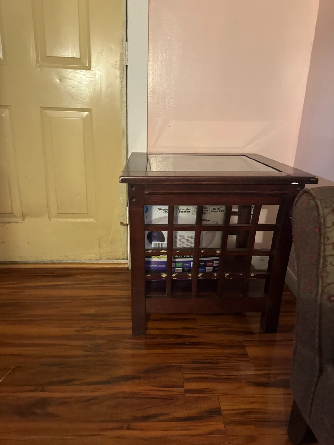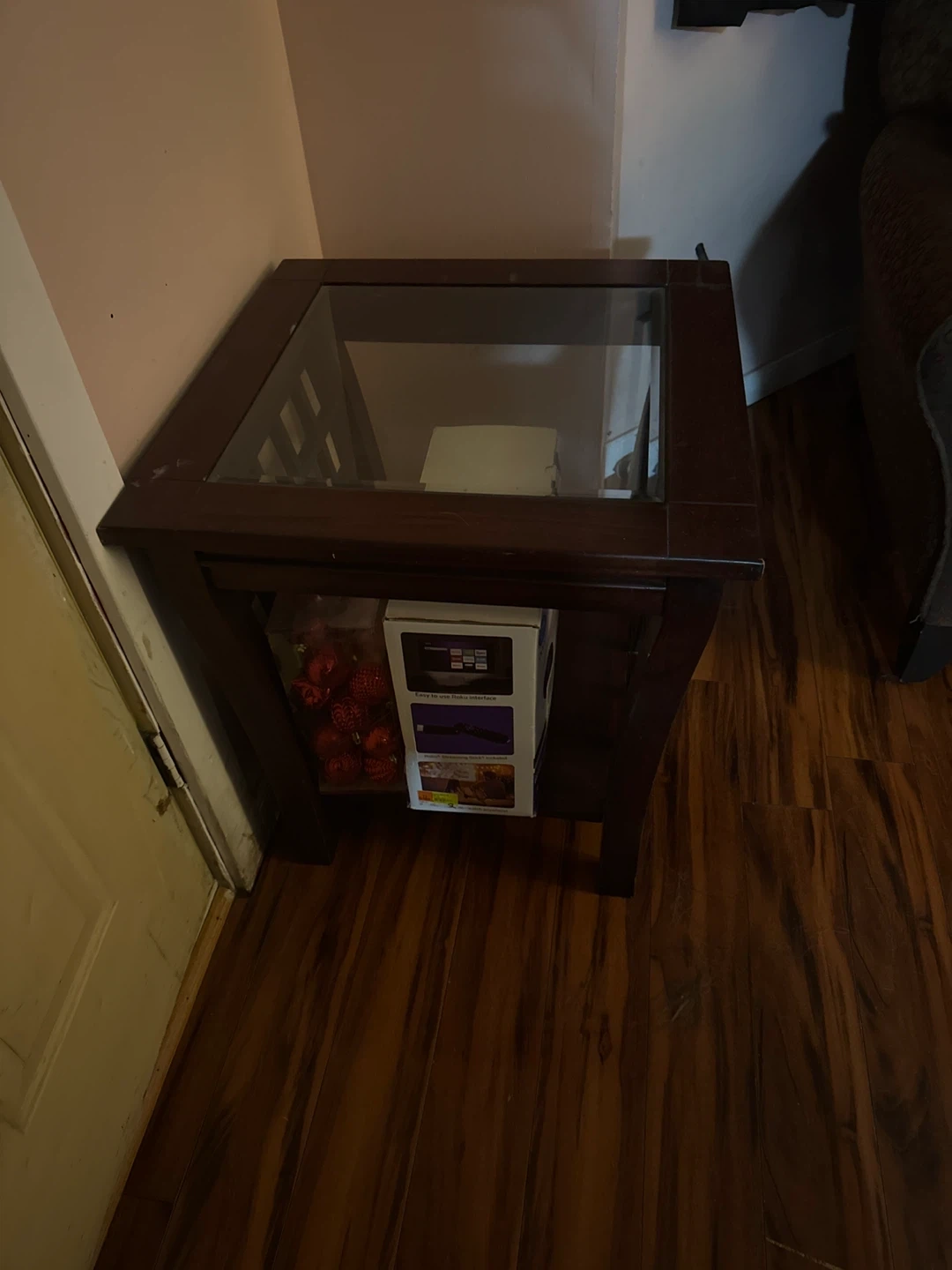 Selling a used end table with a glass top. It has a dark brown wooden frame with a decorative grid pattern on the sides. There are some signs of wear and tear on the wooden parts, but the glass top is in good condition. It would look great next to a sofa or bed!