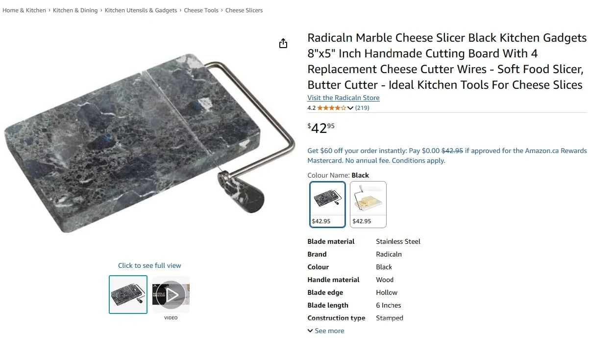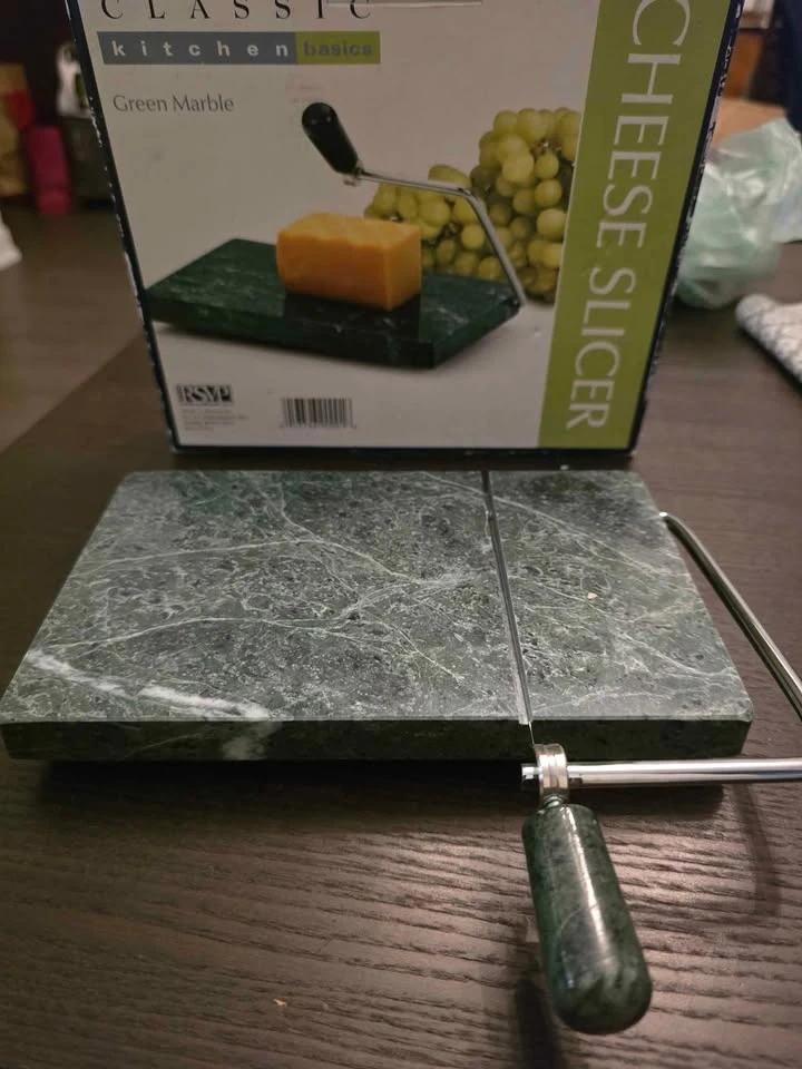 I'm selling a Radicaln marble cheese slicer in green! It's in great condition and ready for a new kitchen. The slicer features a stainless steel blade and a wooden handle. Perfect for slicing soft cheeses with ease!
