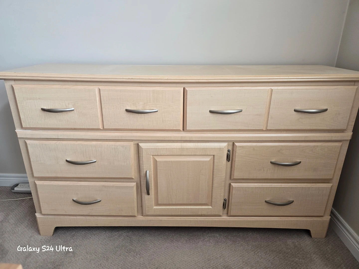 Here's a lovely wooden dresser with plenty of drawer space! It's perfect for adding some extra storage to your bedroom or living area. The light wood finish is neutral and would fit in with many different styles. It's in great condition and ready for a new home! (16"D×62"W×35"H)