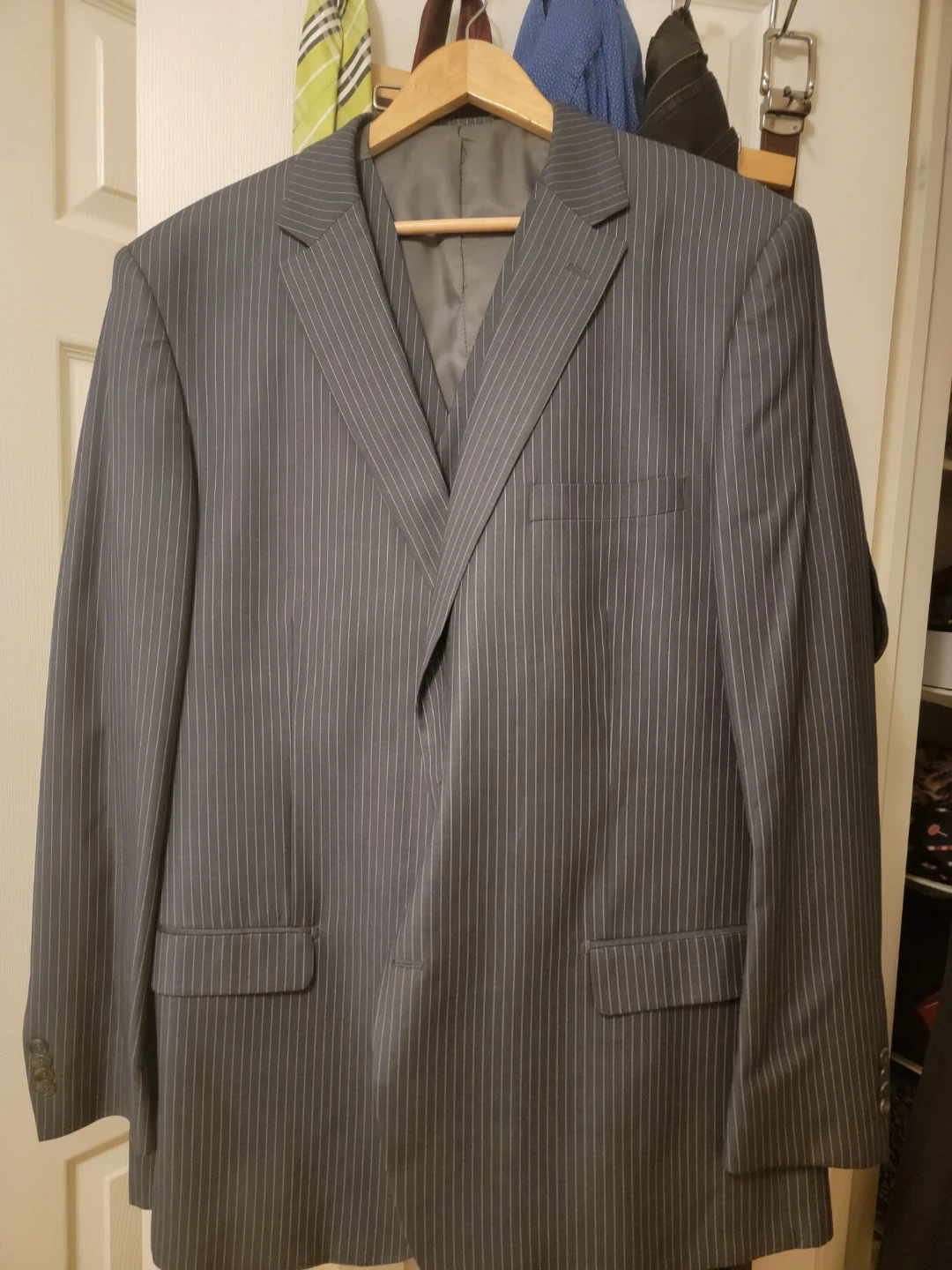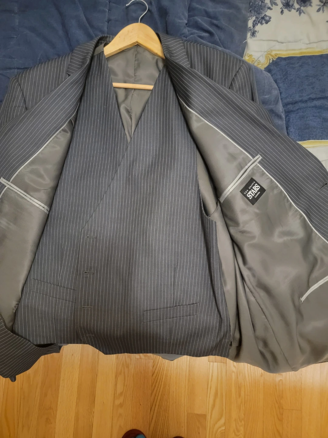 Selling a STARS pinstripe suit jacket. It's in great condition and ready for a new owner! The jacket features a stylish pinstripe pattern.