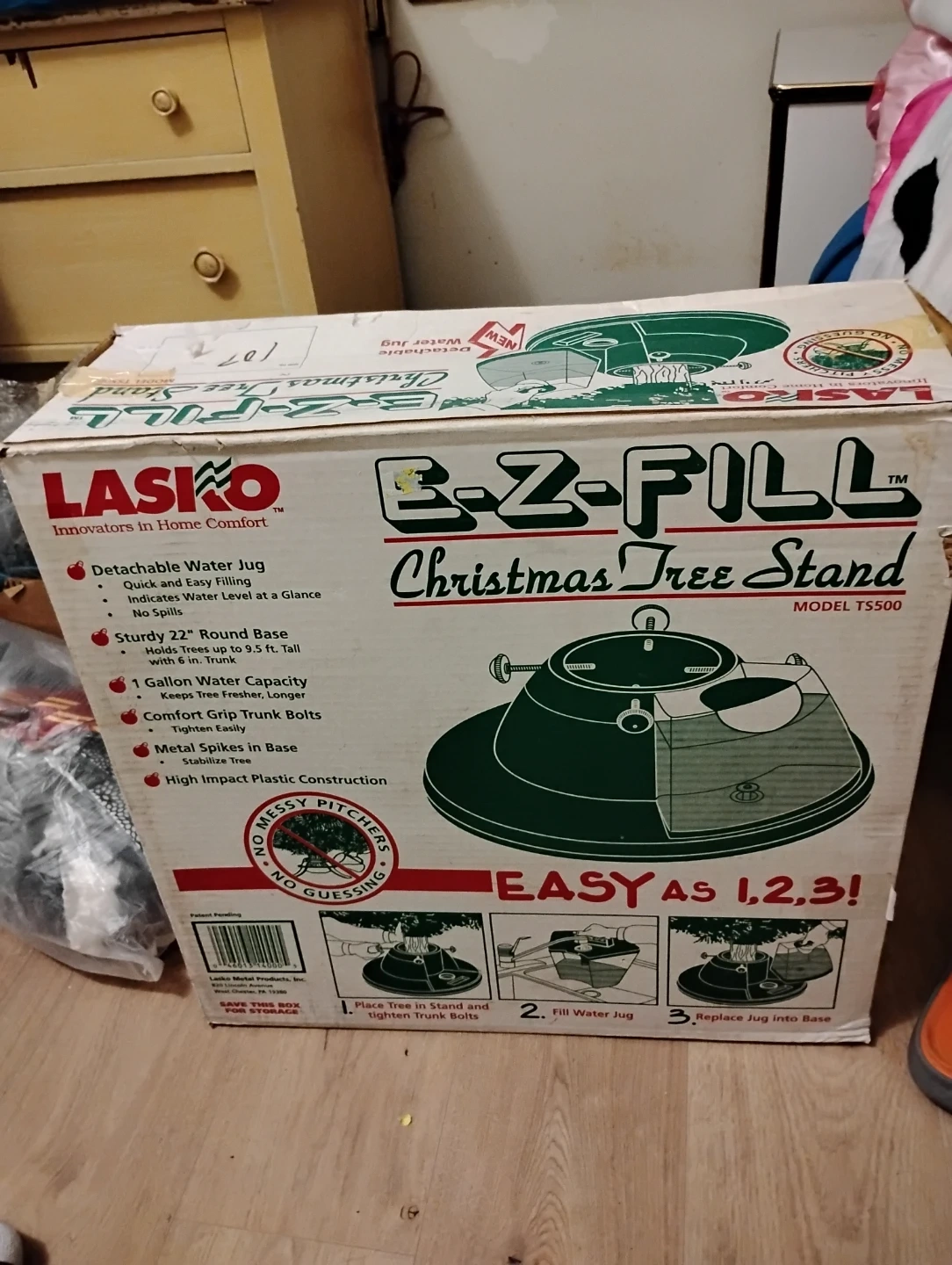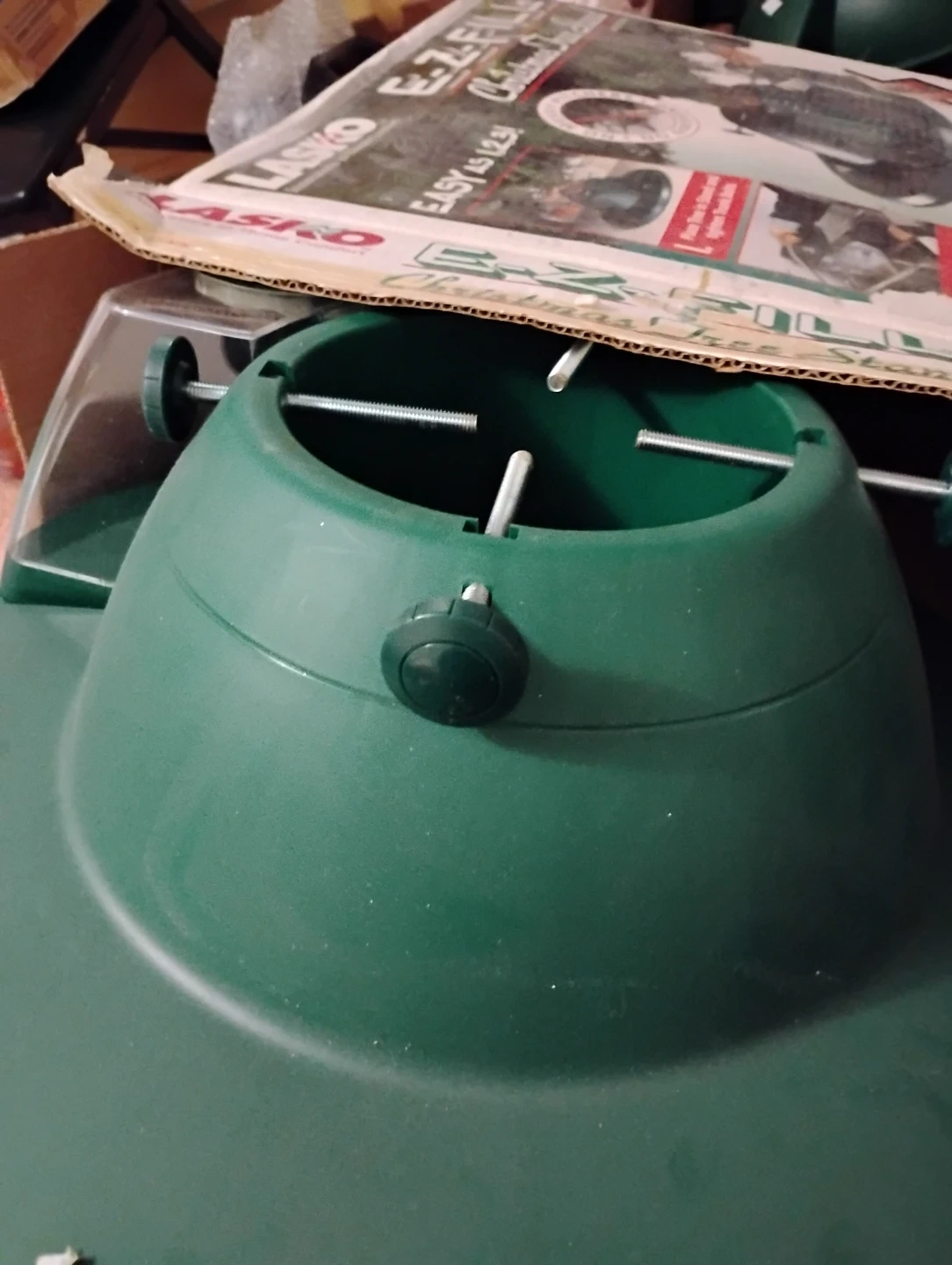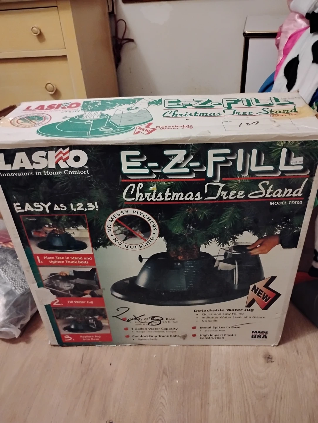 Selling a LASKO E-Z-Fill Christmas Tree Stand, model TS500. It features a detachable water jug for easy filling and indicates the water level at a glance. The stand has a sturdy 22" round base and can hold trees up to 9.5 ft tall. It also has a 1-gallon water capacity to keep your tree fresher longer. Comes with comfort grip trunk bolts and metal spikes in the base. High-impact plastic construction for durability. The box is included!
