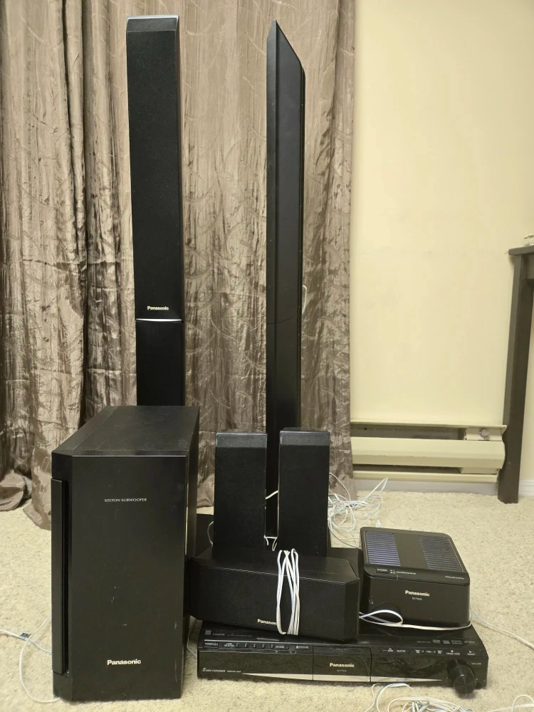 Selling a Panasonic home theatre system. It includes a subwoofer, two tall speakers, two smaller speakers, and a receiver. Great for setting up a home entertainment system!
