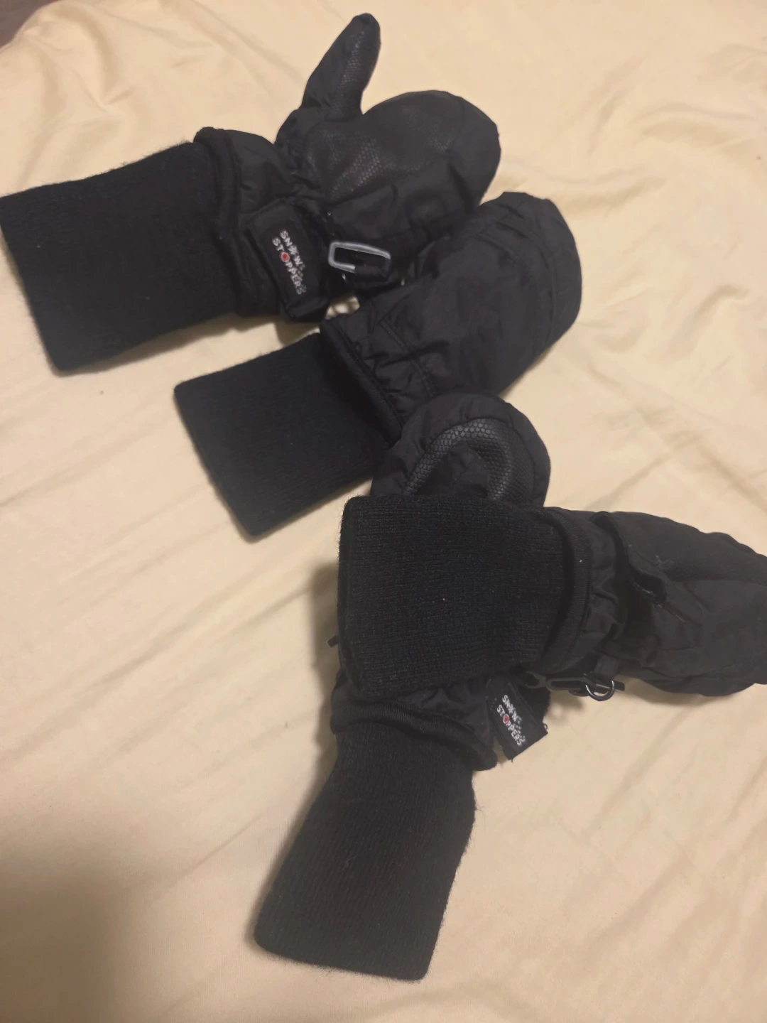 Selling a pair of Snow Stoppers mittens in kids' size small. They're black and made with polyester, polyurethane, olefin, and acrylic. Great for keeping little hands warm and dry!