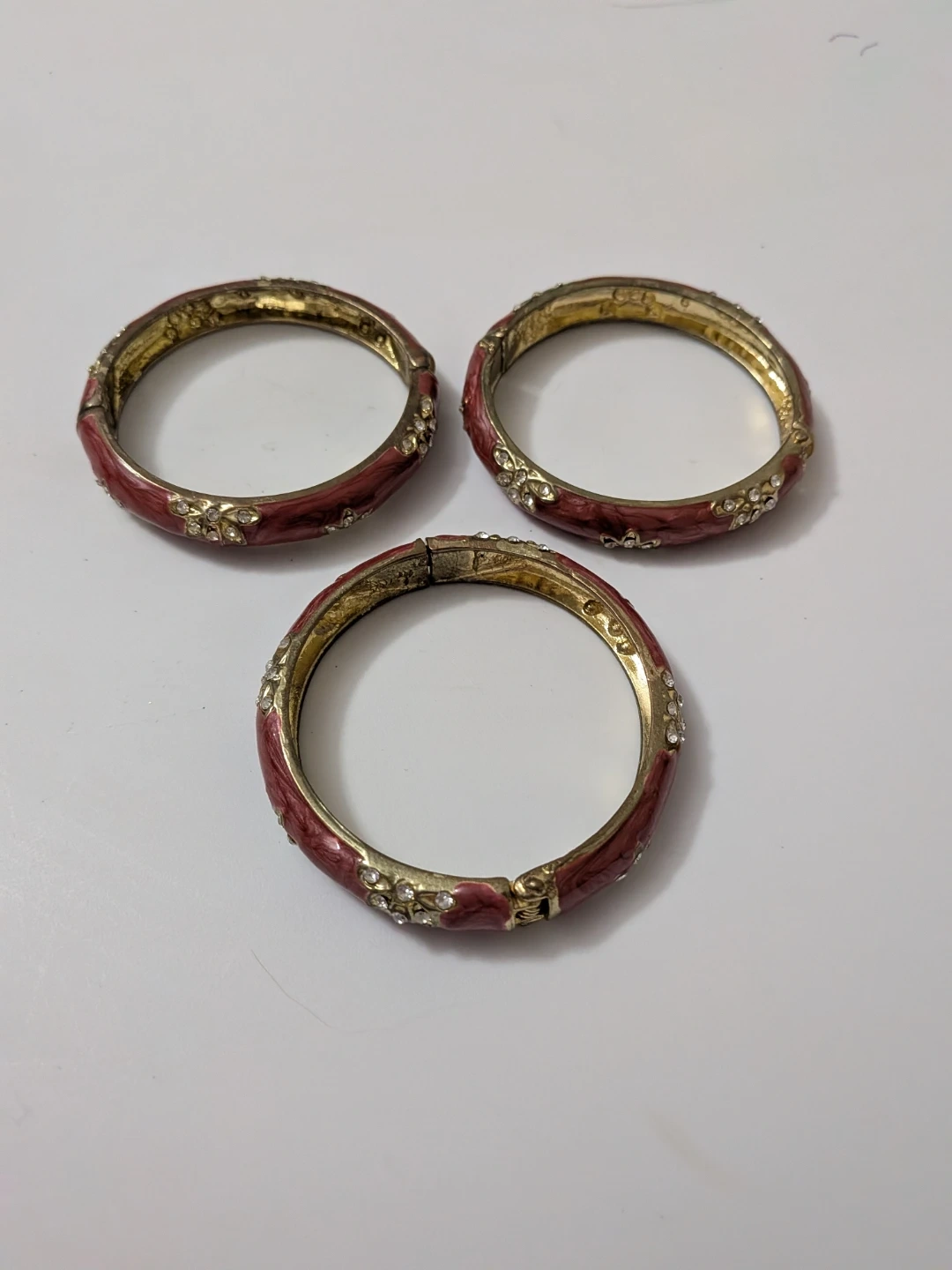 Selling a set of three bangles! They feature a pink enamel inlay with gold-tone metal and small clear stones. They're in great condition and would make a lovely addition to any jewelry collection