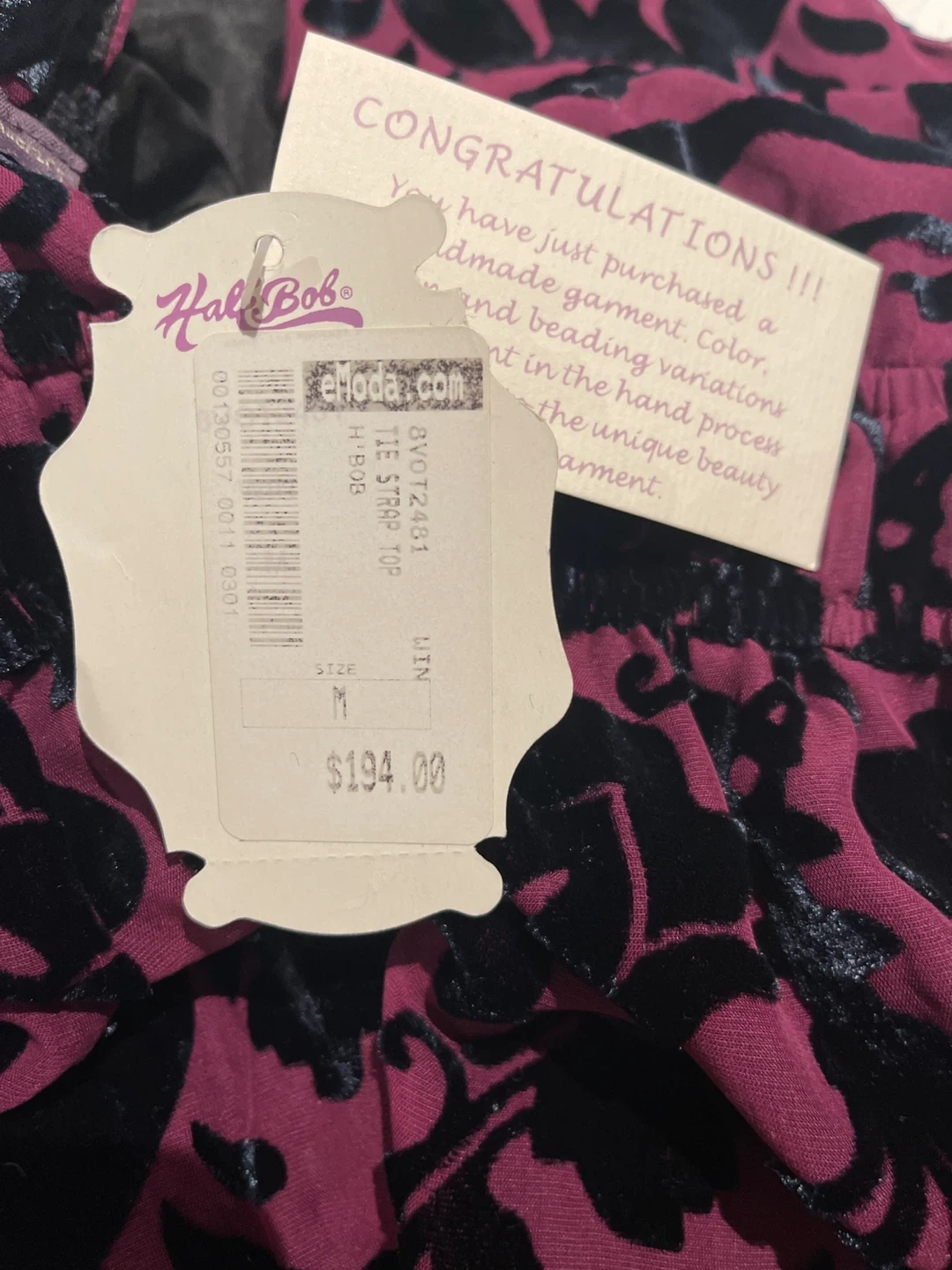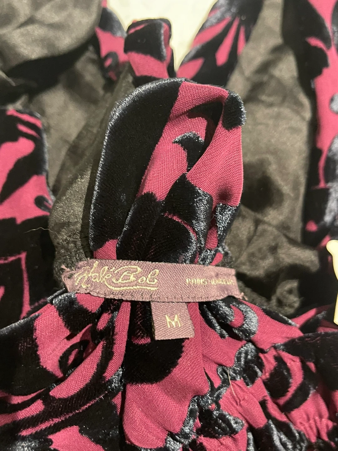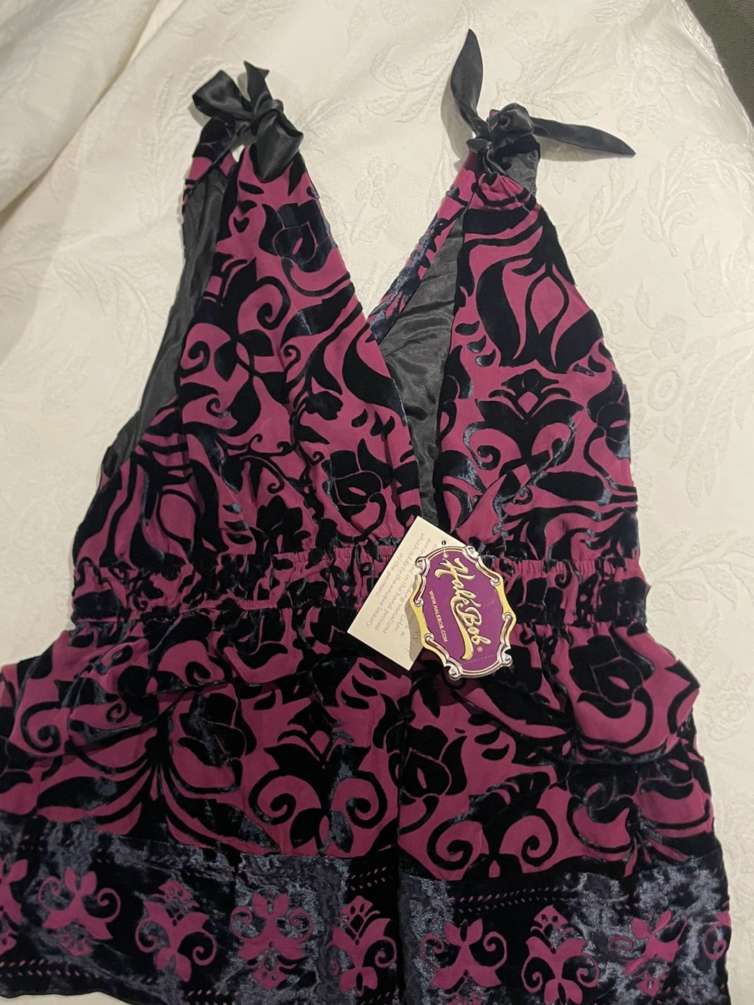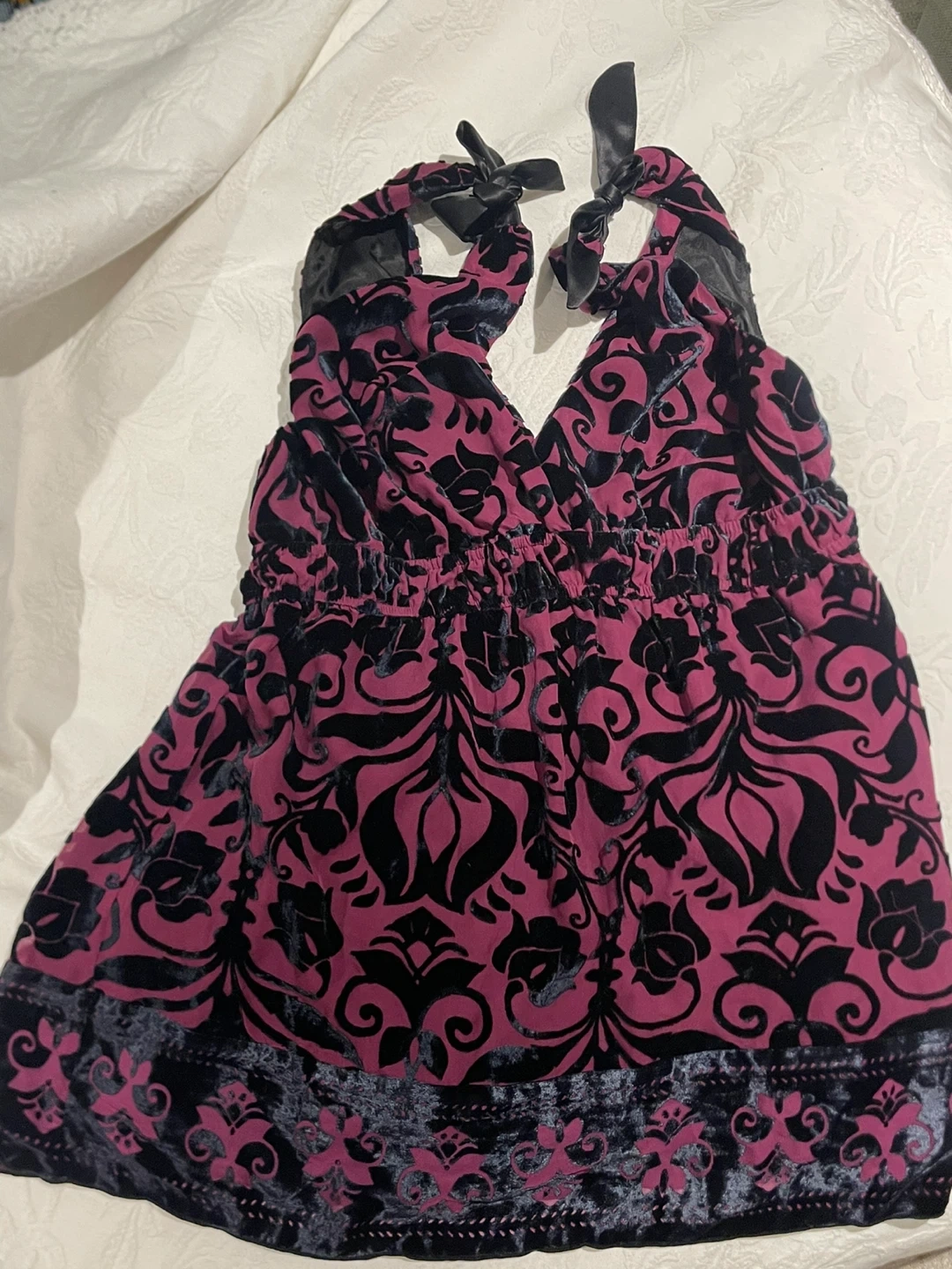 Selling a Hale Bob velvet halter top in size medium. The top is a beautiful magenta and black pattern, perfect for a night out or special occasion! It's in great condition and ready for a new home