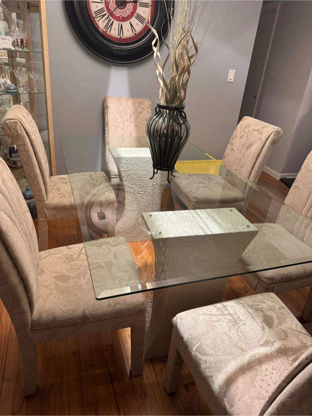 Selling a used glass top dining table with six chairs. The chairs have a patterned beige fabric. The table has a unique textured base. Perfect for a dining room or kitchen!