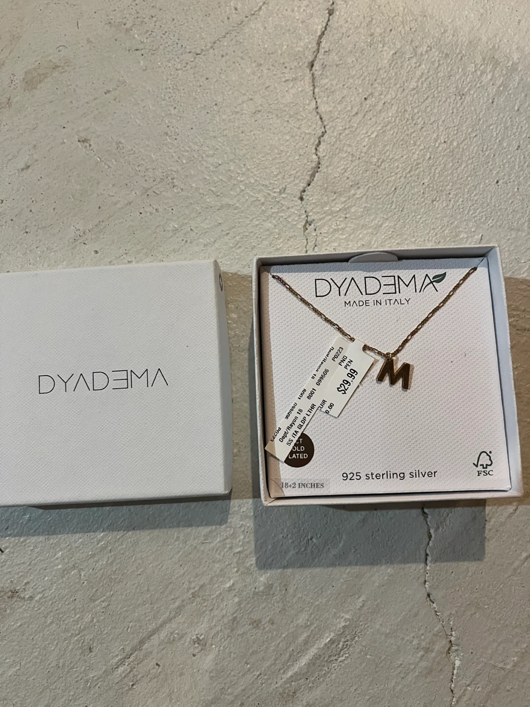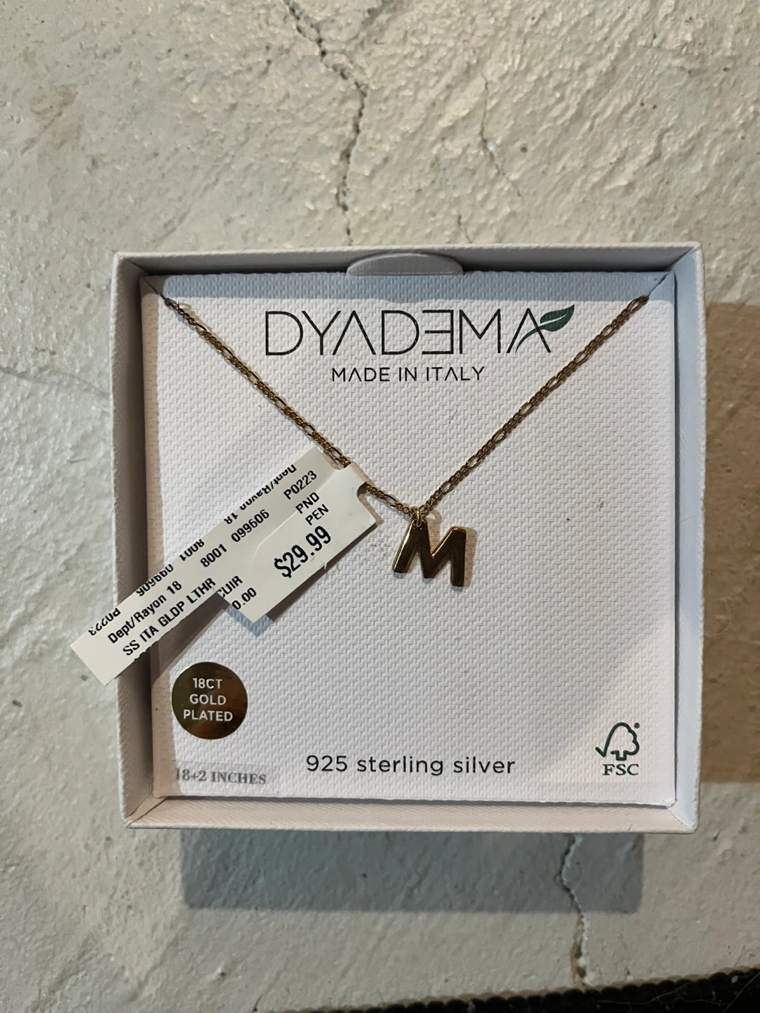 Selling a beautiful Dyadema necklace with an 'M' initial pendant. It's made of 925 sterling silver with 18ct gold plating. The chain length is 18+2 inches. Originally bought for $29.99, it comes with the box