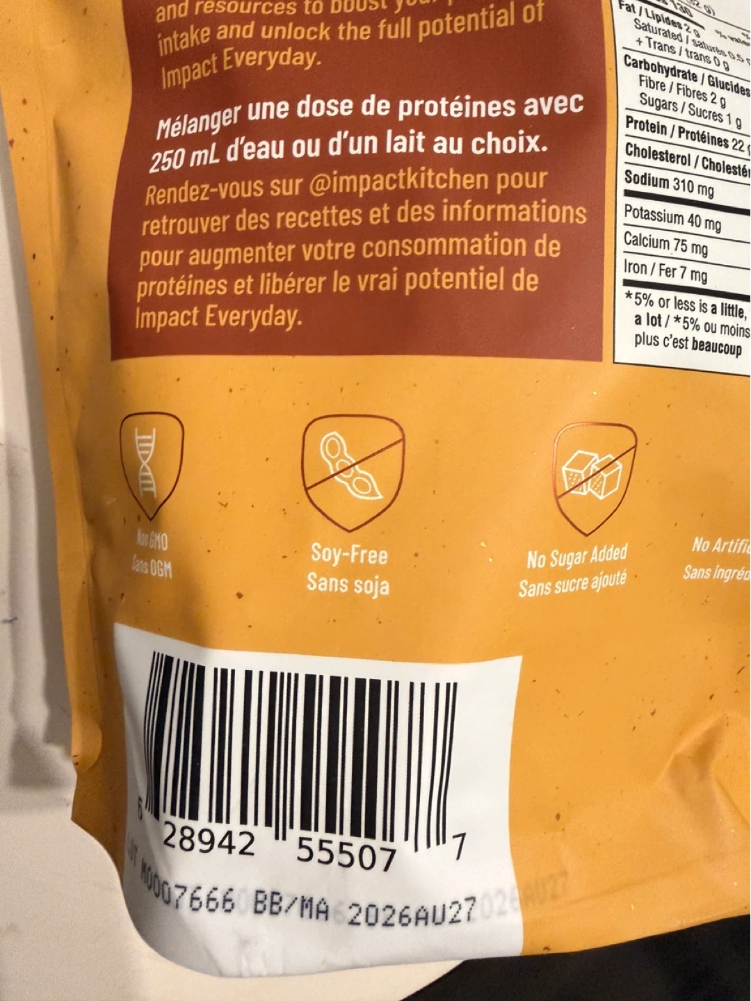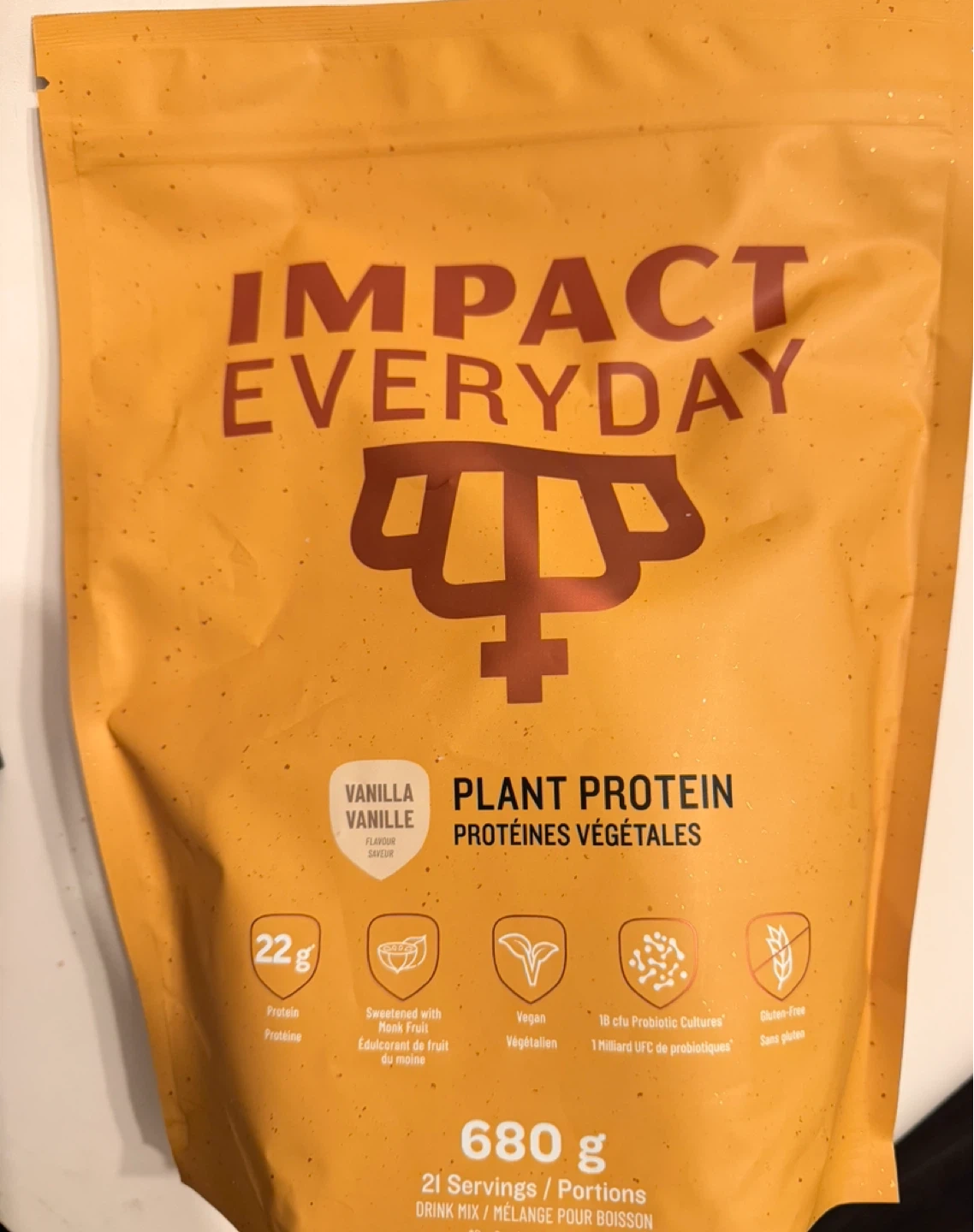 Selling a bag of Impact Everyday Vanilla Plant Protein. It's a vegan, gluten-free, and soy-free protein powder that's sweetened with fruit. Each bag contains 21 servings and is non-GMO and has no sugar added. The bag contains 680g of protein powder.