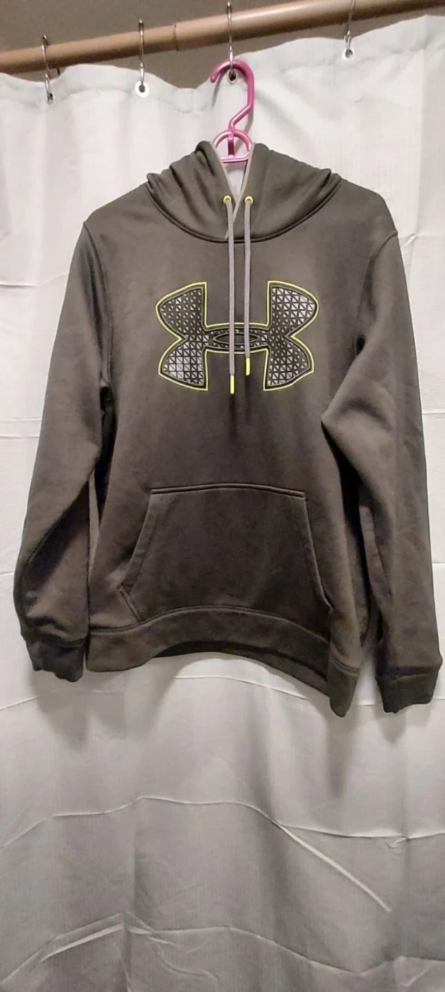 Selling a gray Under Armour hoodie. It features the Under Armour logo on the front and has a drawstring hood. Perfect for staying warm!