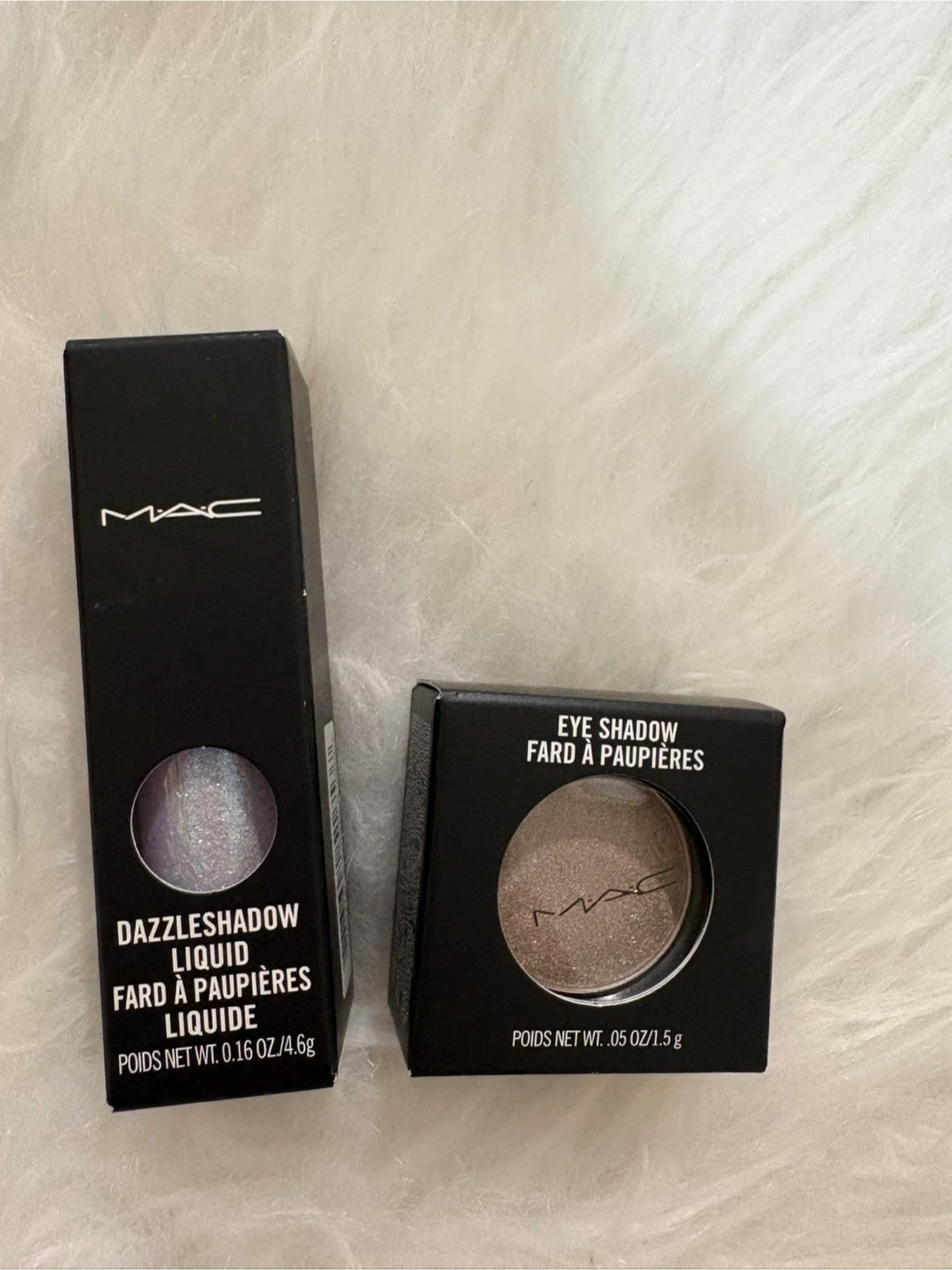 Selling MAC eyeshadow in Diamond Crumbles and L.E.S. Artiste Frost, along with a Dazzleshadow Liquid. The eyeshadows are .05 oz / 1.5 g each, and the Dazzleshadow Liquid is 0.16 oz / 4.5 g. All items come with their original boxes