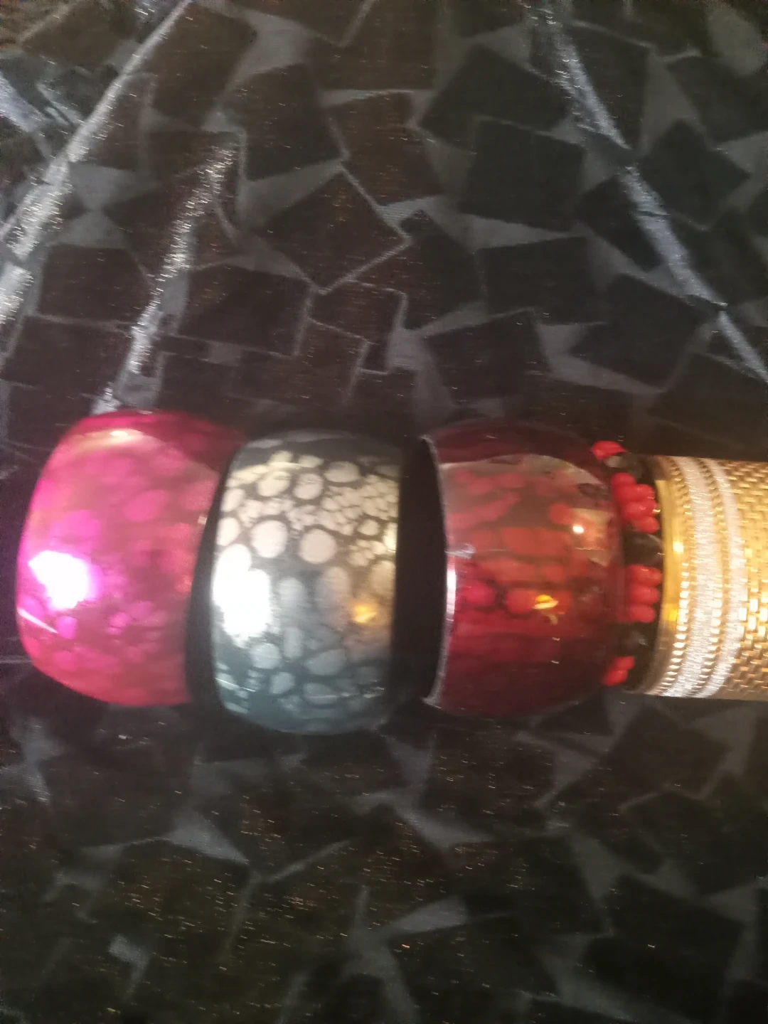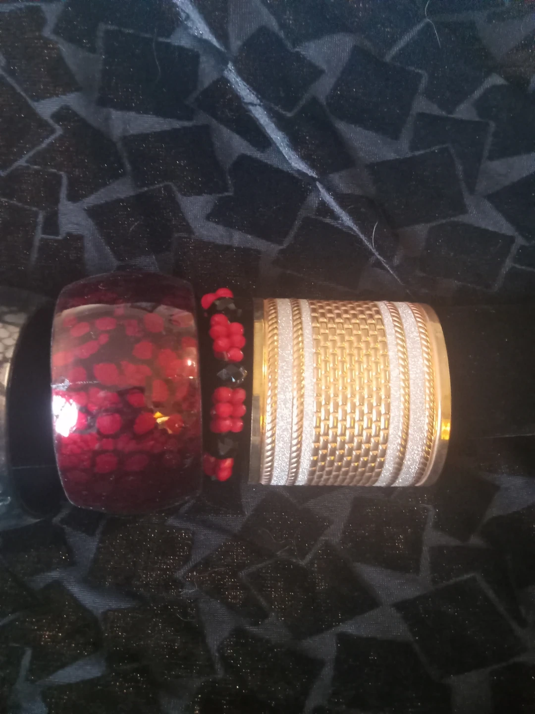 I'm selling a set of assorted fashion bangles. They come in various colours and designs, perfect for adding a pop to any outfit!